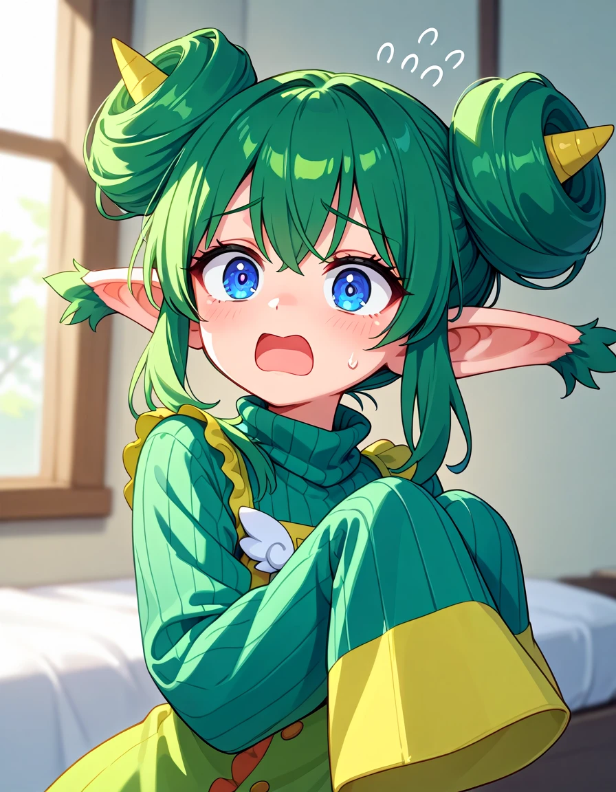 1girl, pointy ears, blue eyes, green hair, double bun,turtleneck,green dress,green sweater, sleeves past fingers, green footwear, wing ornament,