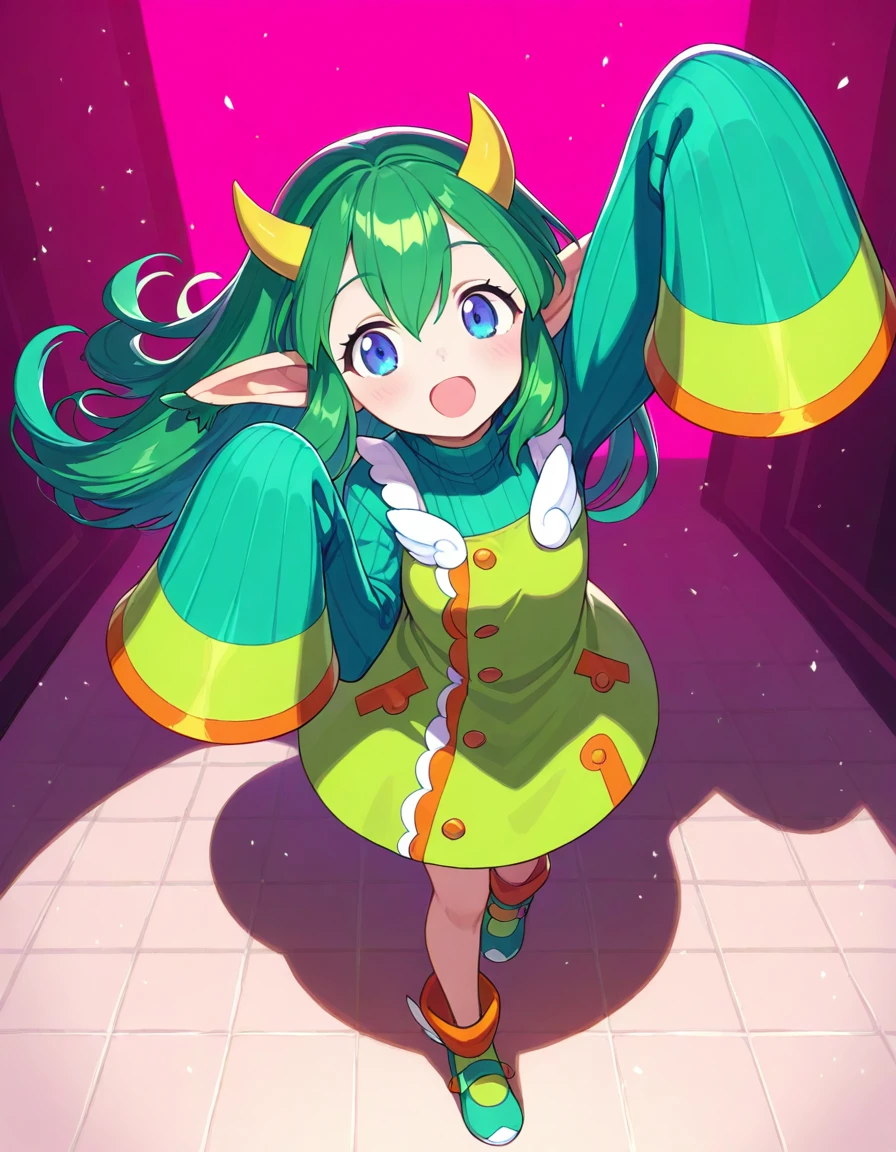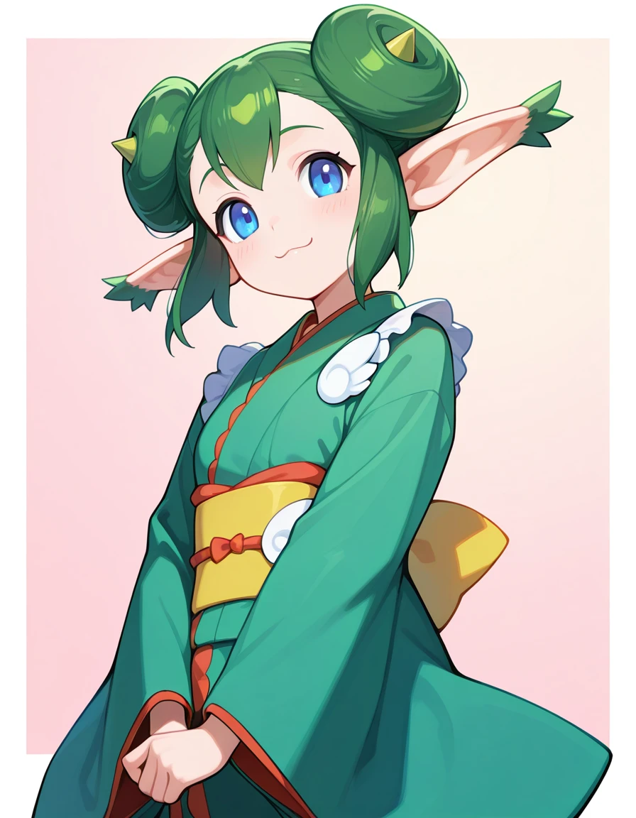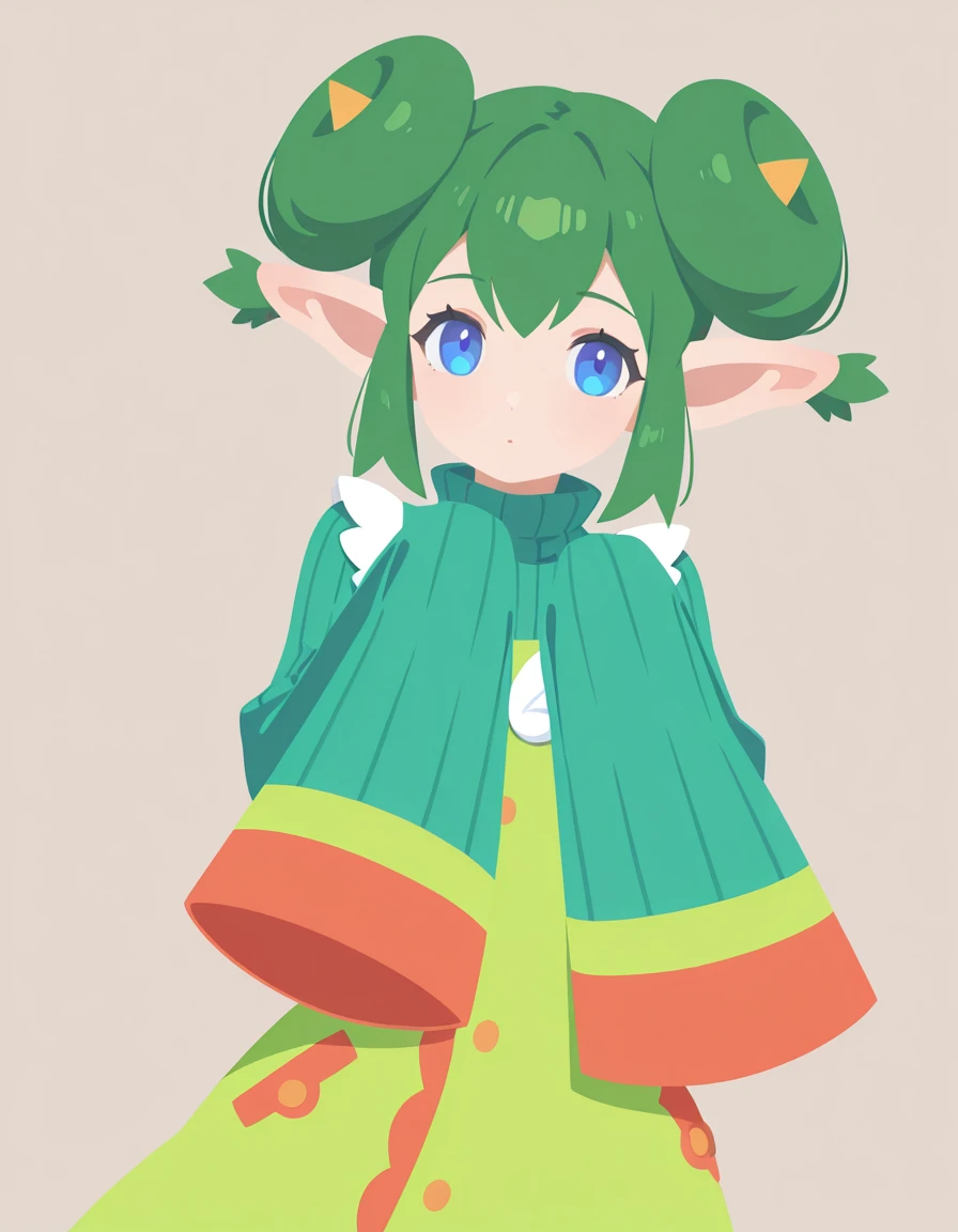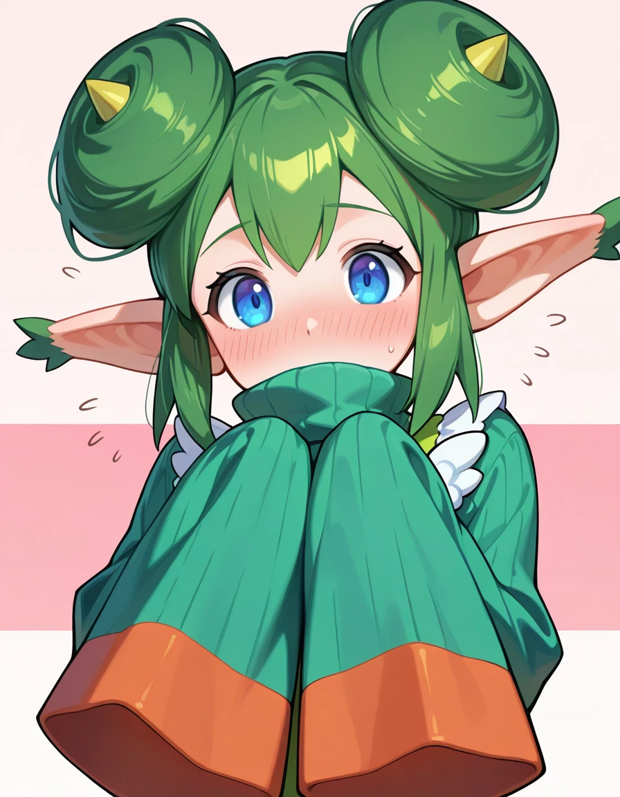 Recommended Prompts: 1girl, pointy ears, blue eyes, green hair, double bun,turtleneck,green dress,green sweater, sleeves past fingers, green footwear, wing ornament,
