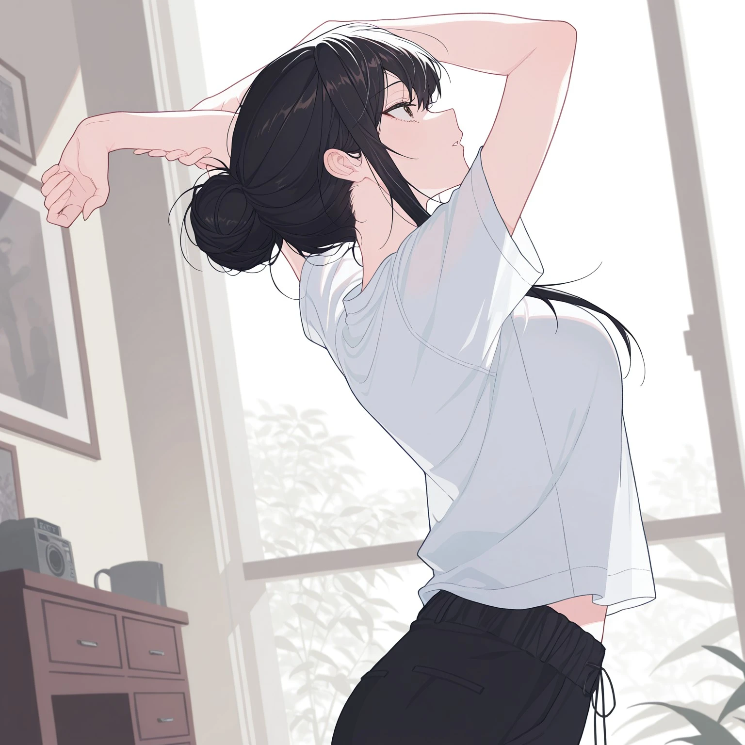 bun: miabn, shirt, pants, black pants, white shirt, short sleeves, hair bun