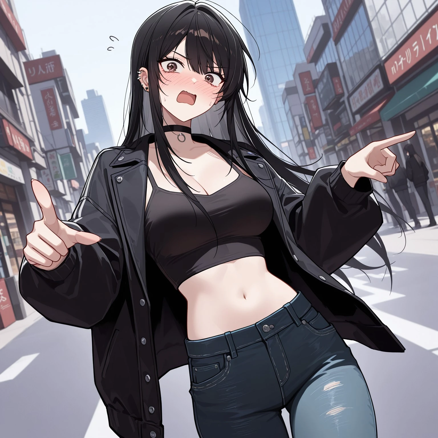 casual: mianv, crop top, jacket, open jacket, long sleeves, black crop top, ear piercing, black jacket, denim, pants, navel, choker, black choker, midriff,