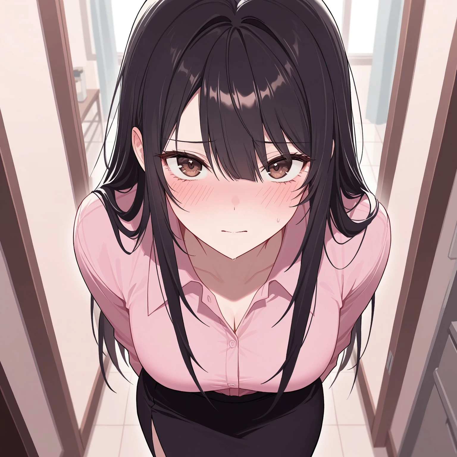 pink: miapn, shirt, pink shirt, skirt, black skirt, cleavage
