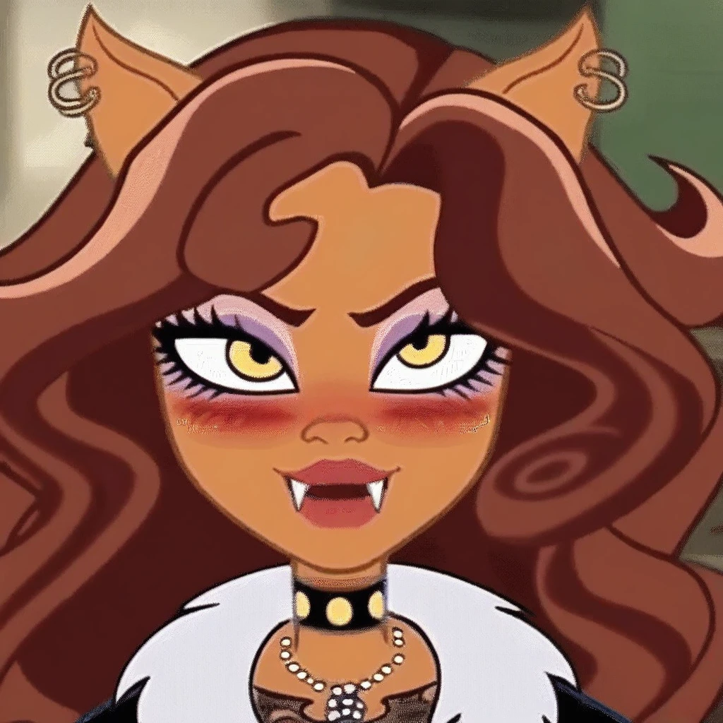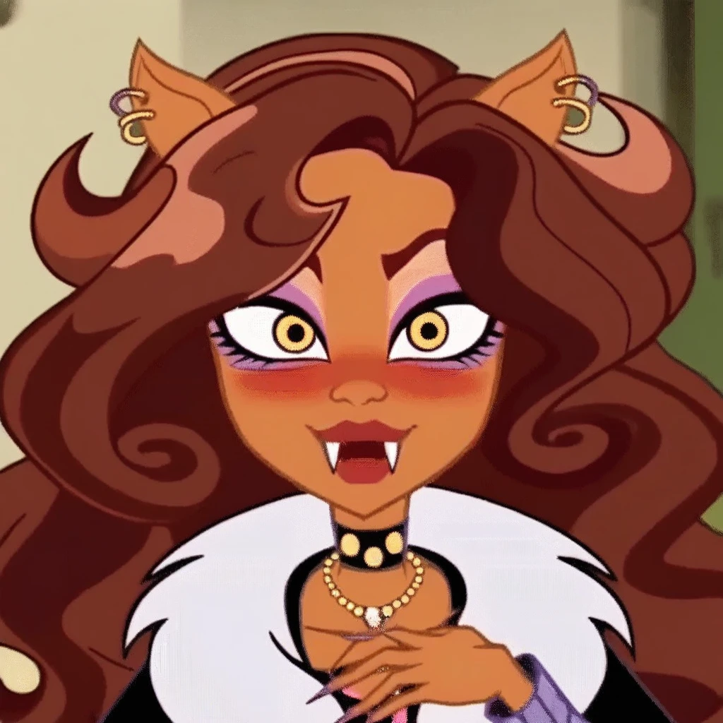 Clawdwolf, Clawdeen wolf, Monster high, 1girl, Werewolf, Yellow eyes, Long hair, Brown hair, Anthropomorphization, Collar, Makeup, Necklace, Piercing, Dark skin, Fangs, Tan body, Pink eyeshadow, Pink nails,