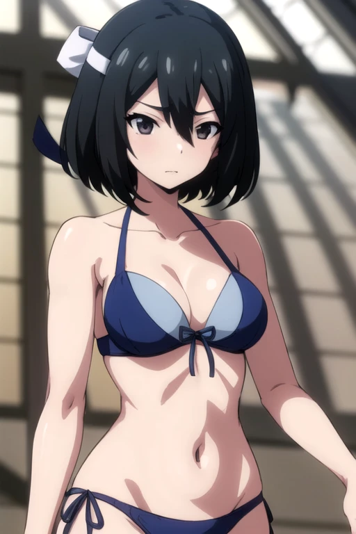 SayaKogatana, 1girl, solo, short hair, black hair, navel, cleavage, hair between eyes, medium breasts, blue bikini, black eyes, white headband,