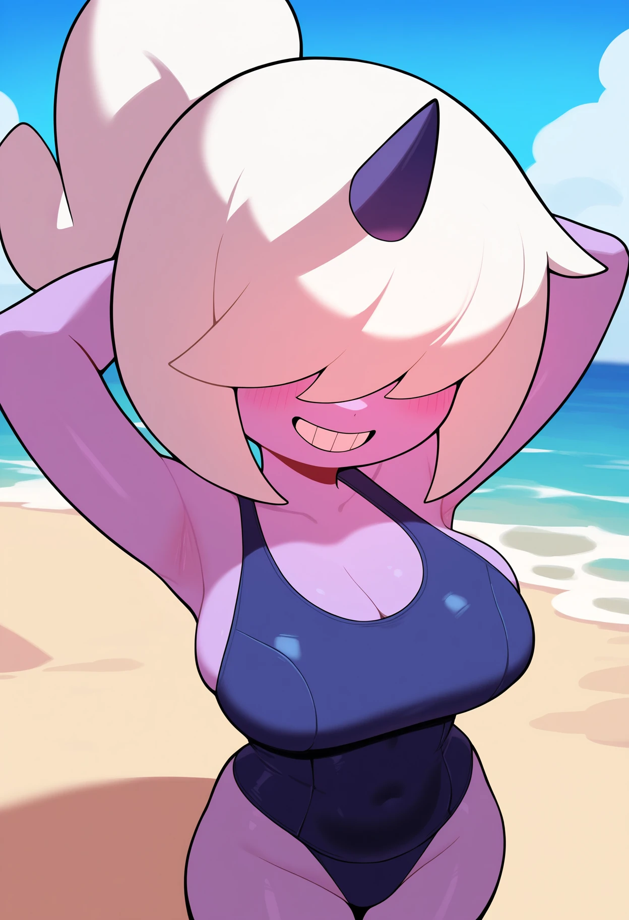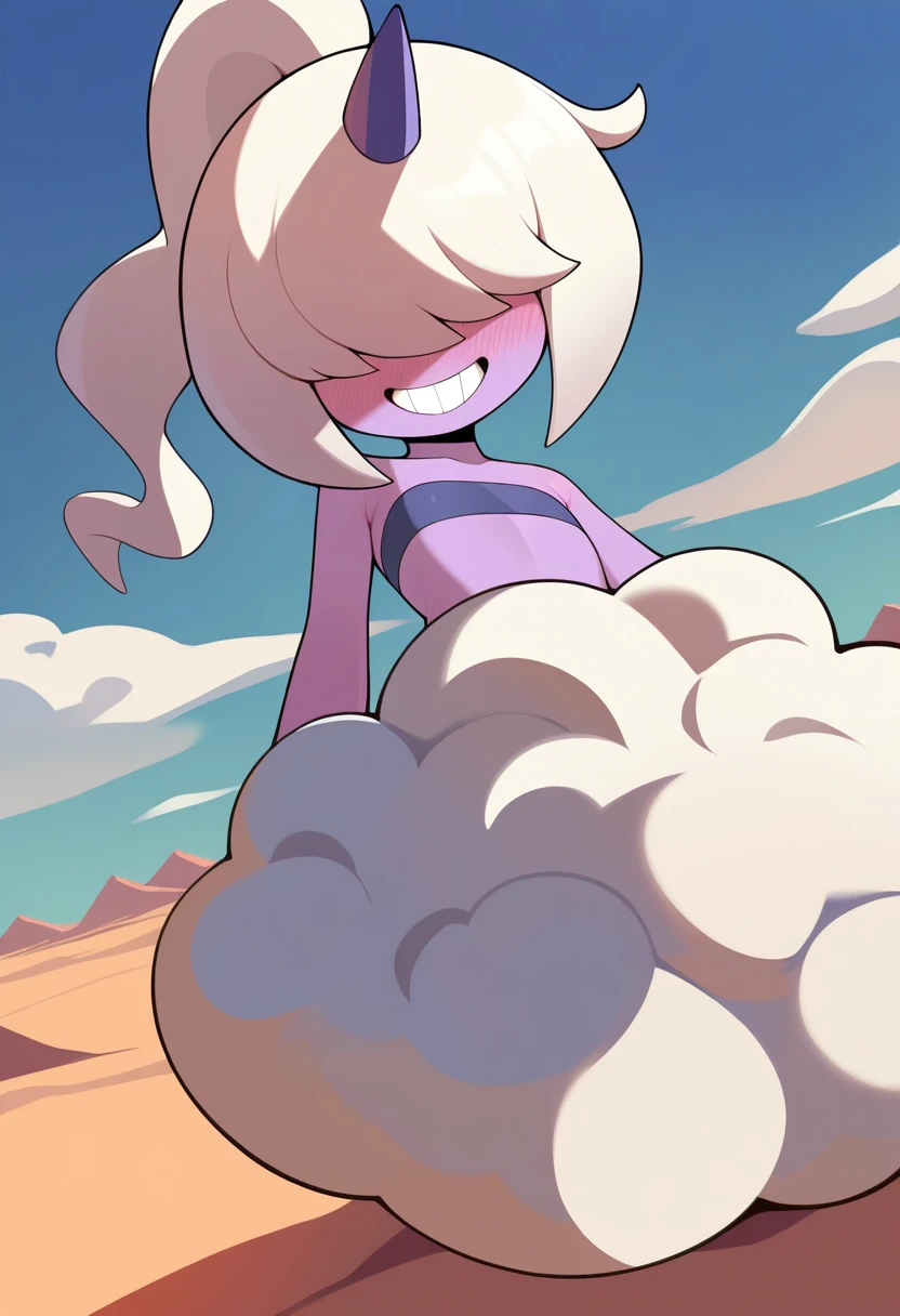 1girl, dazzi, white hair, ponytail, hair over eyes, single horn, purple skin, grin, teeth, cloud