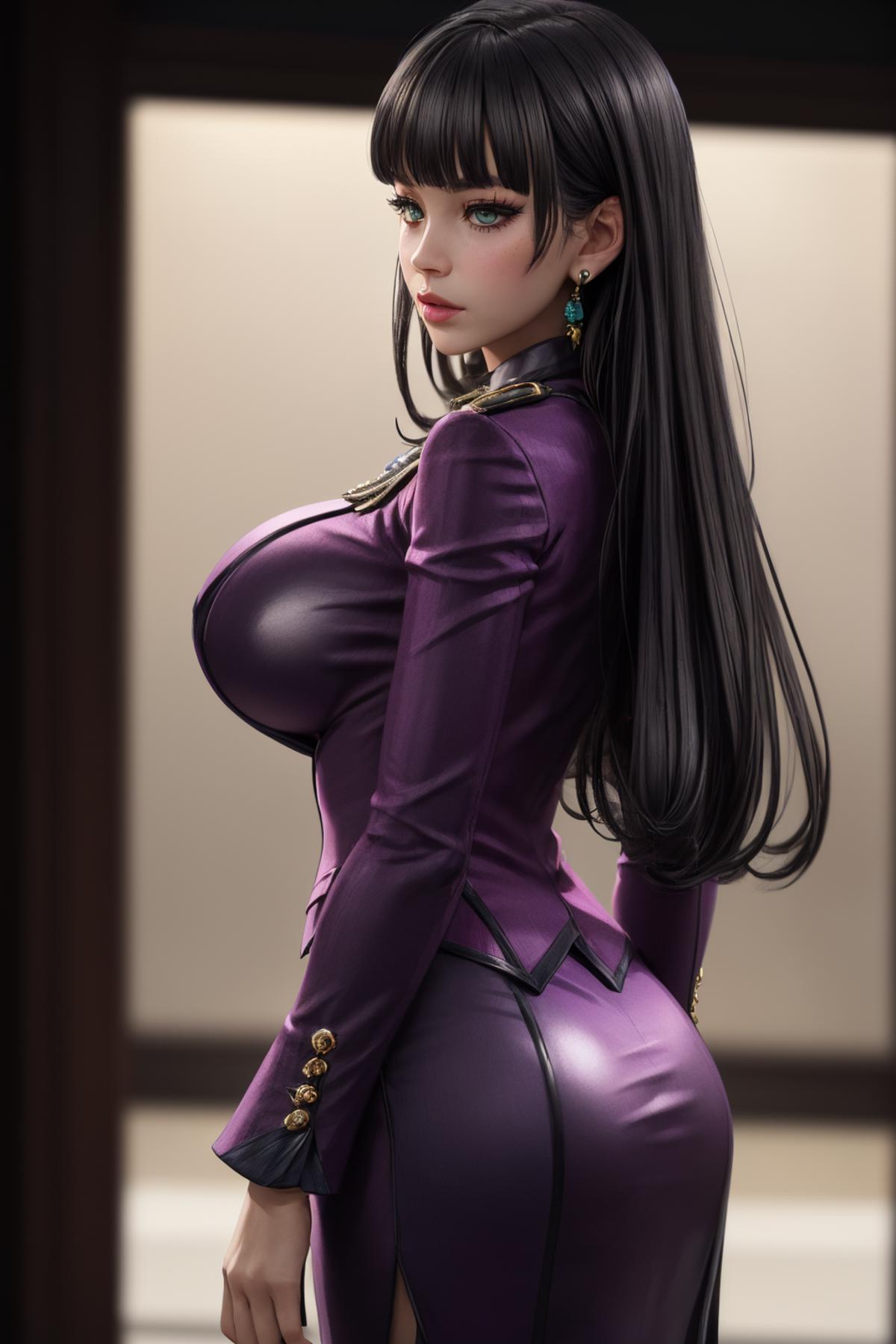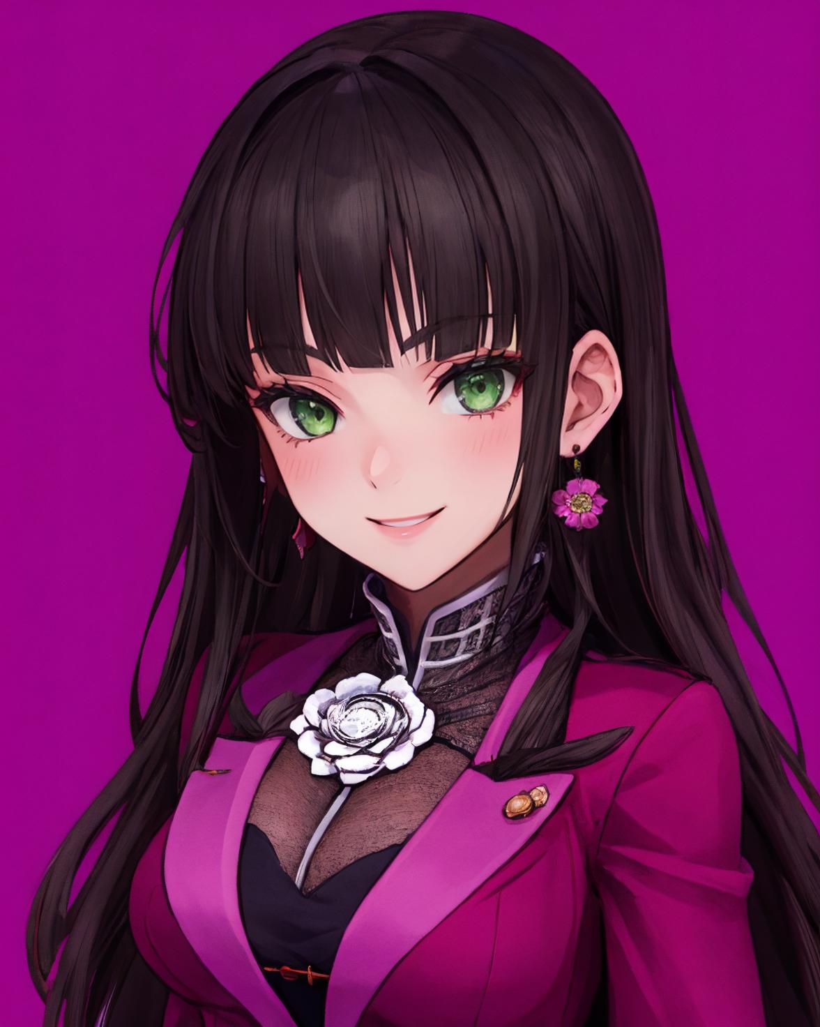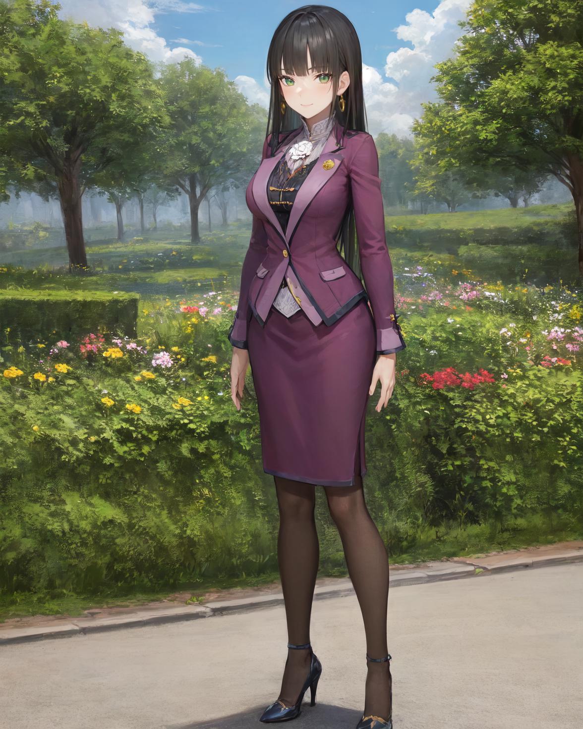 jewelry, earrings, flower ornament, purple suit, purple skirt, black undershirt, black pantyhose, black high heels,Description