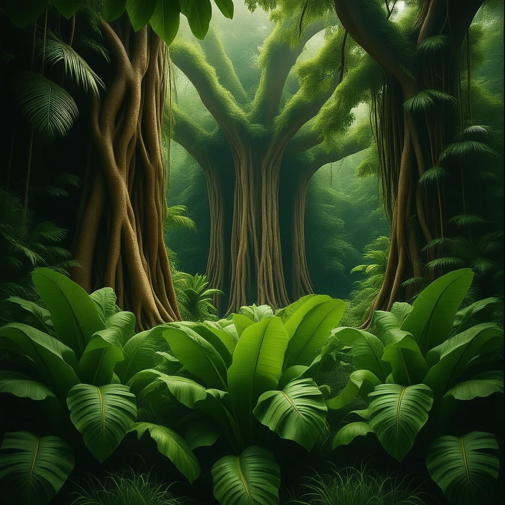 Dreamvision Jungle Style immerses you in a hyper-realistic, dreamlike tropical rainforest bursting with life and mystery. Towering ancient trees with massive aerial roots and thick hanging vines dominate the scene, surrounded by lush layers of broad banana leaves, ferns, palm fronds, and dense green undergrowth. Sunlight filters through the thick canopy in dramatic golden god rays and volumetric beams, creating a warm, ethereal glow that dances across moss-covered rocks, small crystal-clear streams, misty air, and dew-kissed foliage. The atmosphere is humid, vibrant, and almost otherworldly — blending cinematic realism with a subtle dream haze that makes every leaf and root feel alive and timeless.