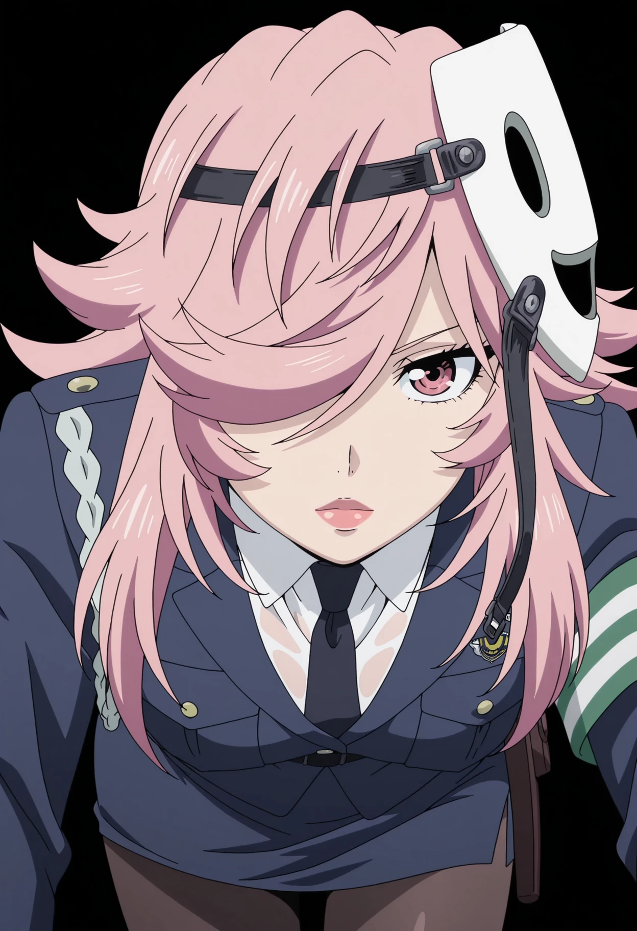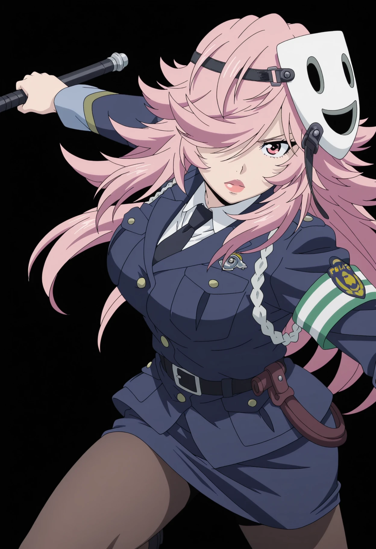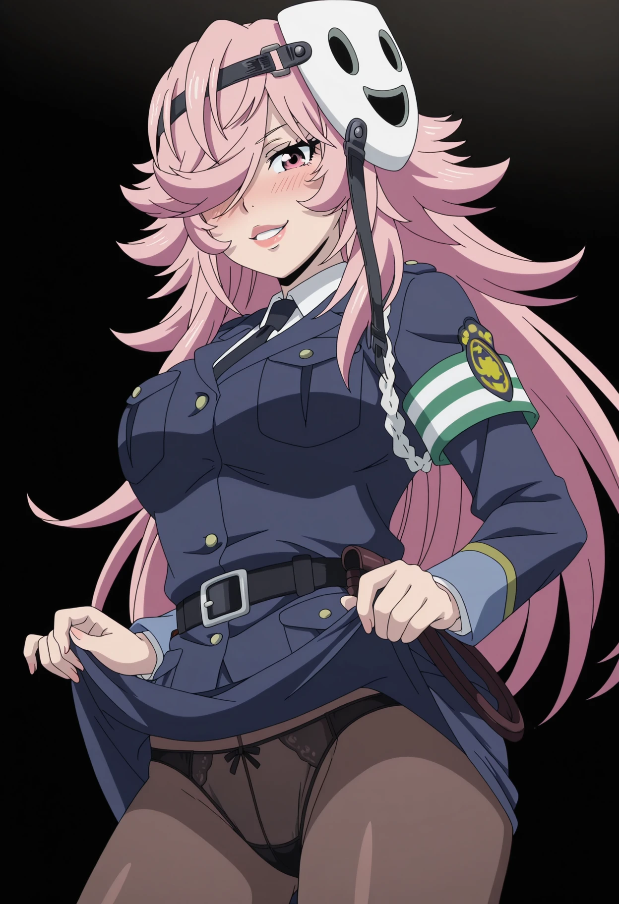 police uniform, shirt, black necktie, mask, mask on head, policewoman, collared shirt, skirt, black pantyhose, see-through clothes
