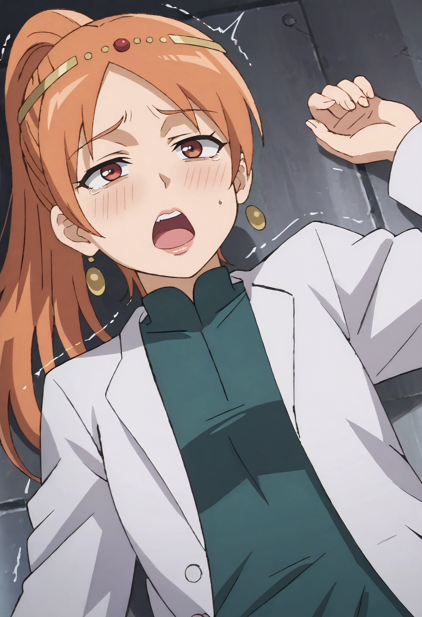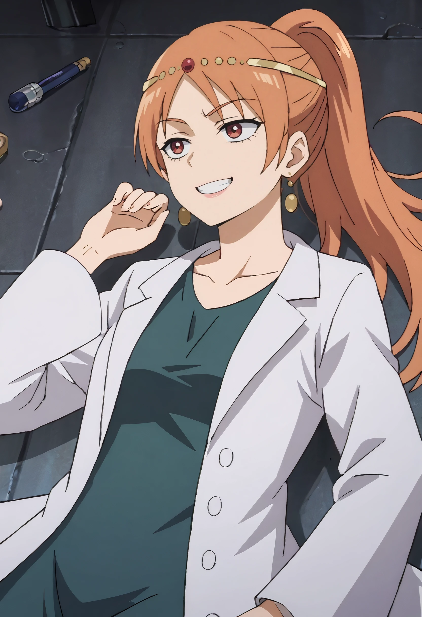 PBBWizCoat, earrings, jewelry, shirt, jacket, long sleeves, coat, hair ornament, circlet, lab coat, white coat, green shirt, open clothes, pearl earrings, open coat,