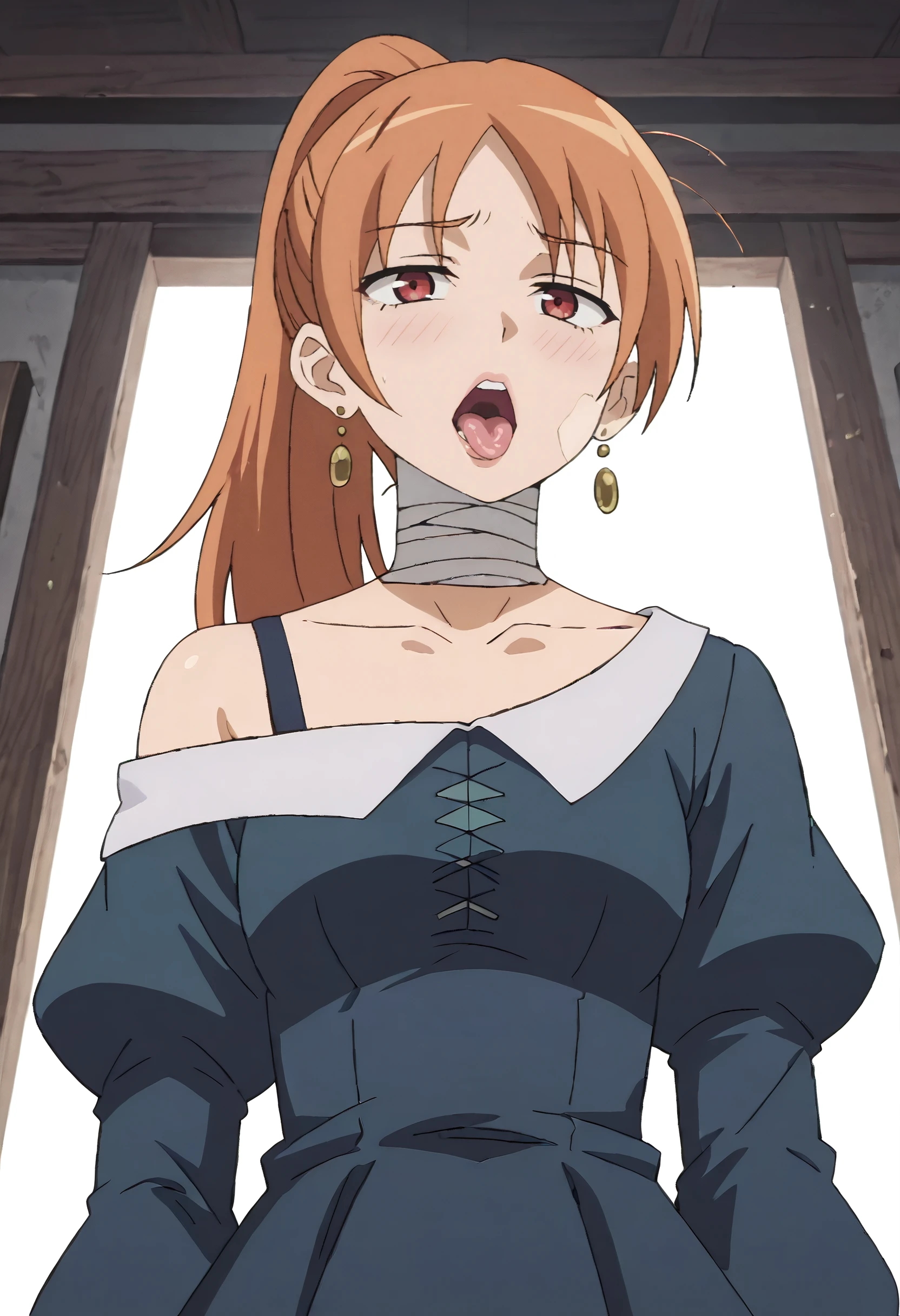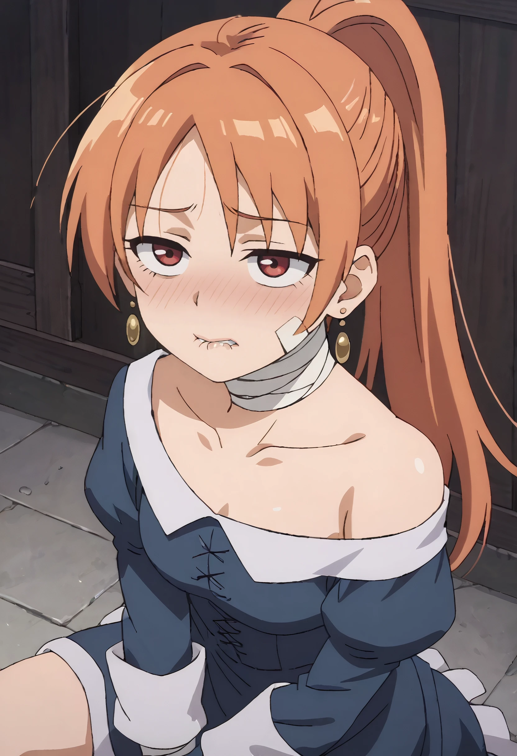 PBBWizDress, bandages, earrings, jewelry, bandaged neck, bandaid, long sleeves, dress, puffy sleeves, off shoulder, bandaid on face, juliet sleeves, blue shirt, shirt,