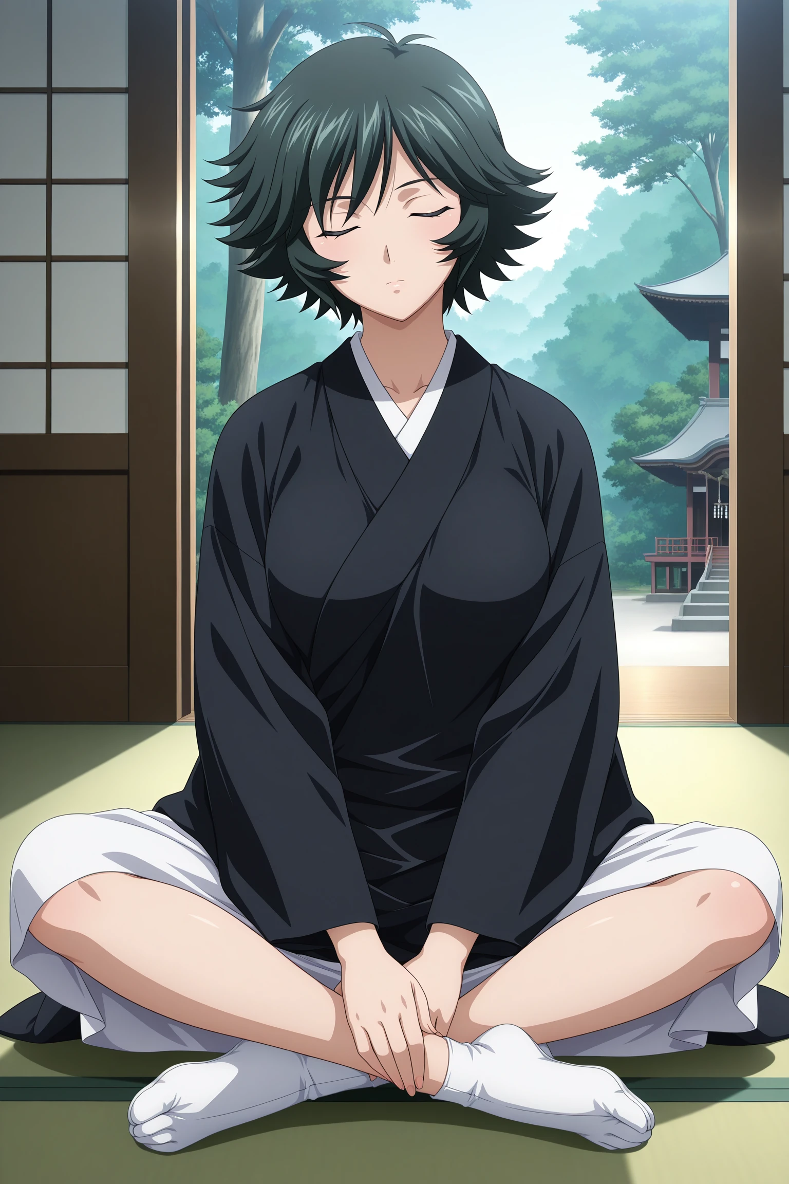 gakushin bunken, short hair, black hair, wispy bangs, grey eyes, long sleeves, wide sleeves, black kimono, white skirt, white socks, tabi, brown footwear, okoboOPTIONAL WORDS