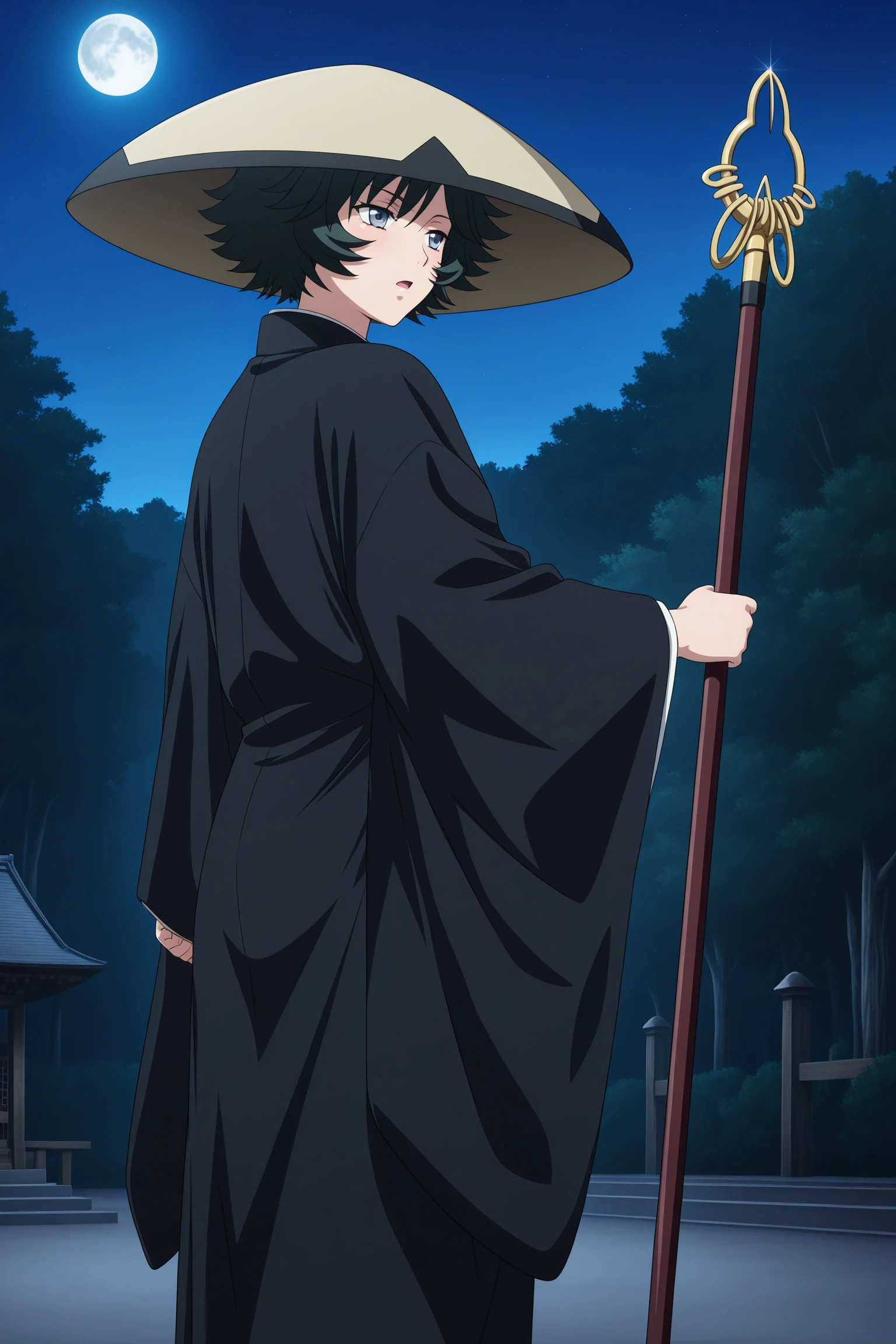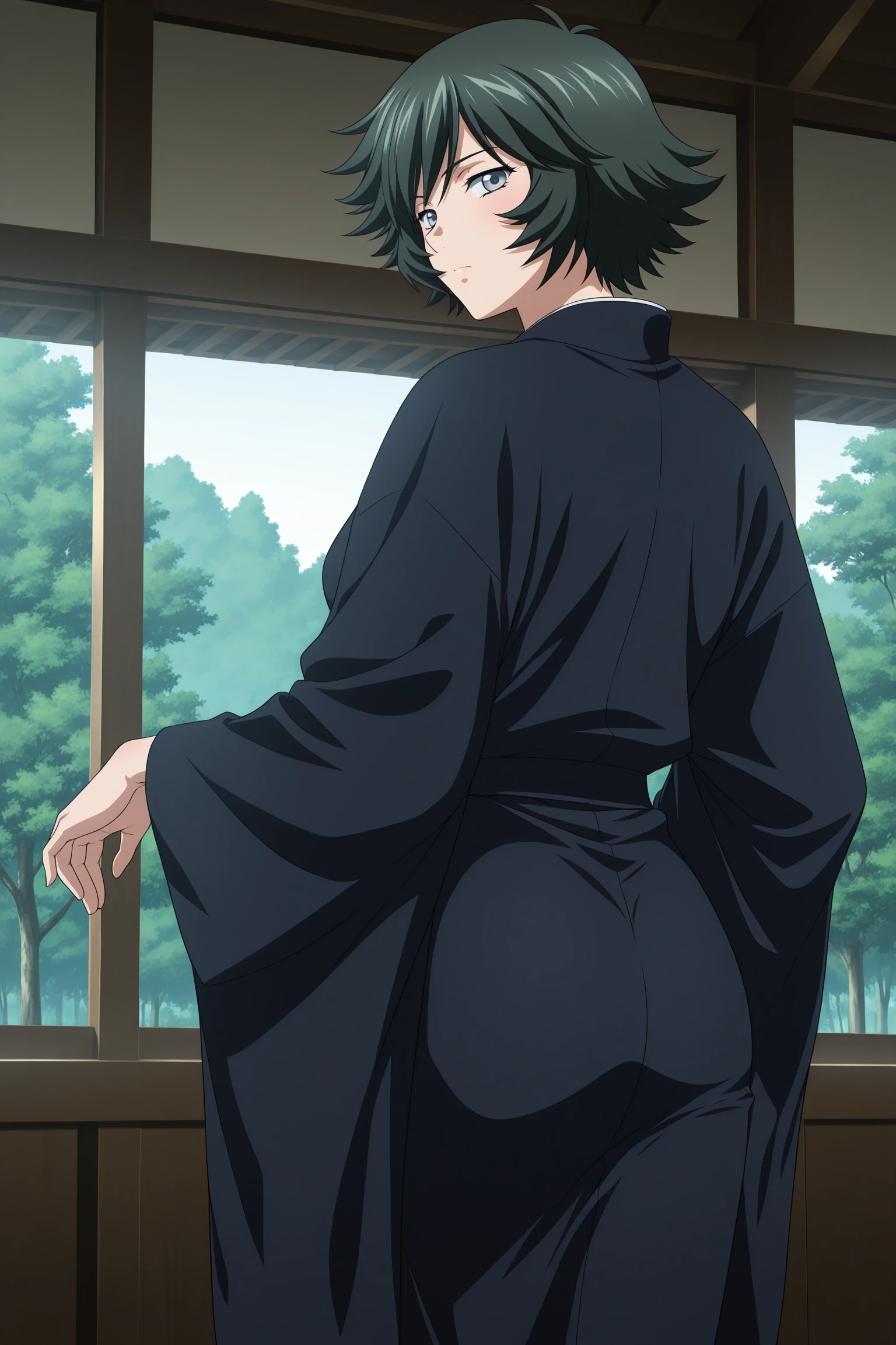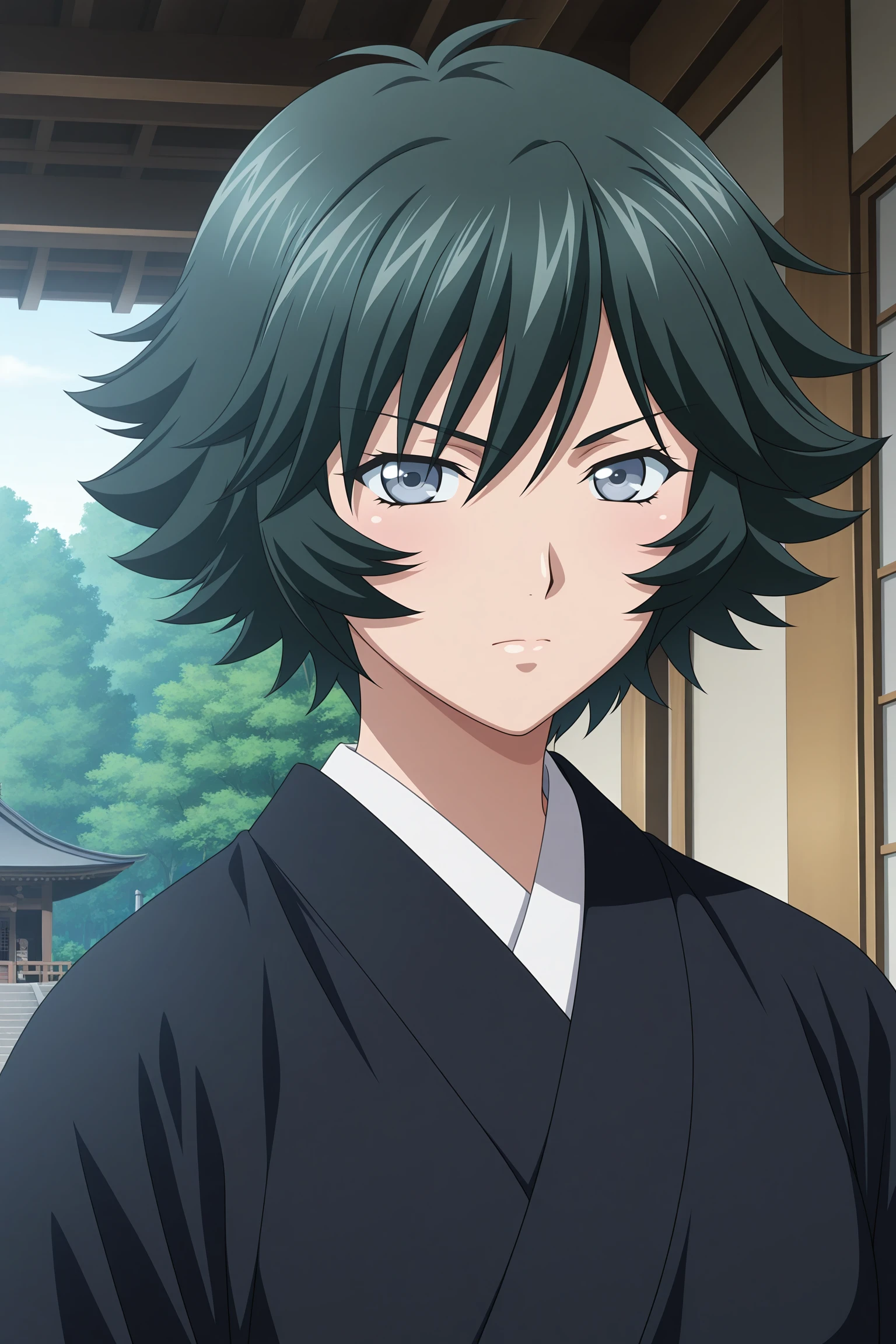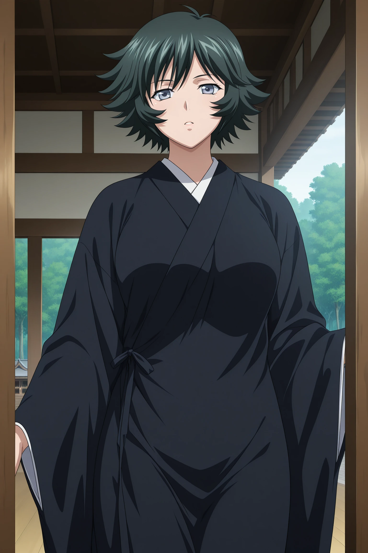 gakushin bunken, short hair, black hair, wispy bangs, grey eyes, long sleeves, wide sleeves, black kimono, white skirt, white socks, tabi, brown footwear, okobo