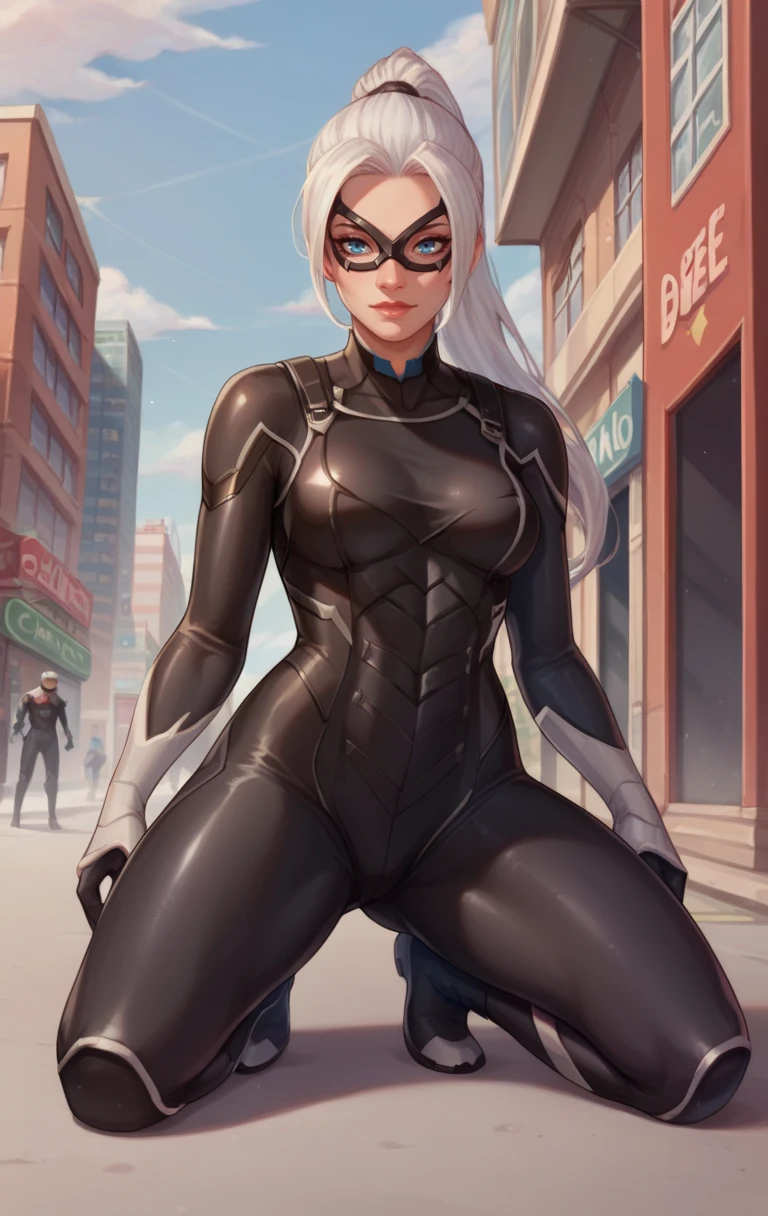 BlackCatMarlo,1girl,long hair,blue eyes,ponytail,white hair,thighs,bodysuit,mask,skin tight,black bodysuit,superhero,domino mask