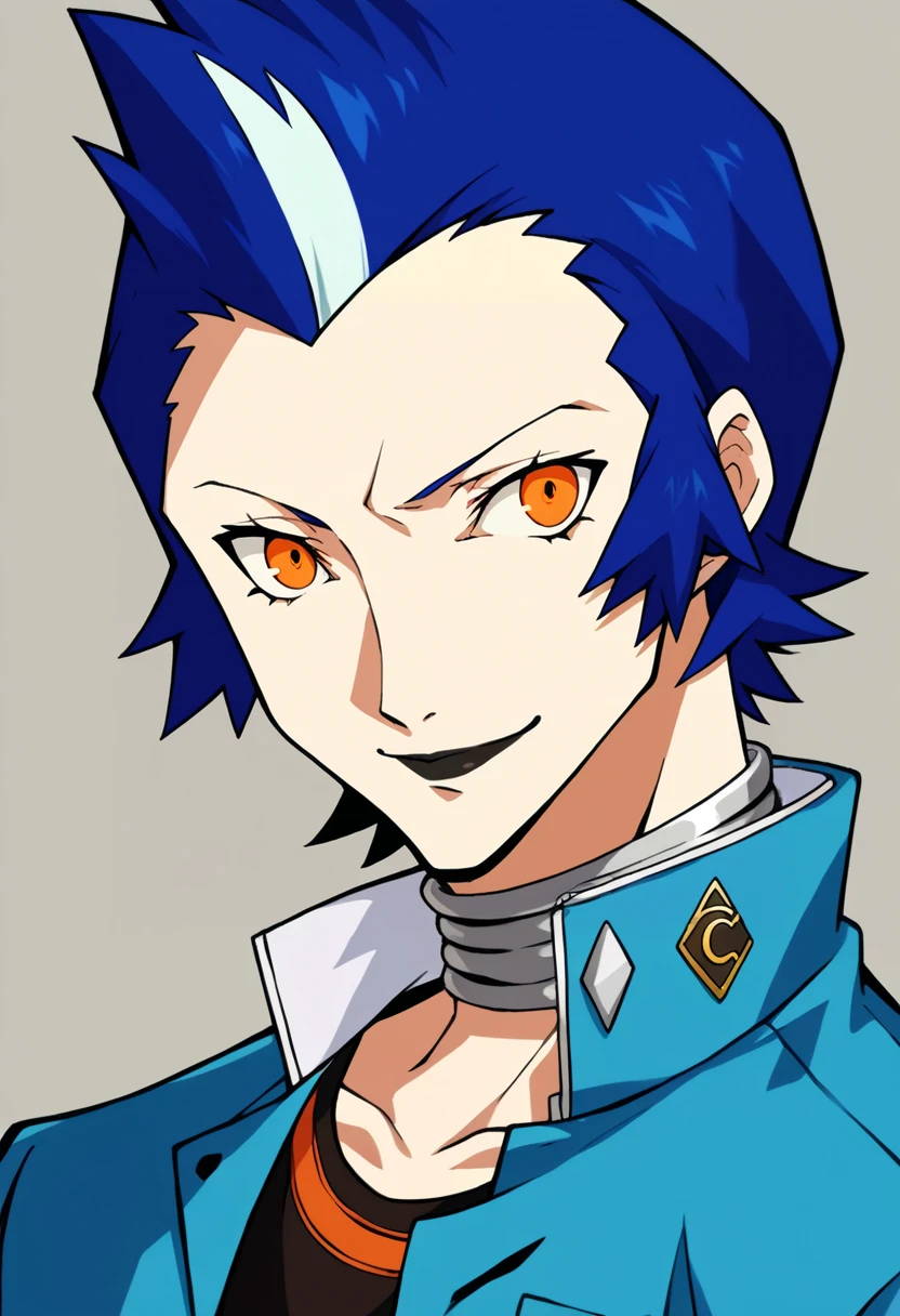 eikichi, short hair, orange eyes, blue hair, white hair, multicolored hair, pale skin, black lips, choker