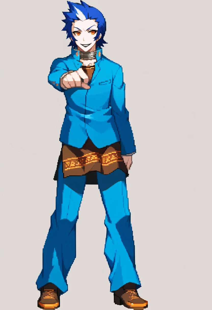 Tags are "short hair, orange eyes, blue hair, white hair, multicolored hair, pale skin, black lips, choker, school uniform, blue jacket, black shirt, blue pants, armband"