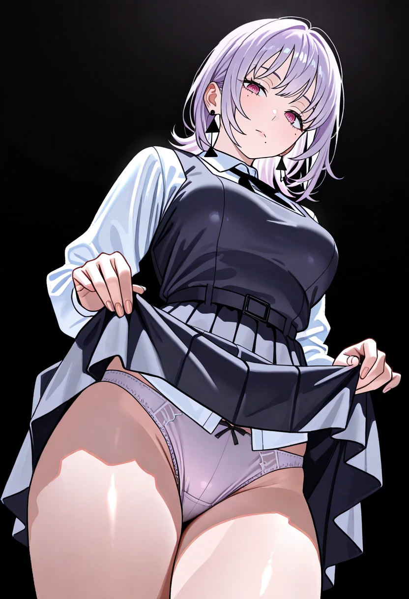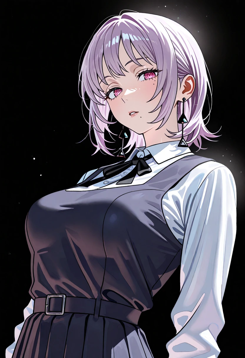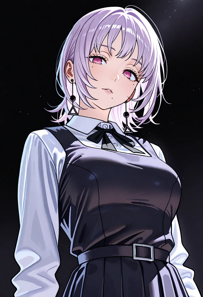 lildcsm,pale purple hair,pink eyes,ringed eyes,medium hair,mole under eye,mole under mouth,triangle earrings