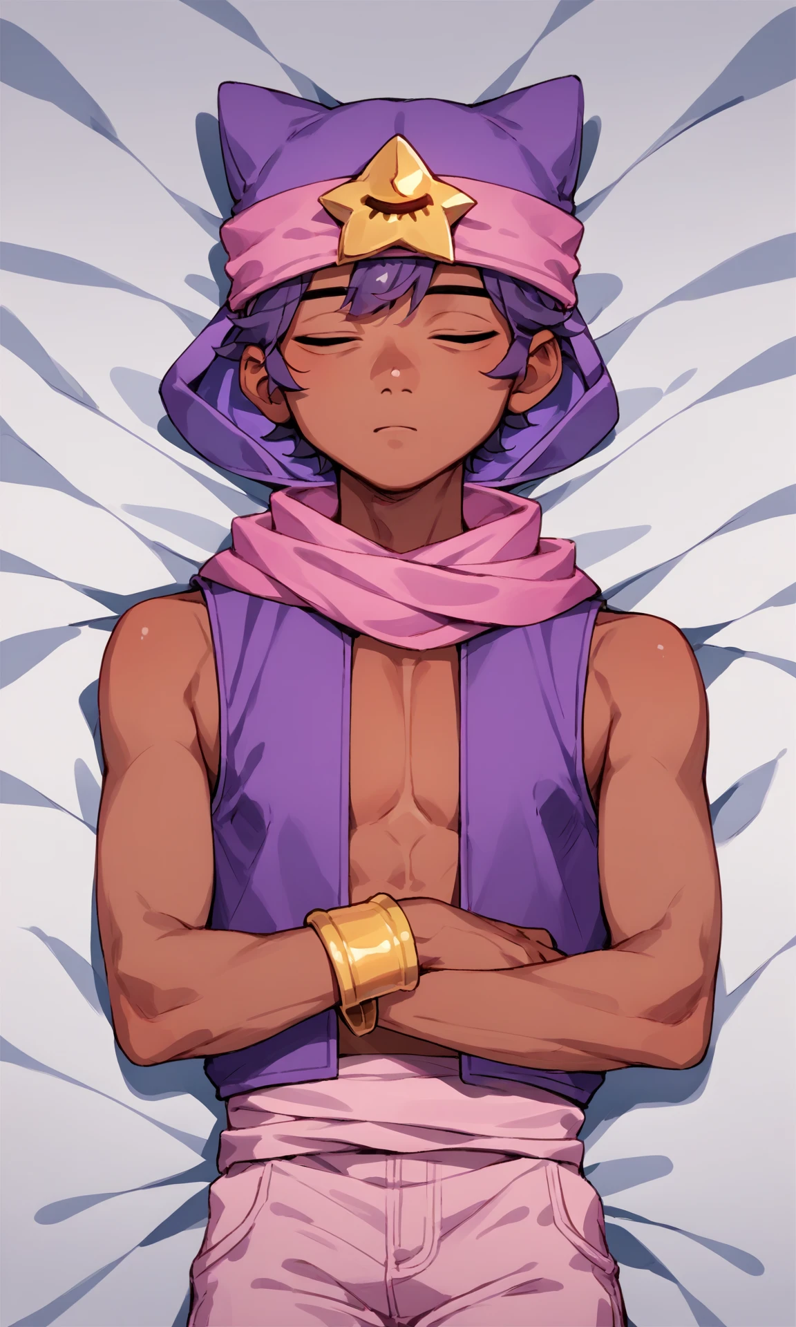 sandyBS, male focus, purple hair, short hair, dark skin, purple headwear, pink headband, hood up, pink scarf, vest, sleeveless, bracelet, pink pants, pointy footwear, purple footwear