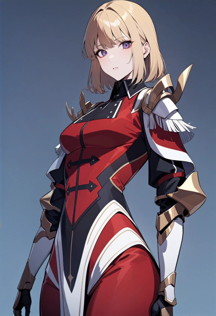 red armor, black collar, shoulder armor, long sleeves, gauntlets, white pelvic curtain, red leggings