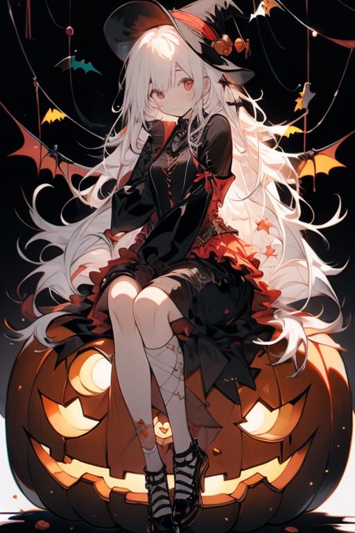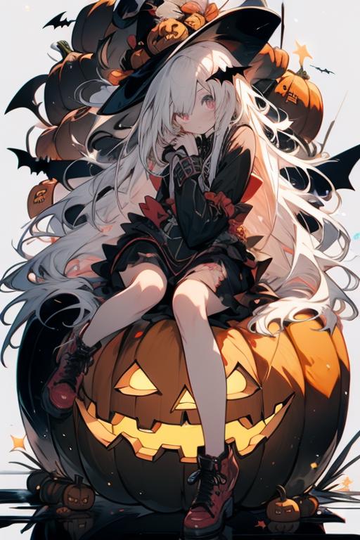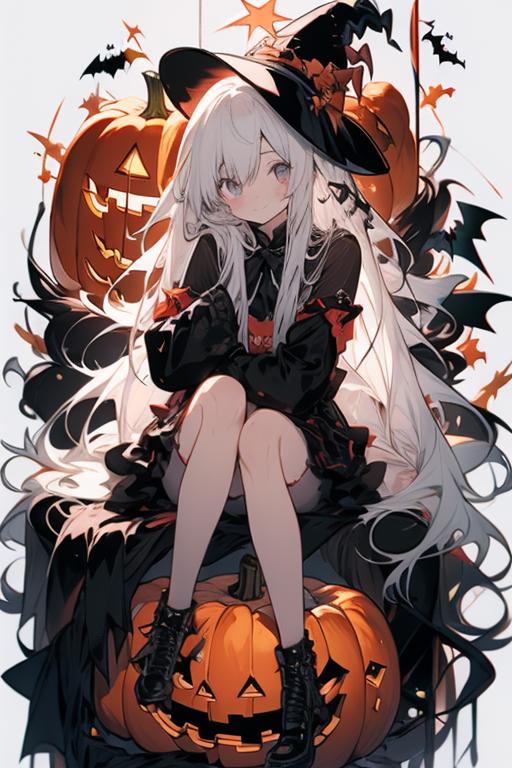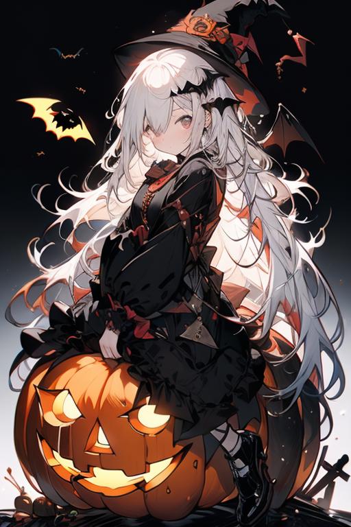 1girl,halloween costume,bat,Glowing Pumpkin,long hair, white hair, yellow eyes, Witch Hat