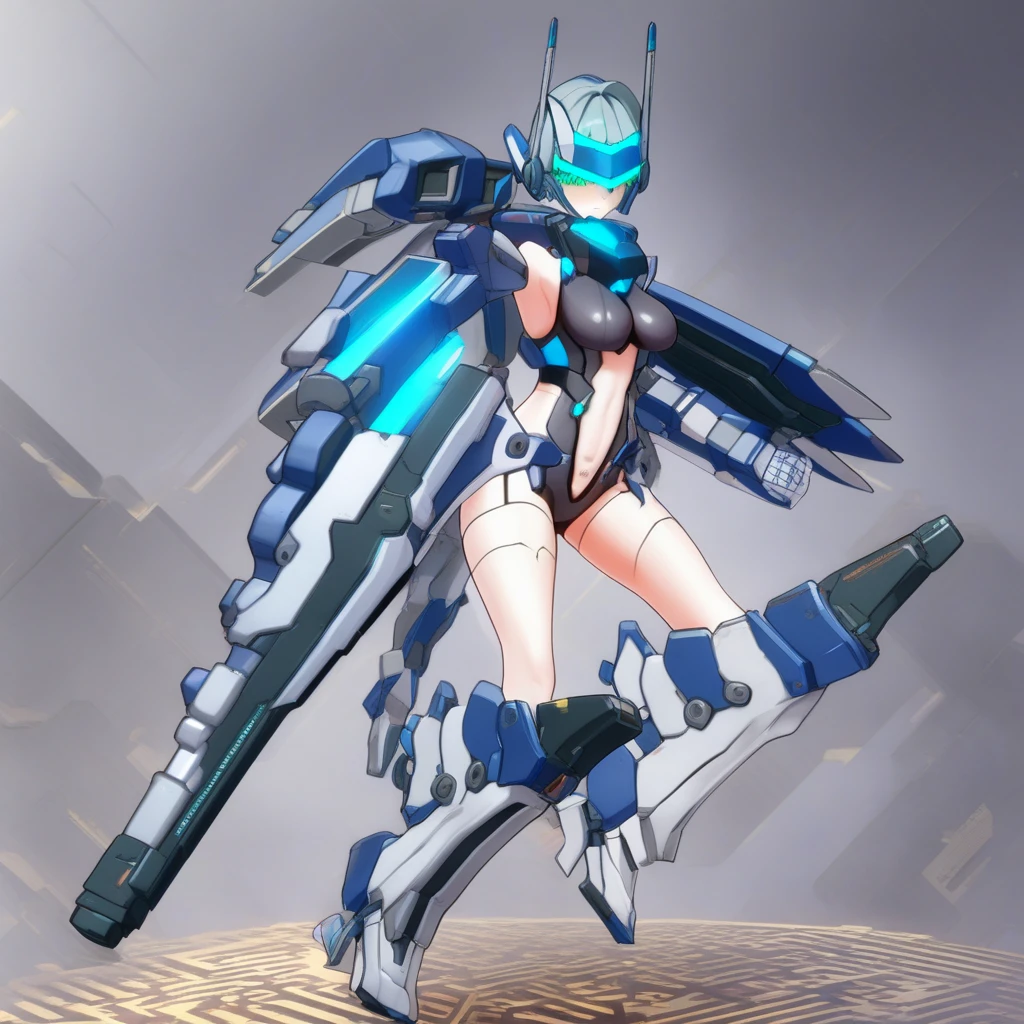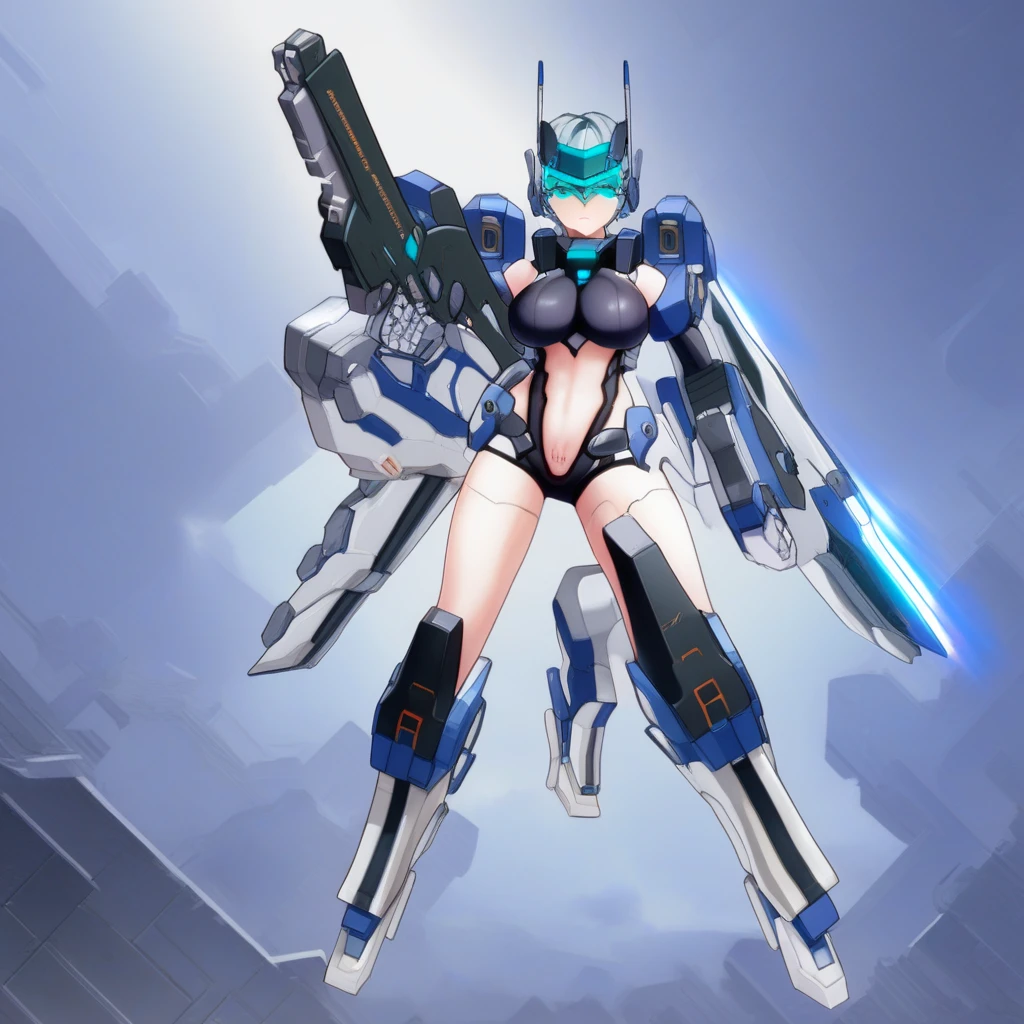 Thunderbolt · Otome,mecha musume,navel,stomach cutout,large breasts,leotard,long ponytail hair style,navel cutout,blue eyes,short hair,thrusters,headgear,cyan hair,gloves,clothing cutout,science fiction,green eyes,sideboob,barcode,barcode on belly