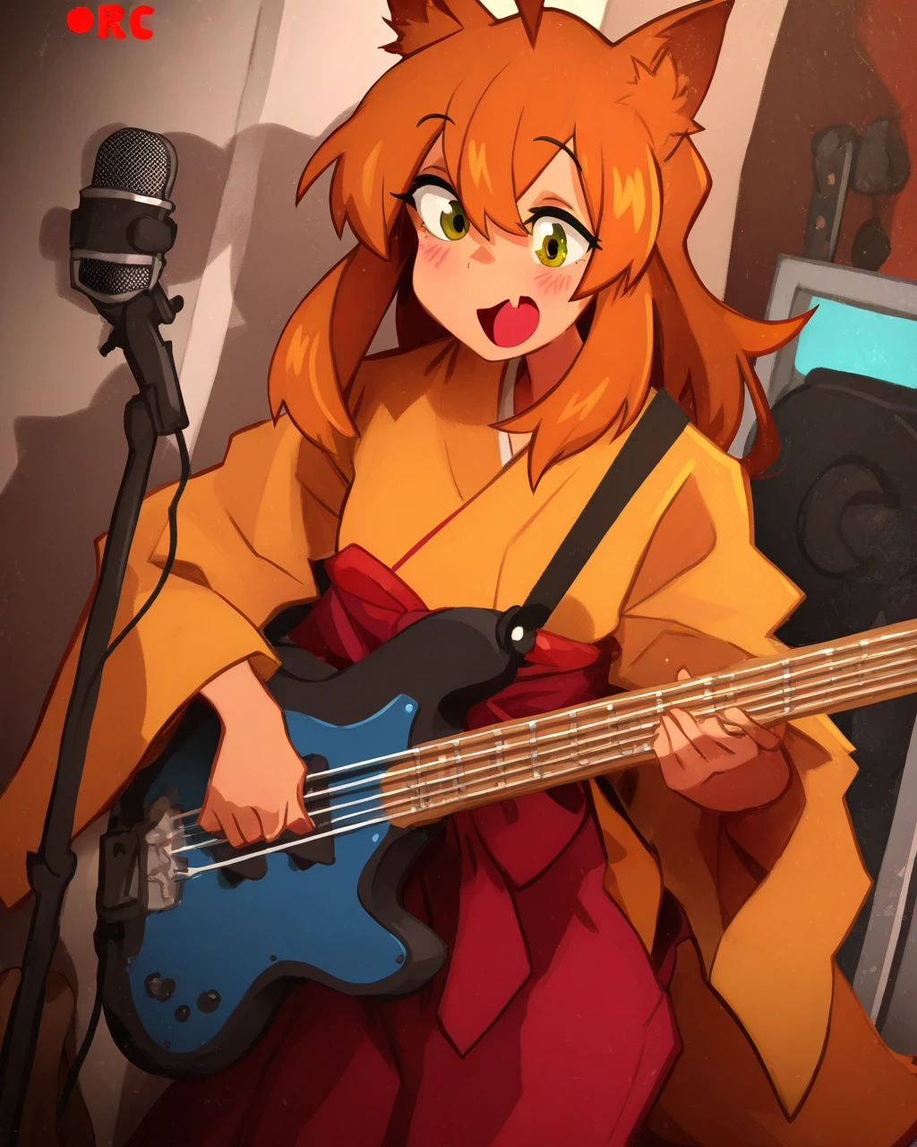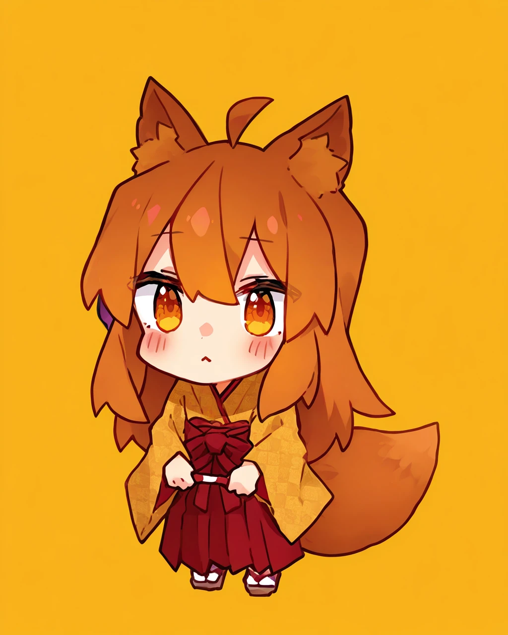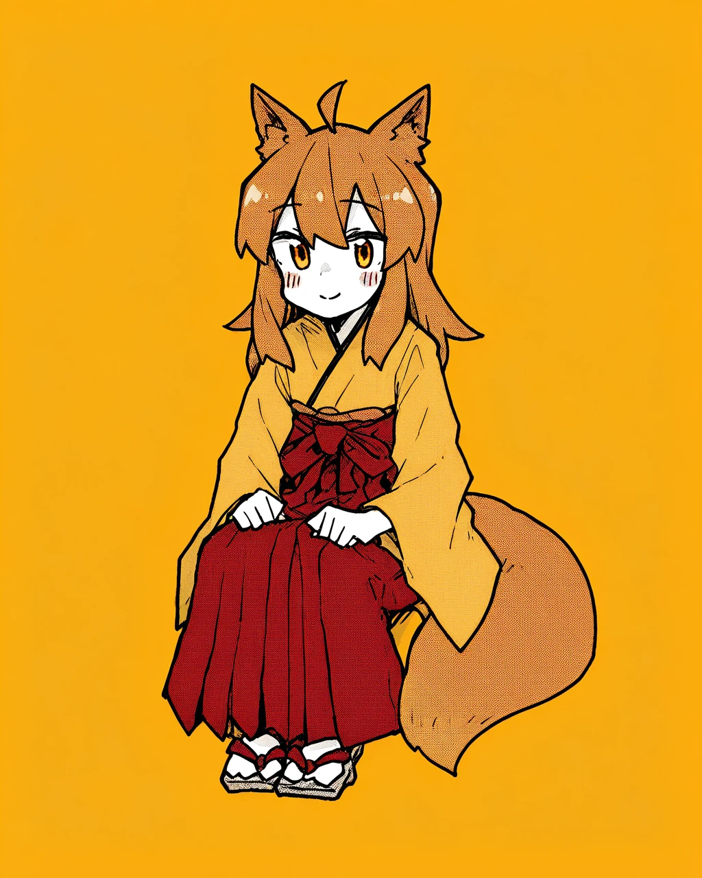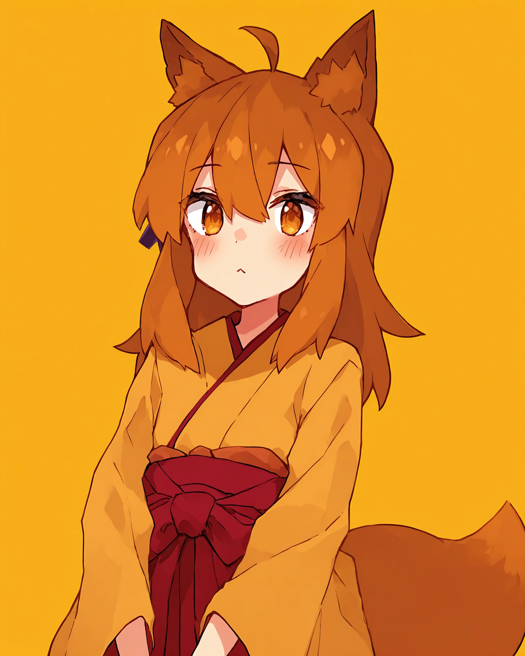 Generation Params: suzu, fox ears, fox tail, brown eyes, orange-brown hair, yellow miko kimono, medium hair, ahoge, hair between eyes
