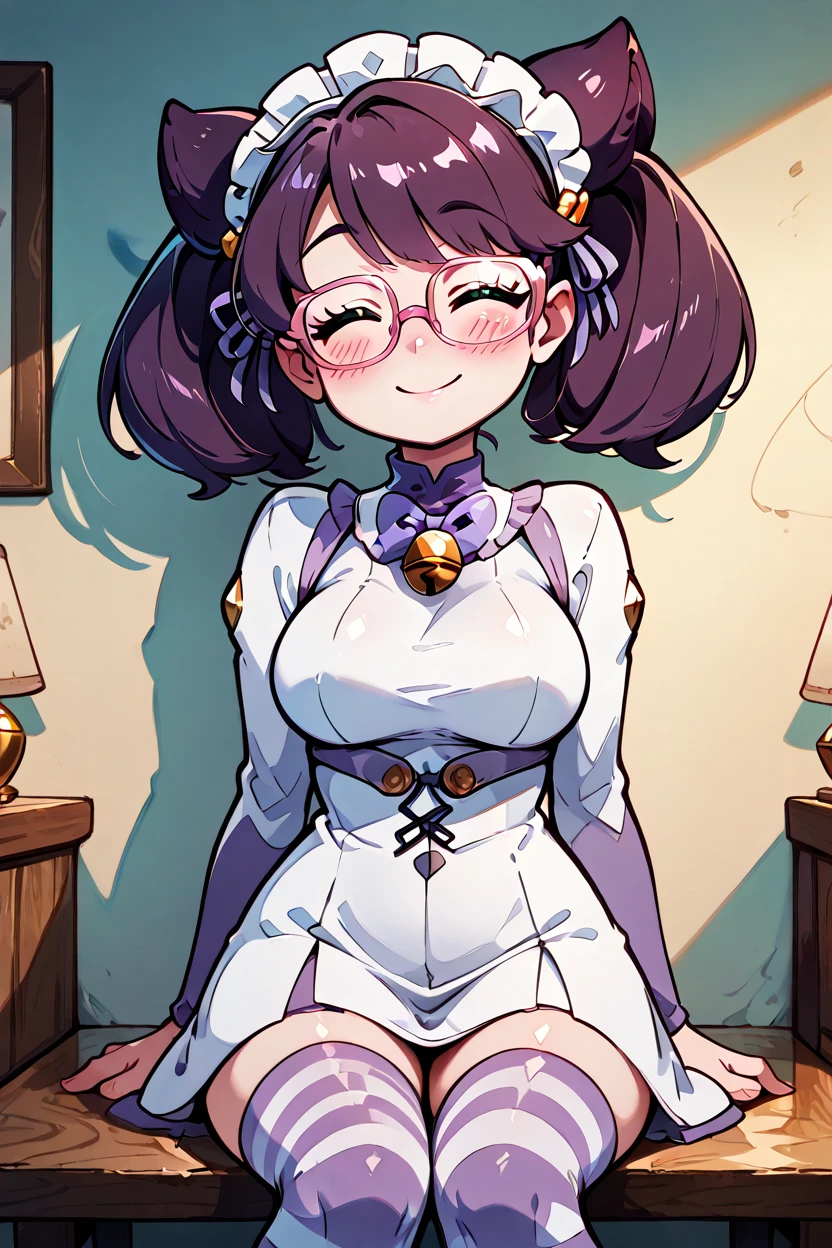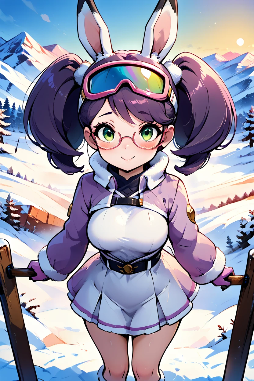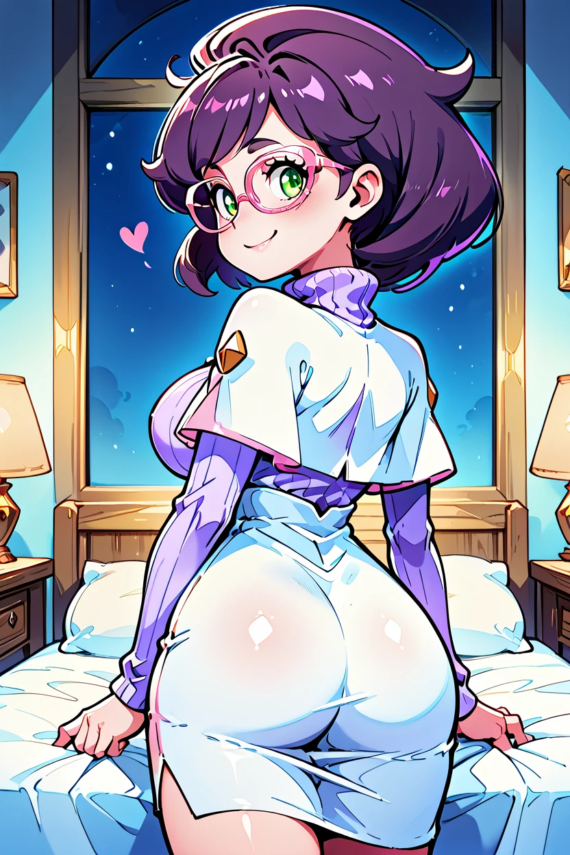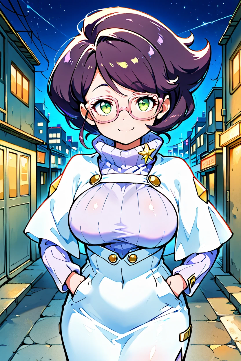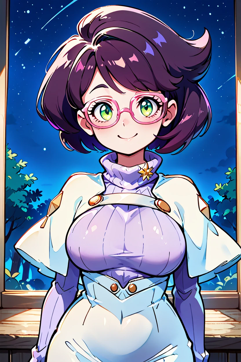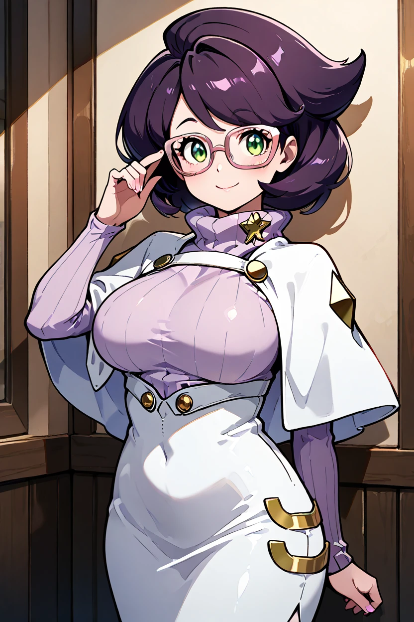 zzWicke, green eyes, pink-framed eyewear, glasses, purple hair, big hair, turtleneck sweater, ribbed sweater, skirt, capelet, large breasts, long sleeves,