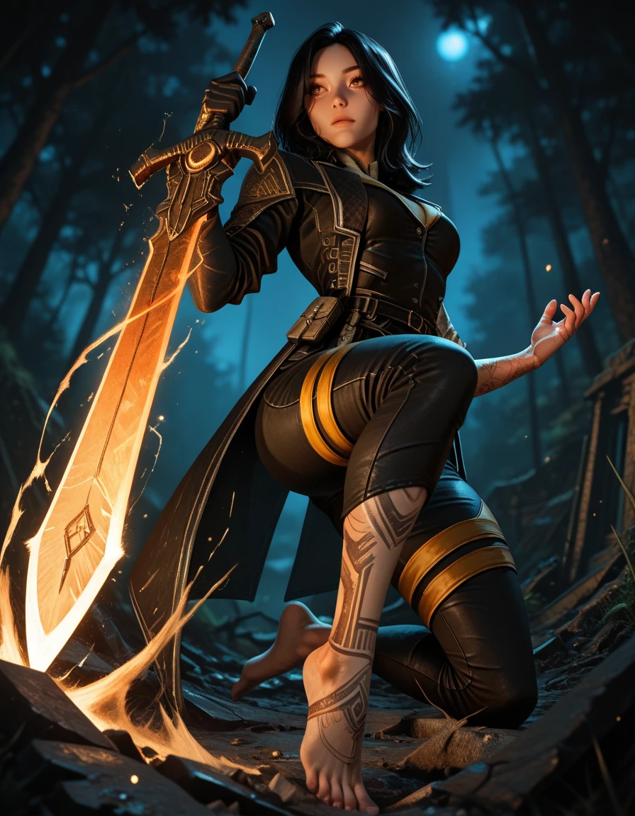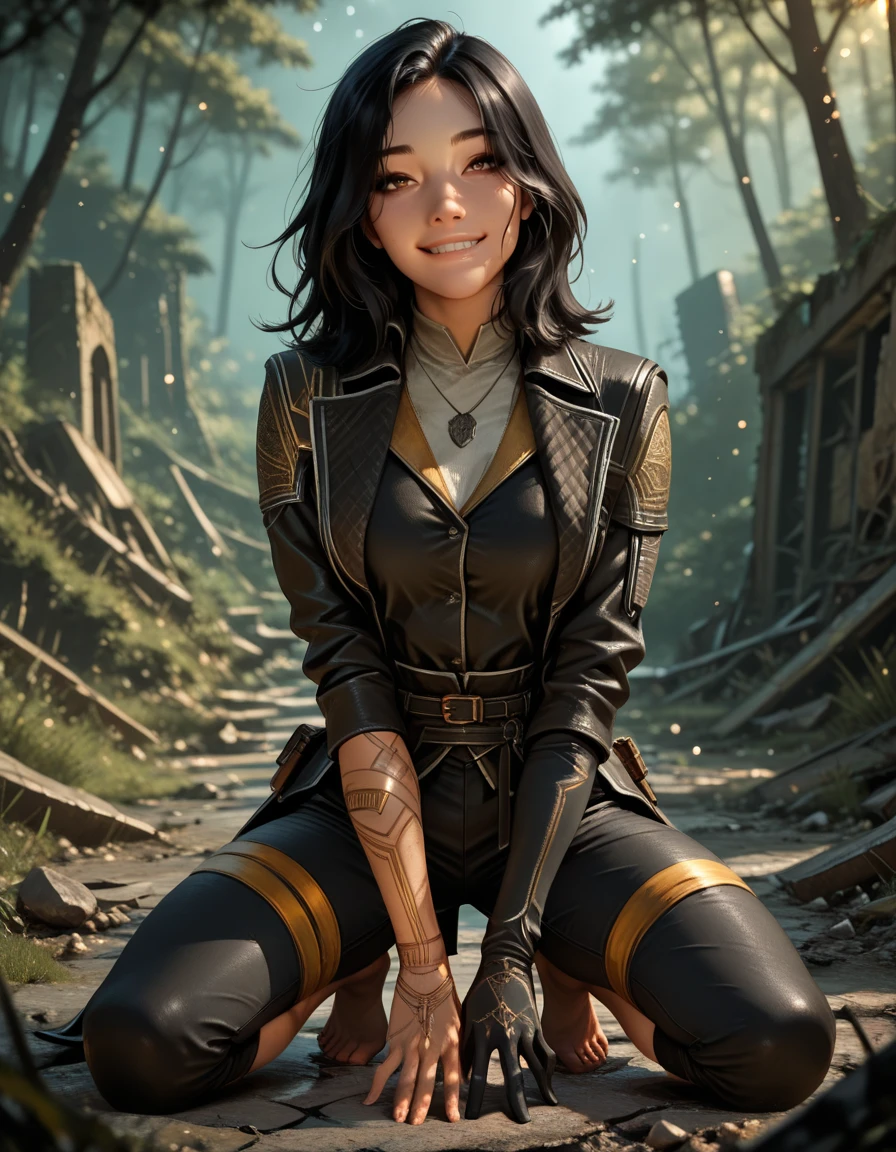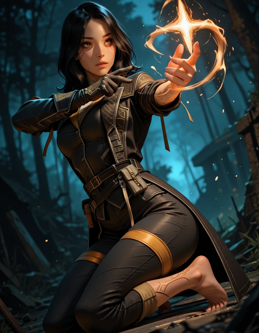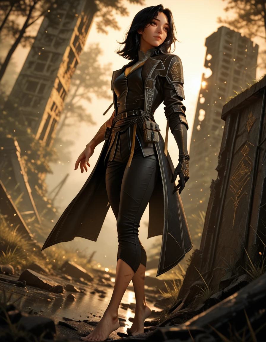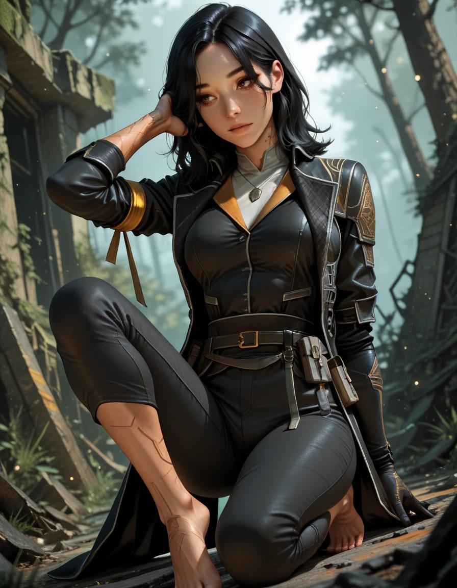 capri pants, black jacket, single glove, black coat,