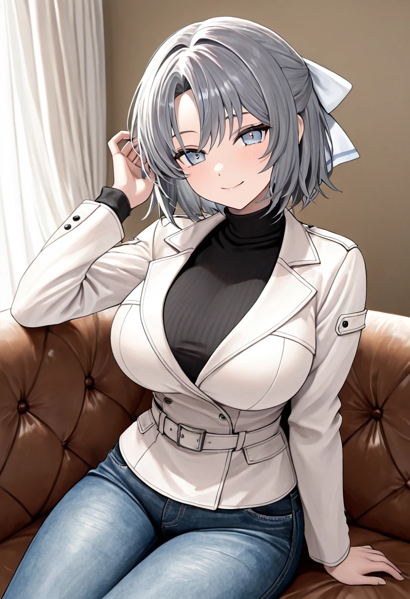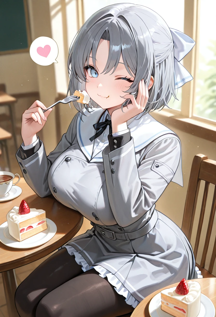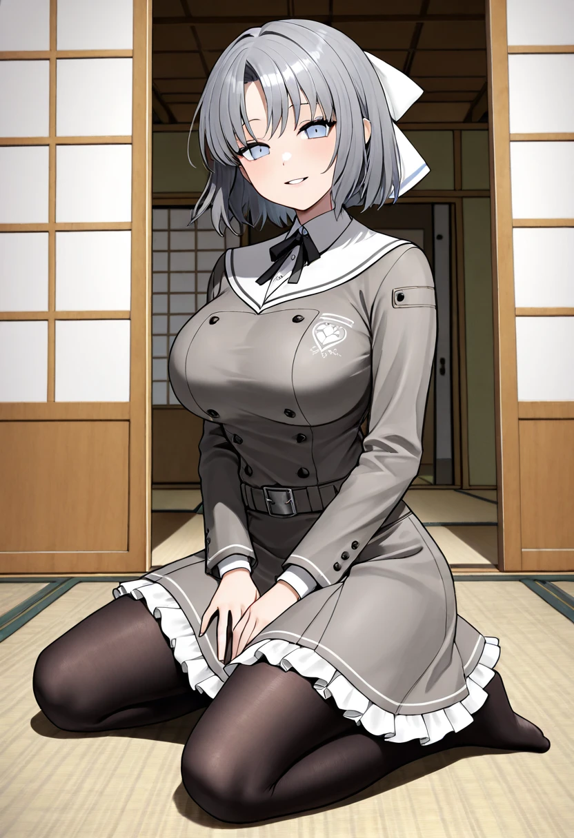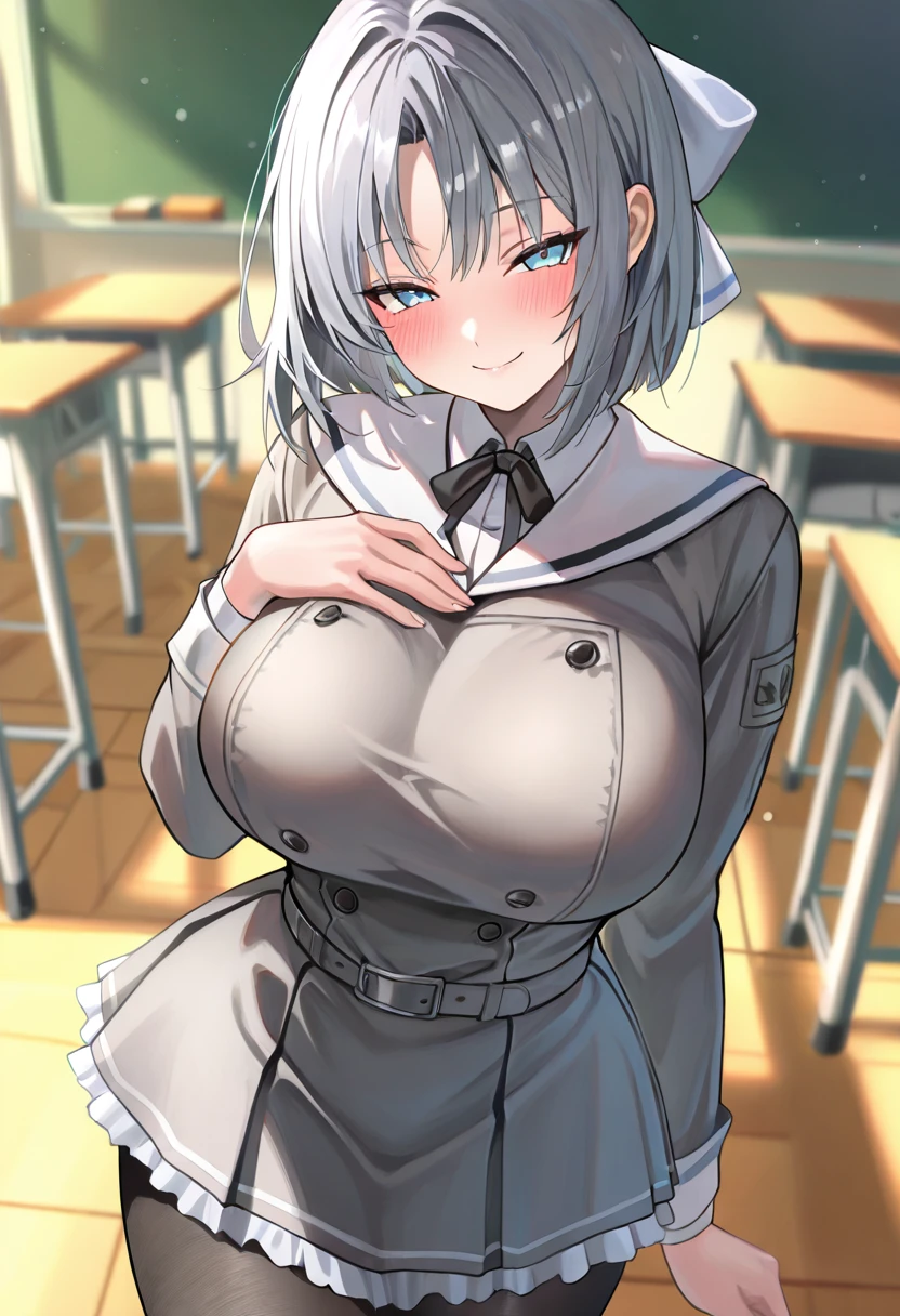 YMISENRN, blue eyes, grey hair, hair bow, short hair, large breasts, school uniform, sailor collar, grey skirt, frilled skirt, black pantyhose,