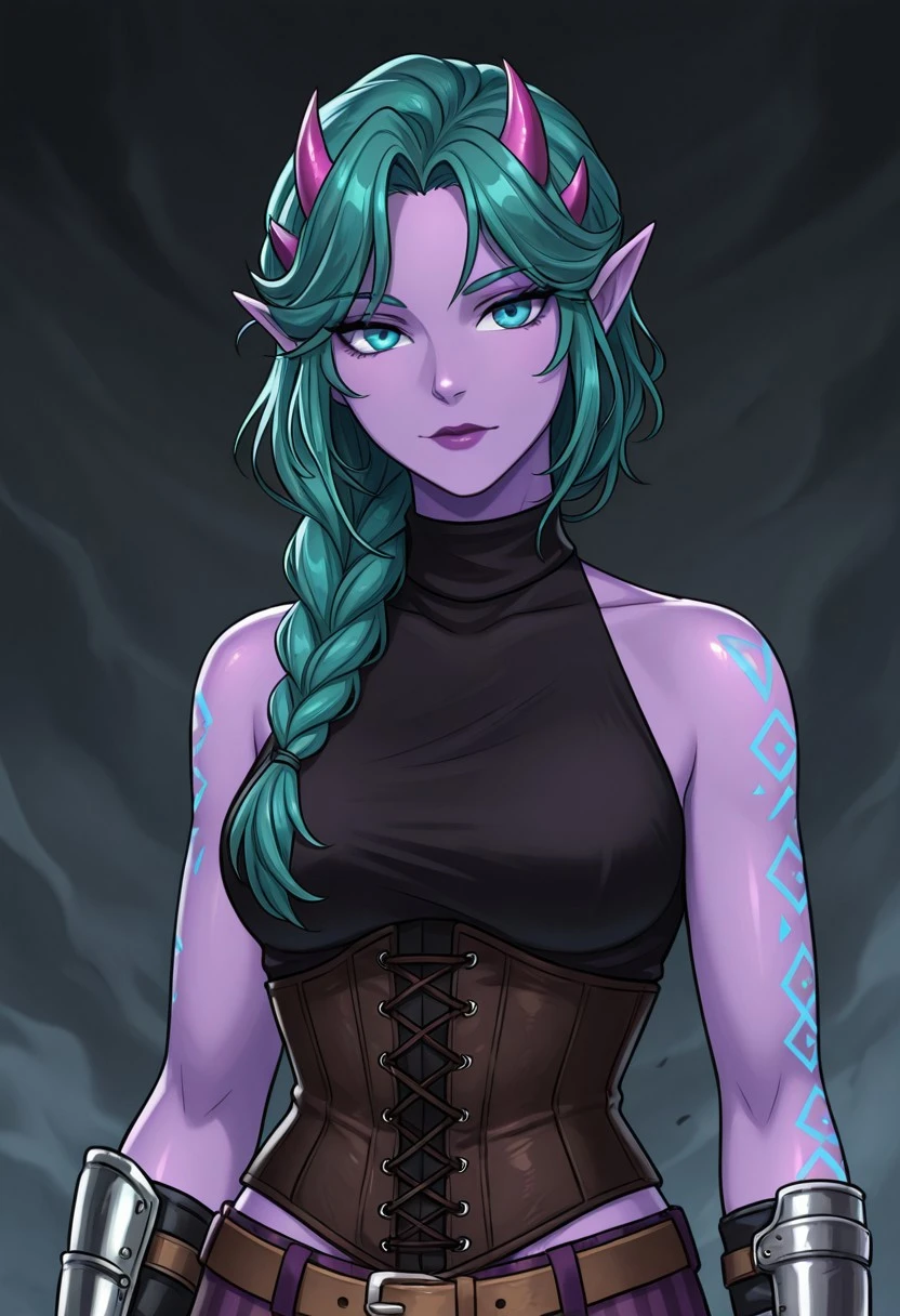 pointy ears, colored skin, purple skin, braid, single braid, long hair, horns, tattoo, hair over shoulder, green hair, blue eyes
