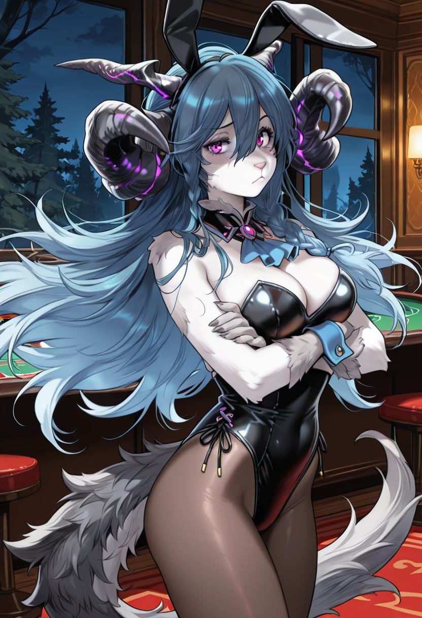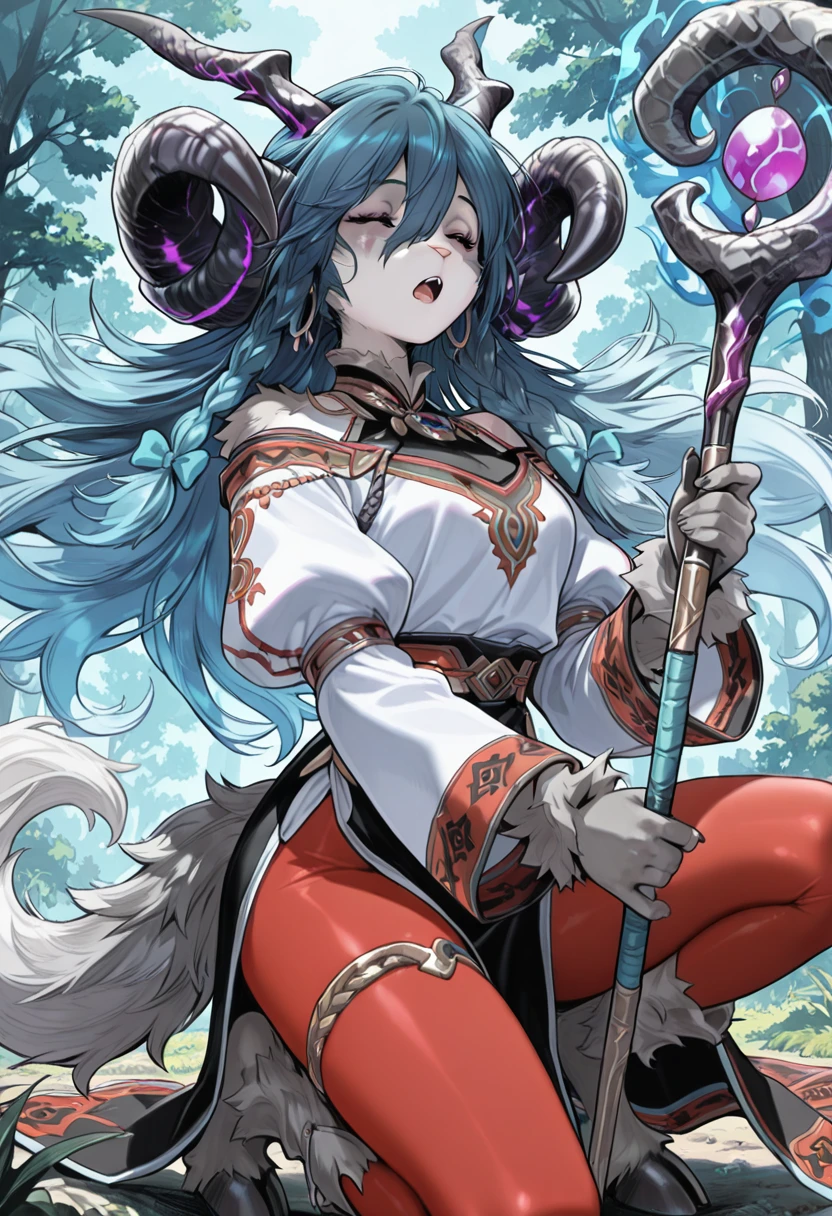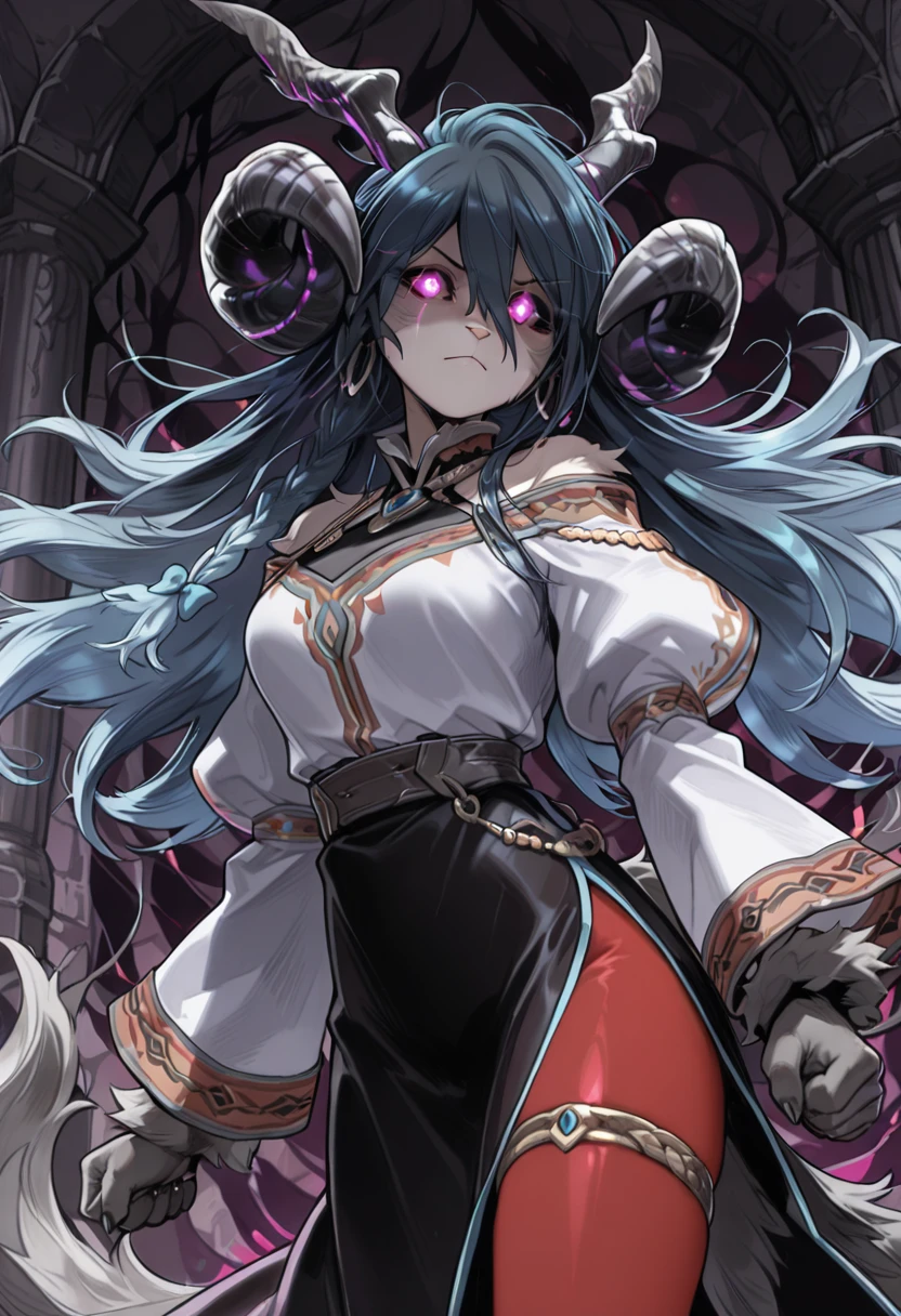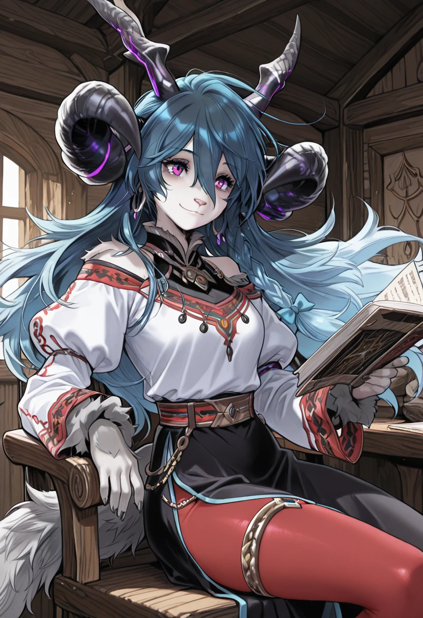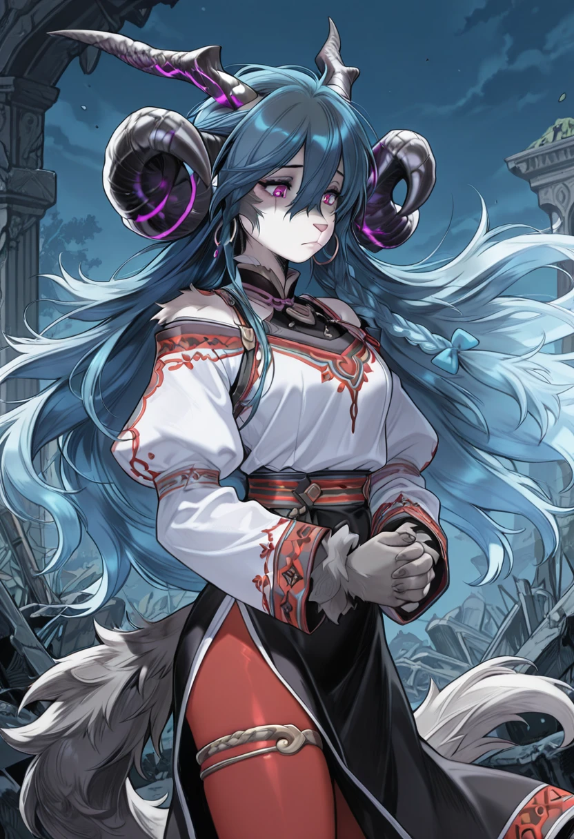 Trigger Words (General): MicaelaShadow, pale skin, furry, furry female, blue hair, long hair, gradient hair, bangs between eyes, braid, bow, pink eyes, mixed horns, sheep horns, goat horns, claws, furry tail, dragon tail, hooves, white fur,