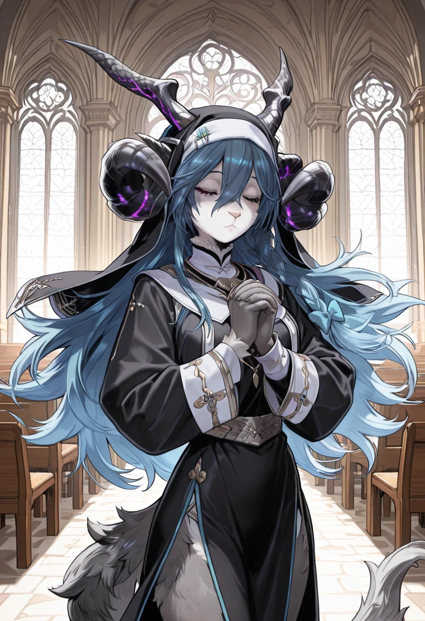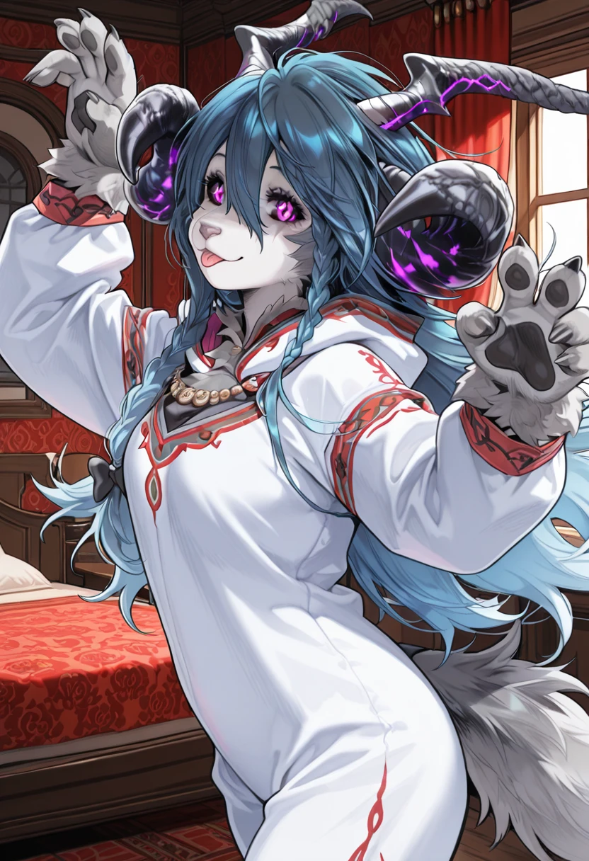 MicaelaShadow, pale skin, furry, furry female, blue hair, long hair, gradient hair, bangs between eyes, braid, bow, pink eyes, mixed horns, sheep horns, goat horns, claws, furry tail, dragon tail, hooves, white fur,