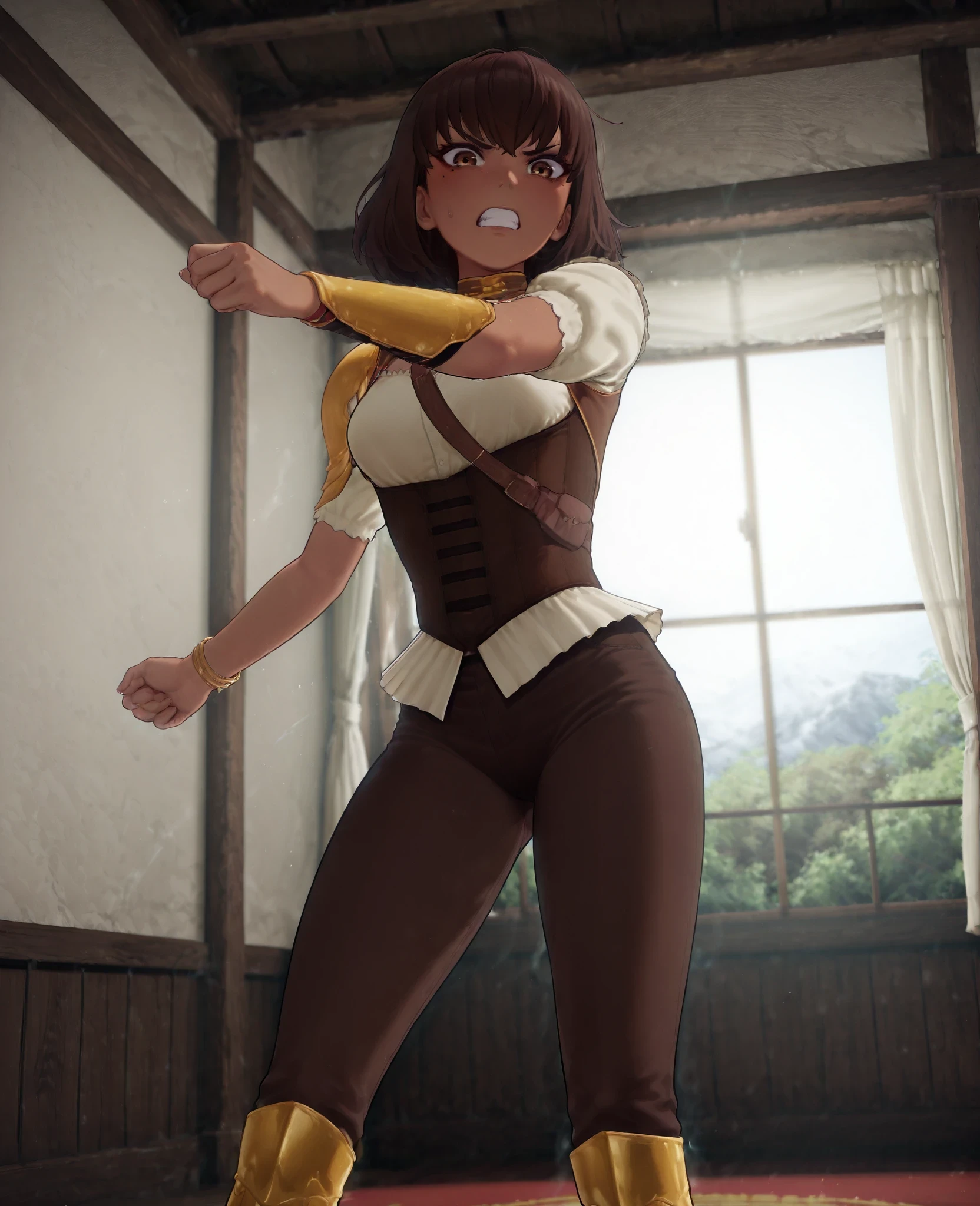 4mb3r, 1girl brown hair, short hair, brown eyes, mole, dark skinned female