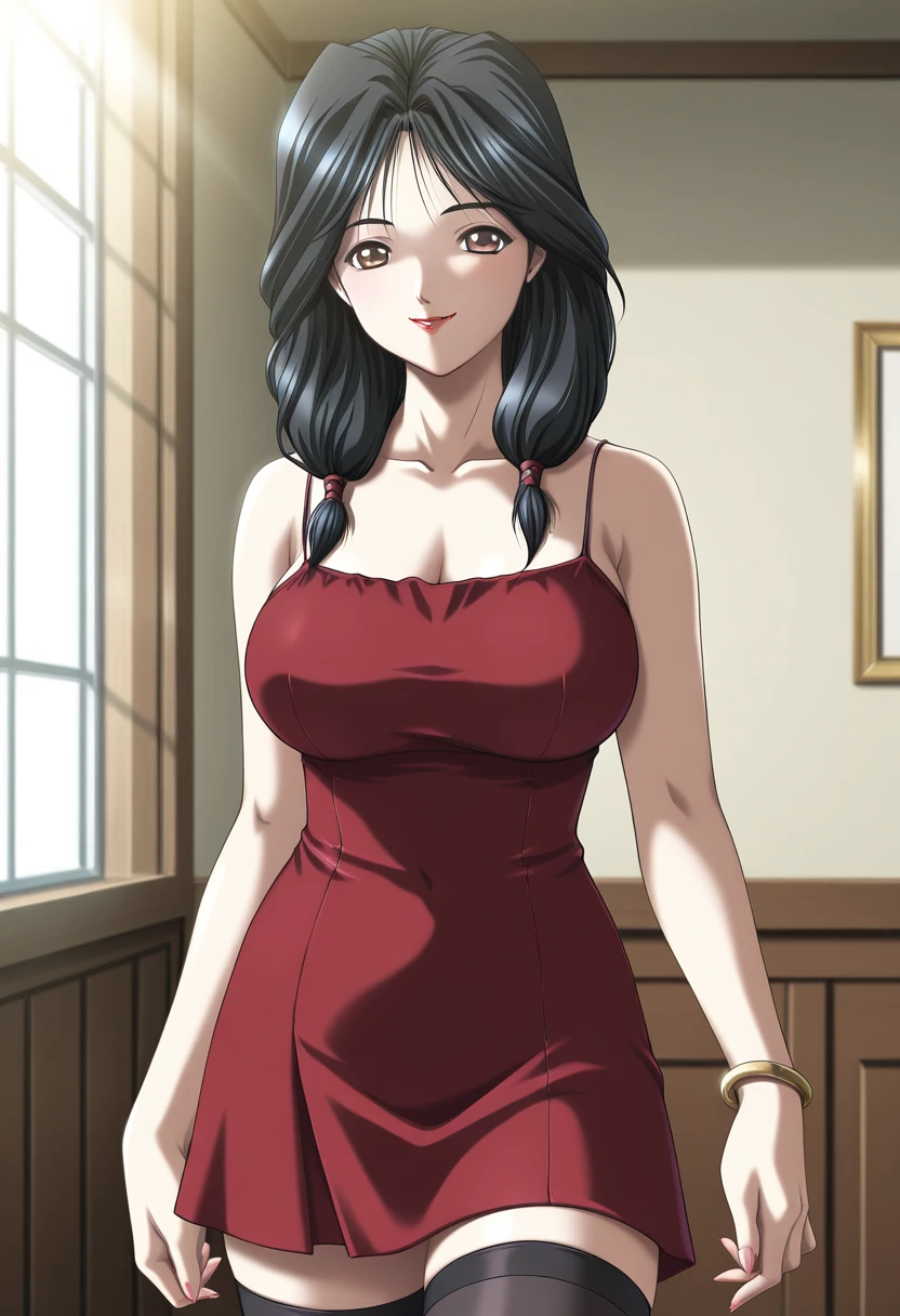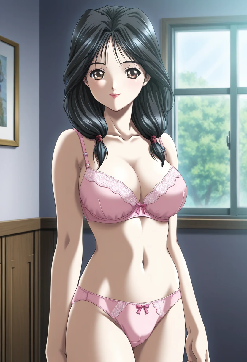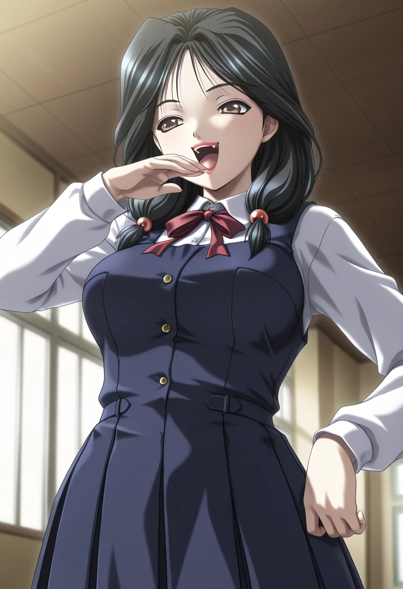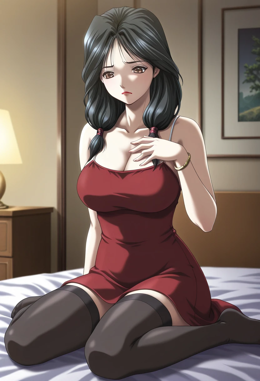 yumiww, pale skin, brown eyes, black hair, long hair, low twintails, parted bangs, lipstick, large breasts,