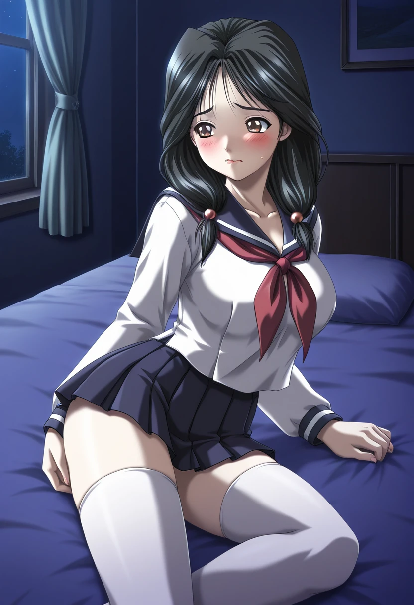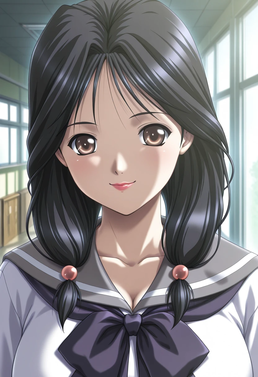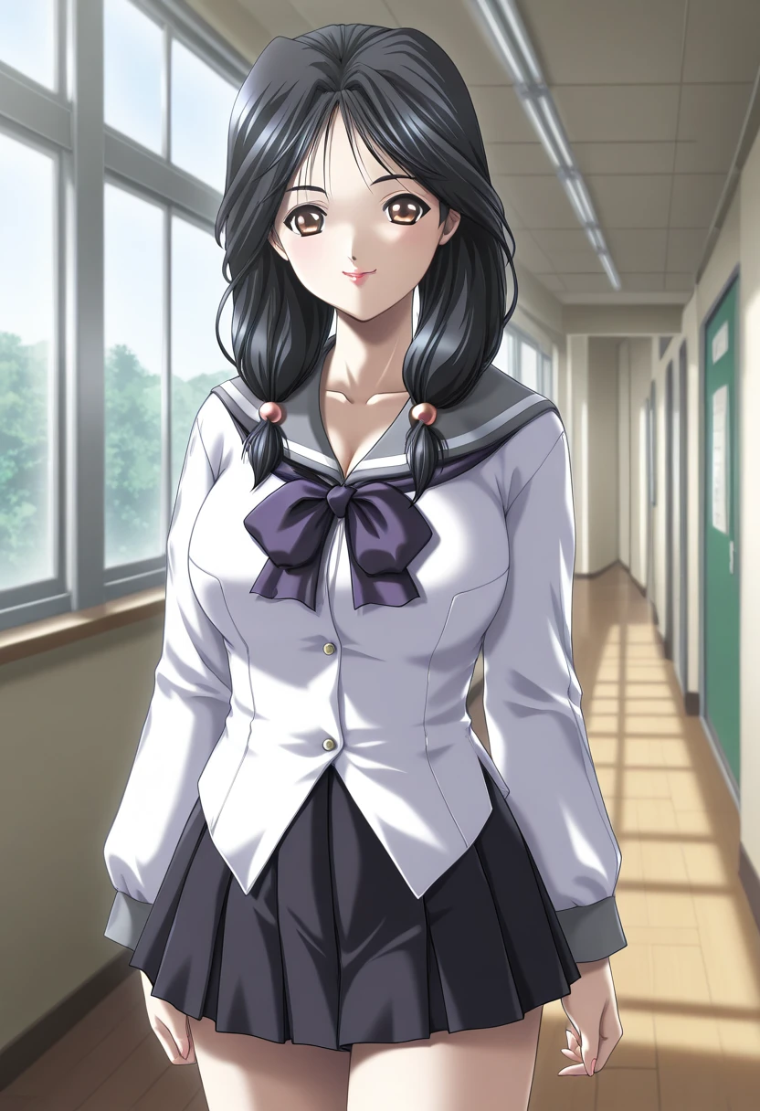 hair bobbles, school uniform, serafuku, grey sailor collar, dark purple bowtie, white shirt, long sleeves, black pleated skirt, miniskirt,