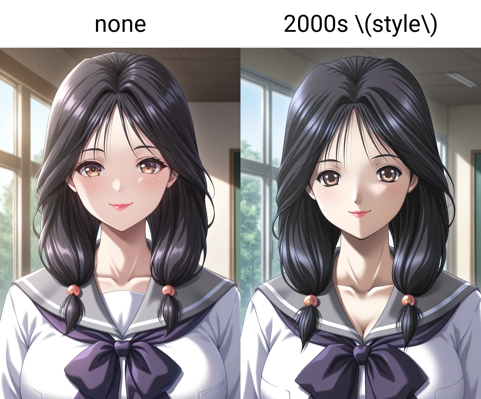 プロンプトに "2000s (style)" を使った方が、ゲームの雰囲気に近くなります。