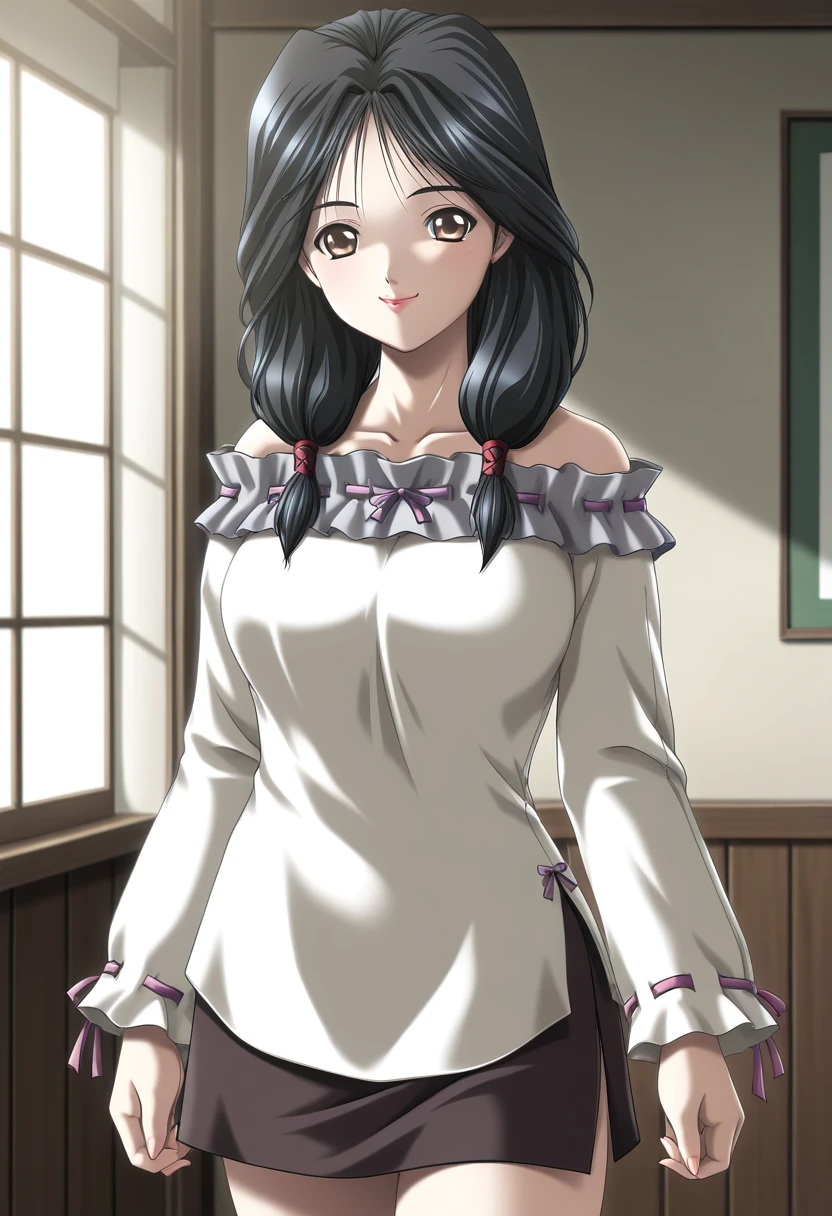hair tie, off-shoulder shirt, frilled shirt, white blouse, ribbon trim, grey frills, untucked shirt, long sleeves, dark brown pencil skirt, miniskirt,