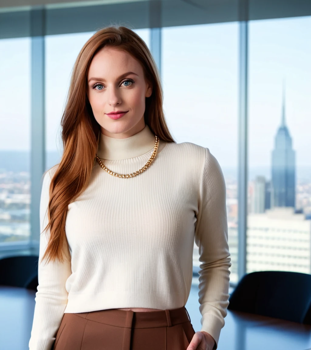 <lora:p34ch_SD15_SGX:0.8>,a (close up:1.2) photograph of 22 year old beautiful(p34ch woman:1.1),sitting on a couch,wearing a gray cable knit sweater dress,facing viewer,with vases of flowers,(upper body),(medium close up shot:1.3),long dark ginger hair,smirk,lips,simple background, professional portrait, photo realistic, 4k wallpaper, highly detailed, bokeh
