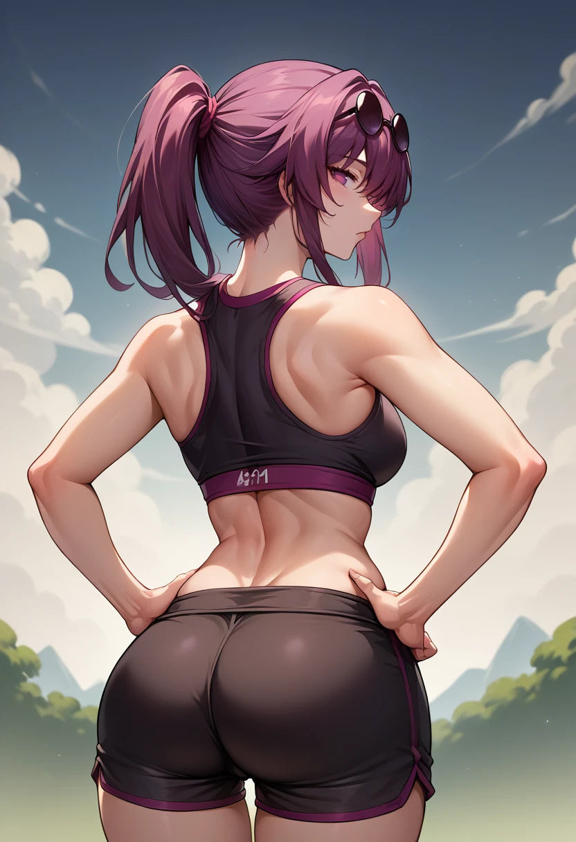 Custom Outfit: KafkaHSR, purple eyes, long hair, ponytail, sidelocks, sunglasses on head