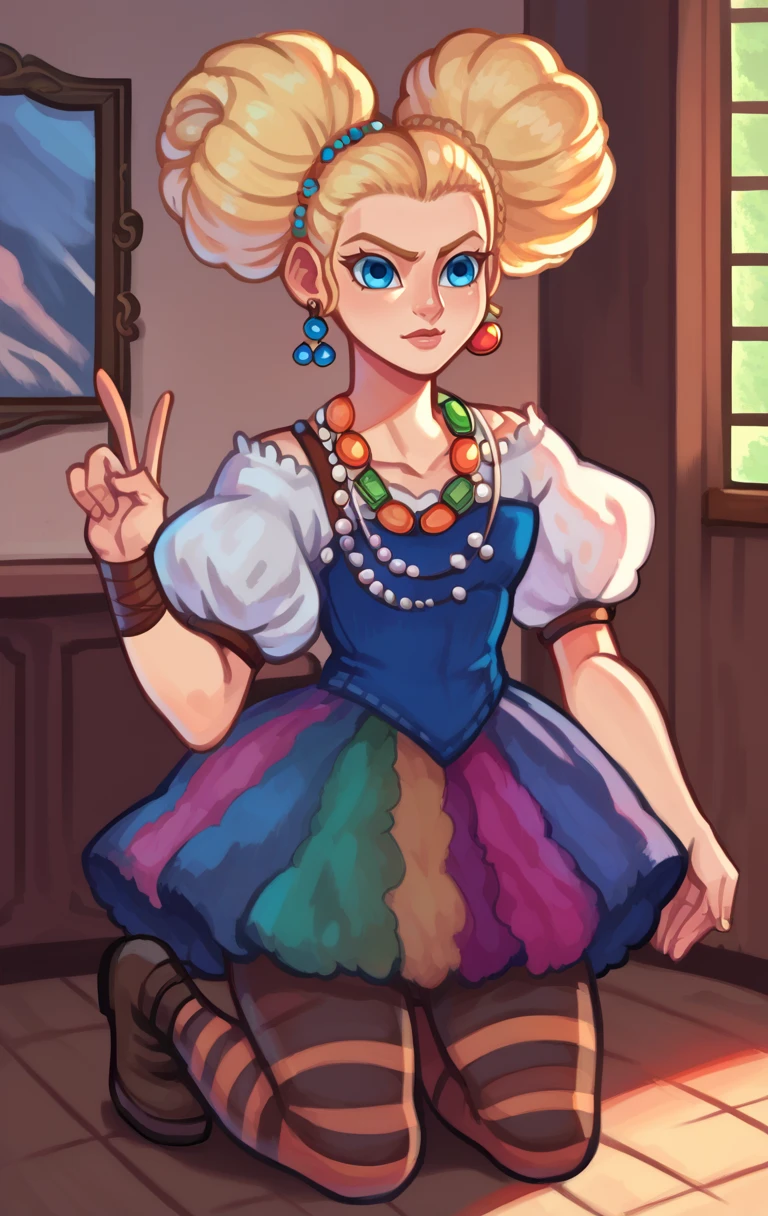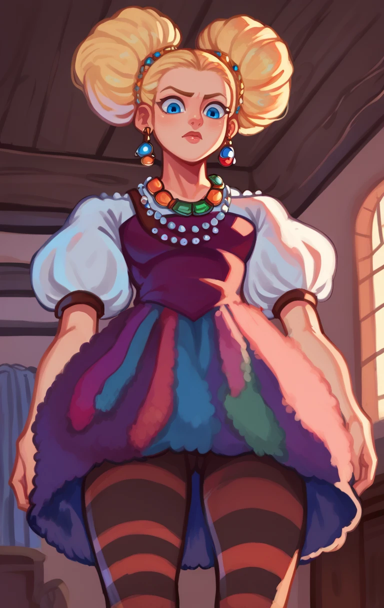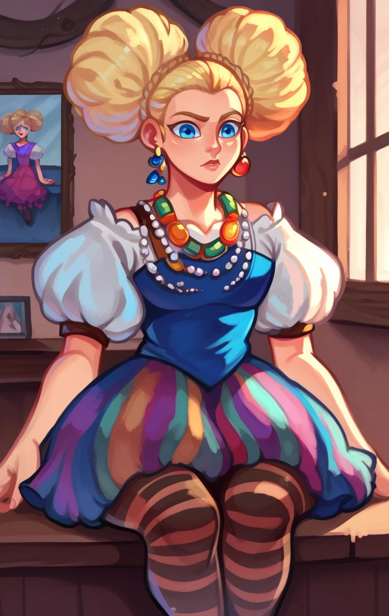 goldilocksSDXL,1girl,blue eyes,blonde hair,dress,jewelry,pantyhose,earrings,striped,puffy sleeves,necklace,hair bun,puffy short sleeves,striped pantyhose