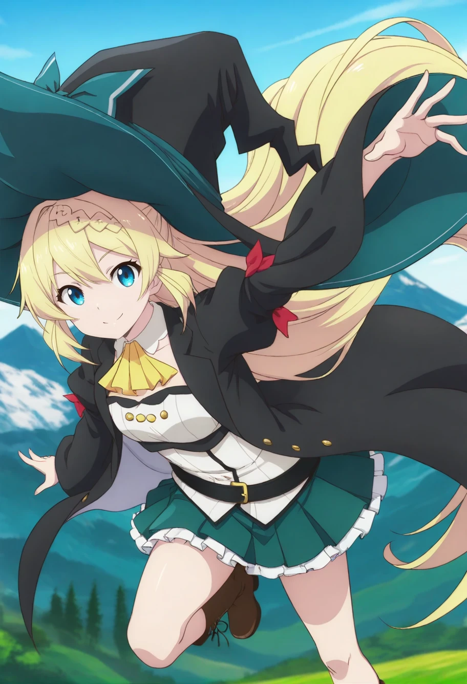 azusa-default,blue eyes,blonde hair,very long hair,black coat,detached collar,yellow ascot,white shirt,green skirt,frilled skirt,boots,witch hat
