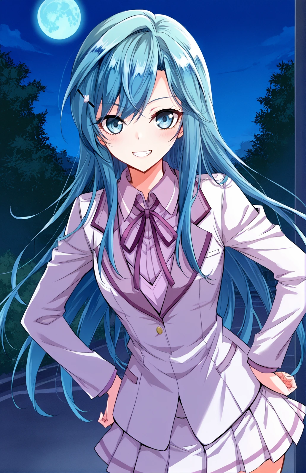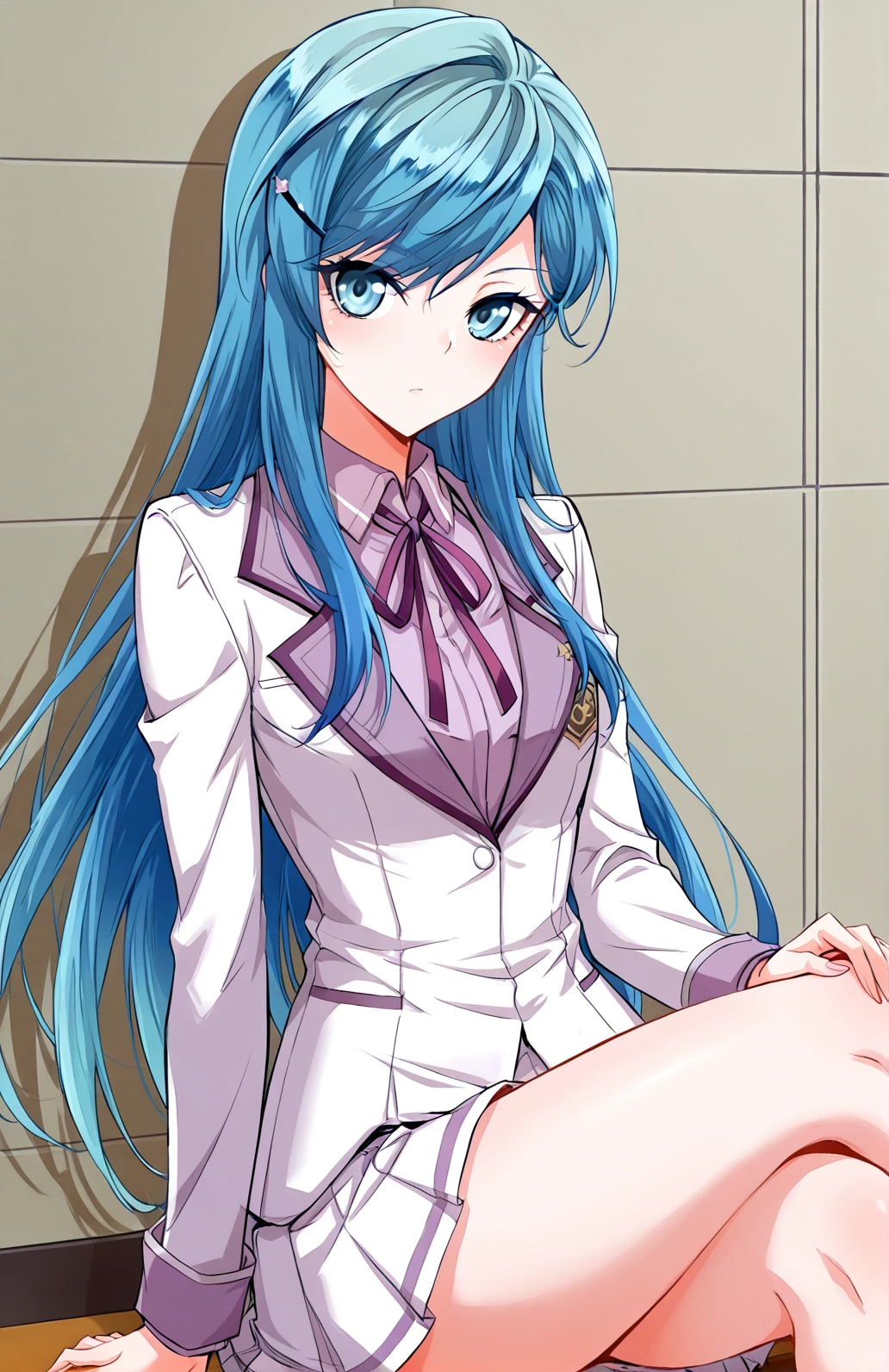 Lan_outfit, school uniform, white jacket, fitted jacket, purple accents, lapel collar, purple ribbon bow, pleated skirt, short skirt, white skirt, white shirt, long sleeves
