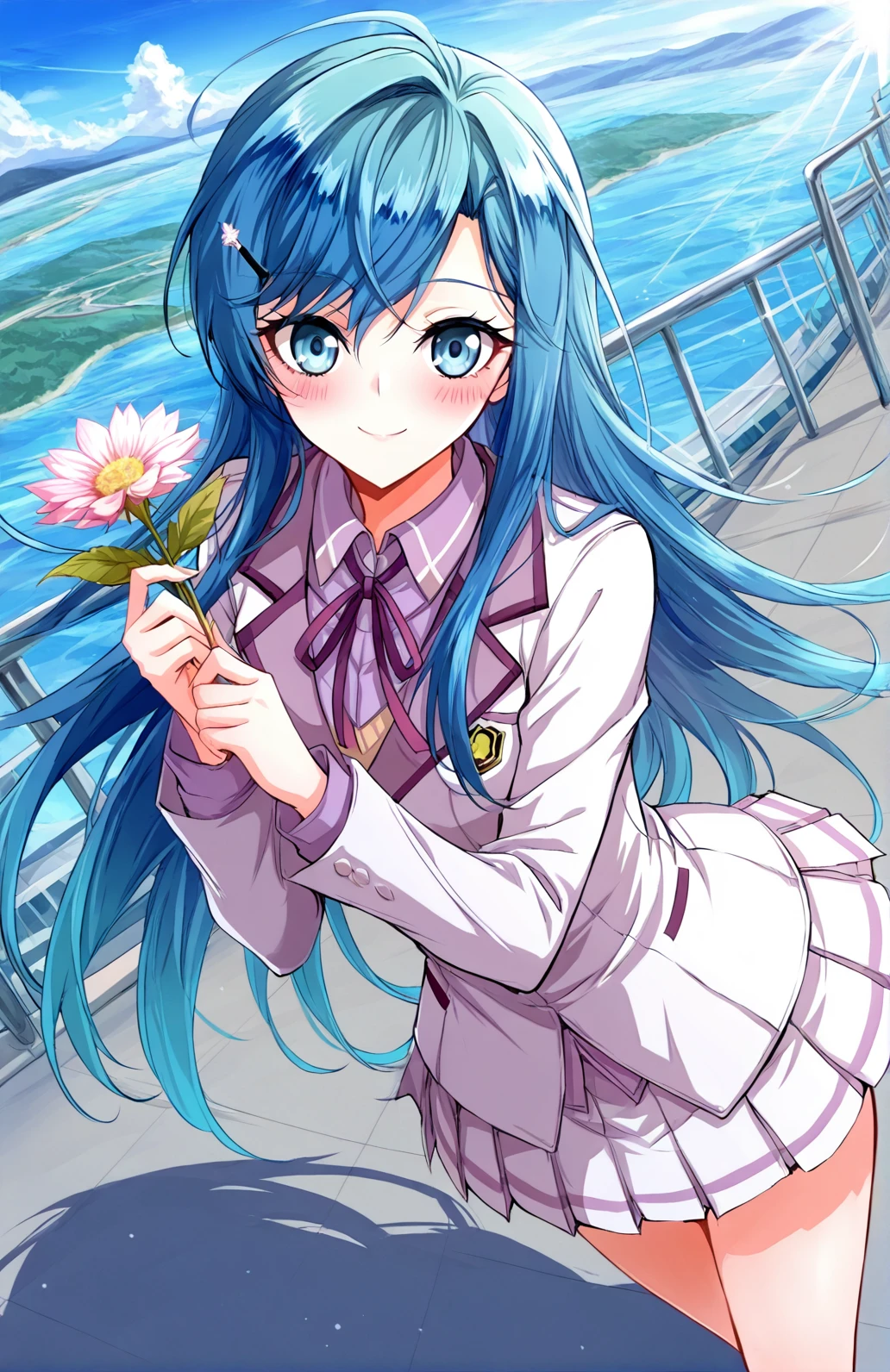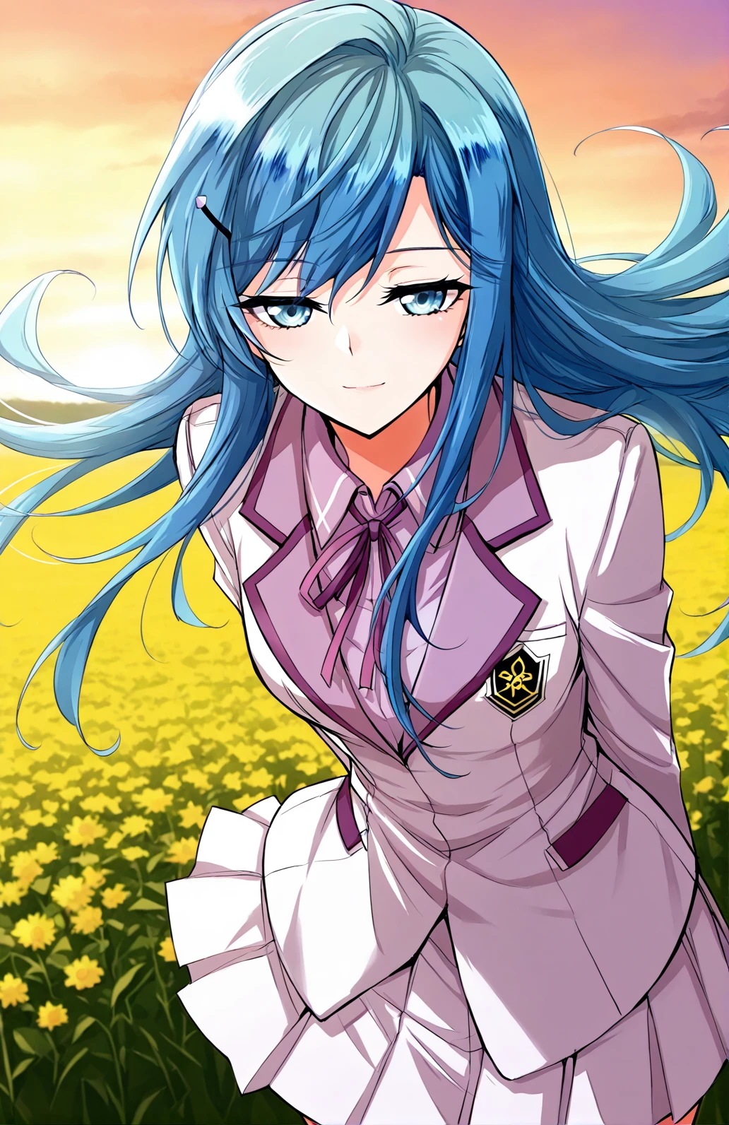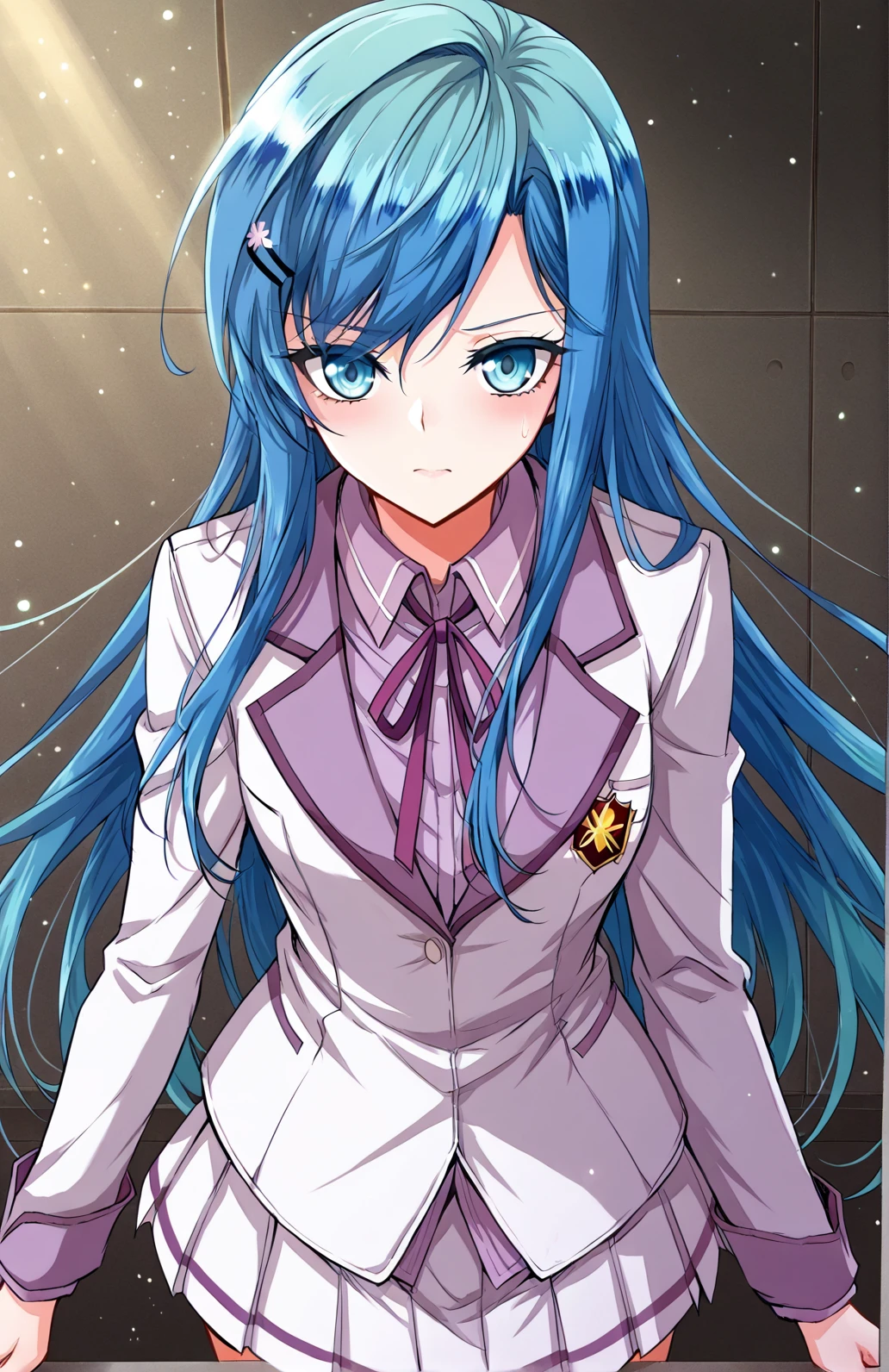 Lan, 1 girl, solo, long hair, blue hair, gradient hair tips, side swept bangs, single hair clip, blue eyes,