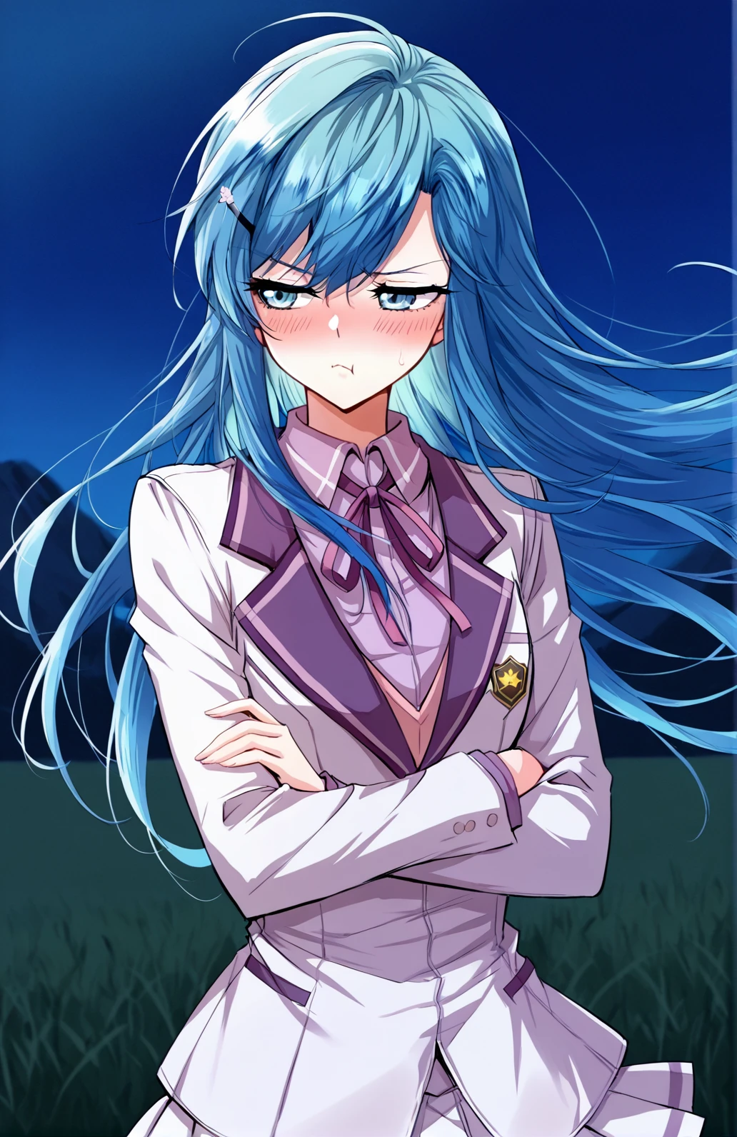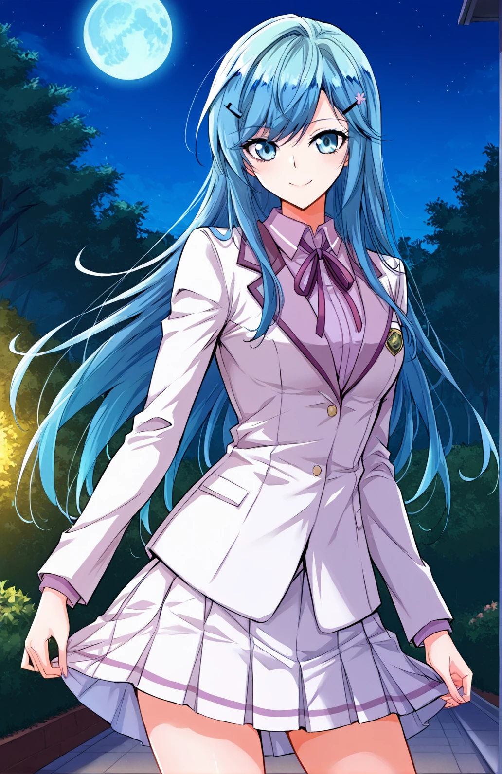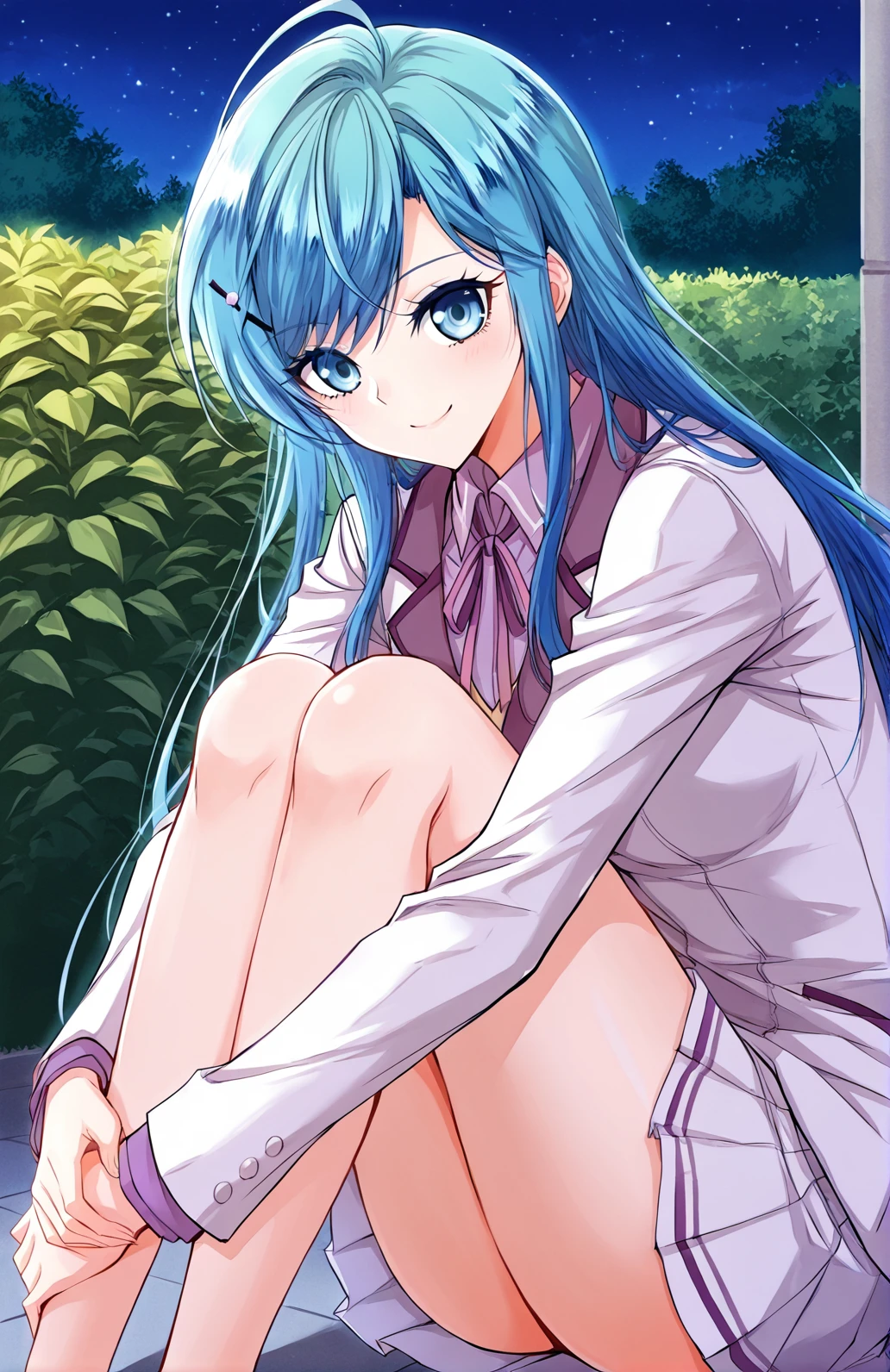Lan, 1 girl, solo, long hair, blue hair, gradient hair tips, side swept bangs, single hair clip, blue eyes,