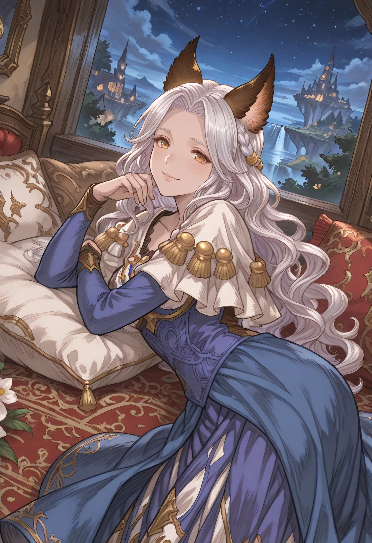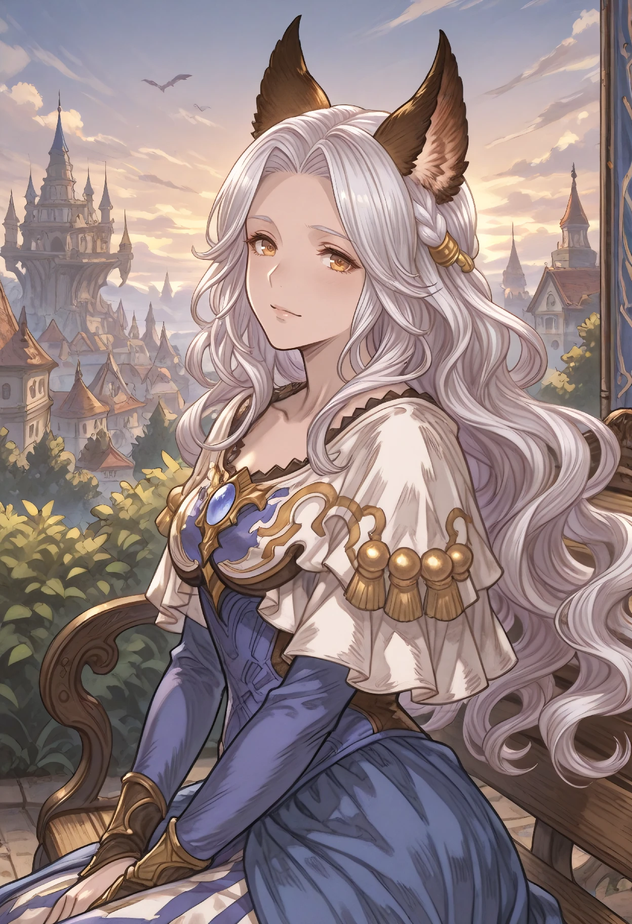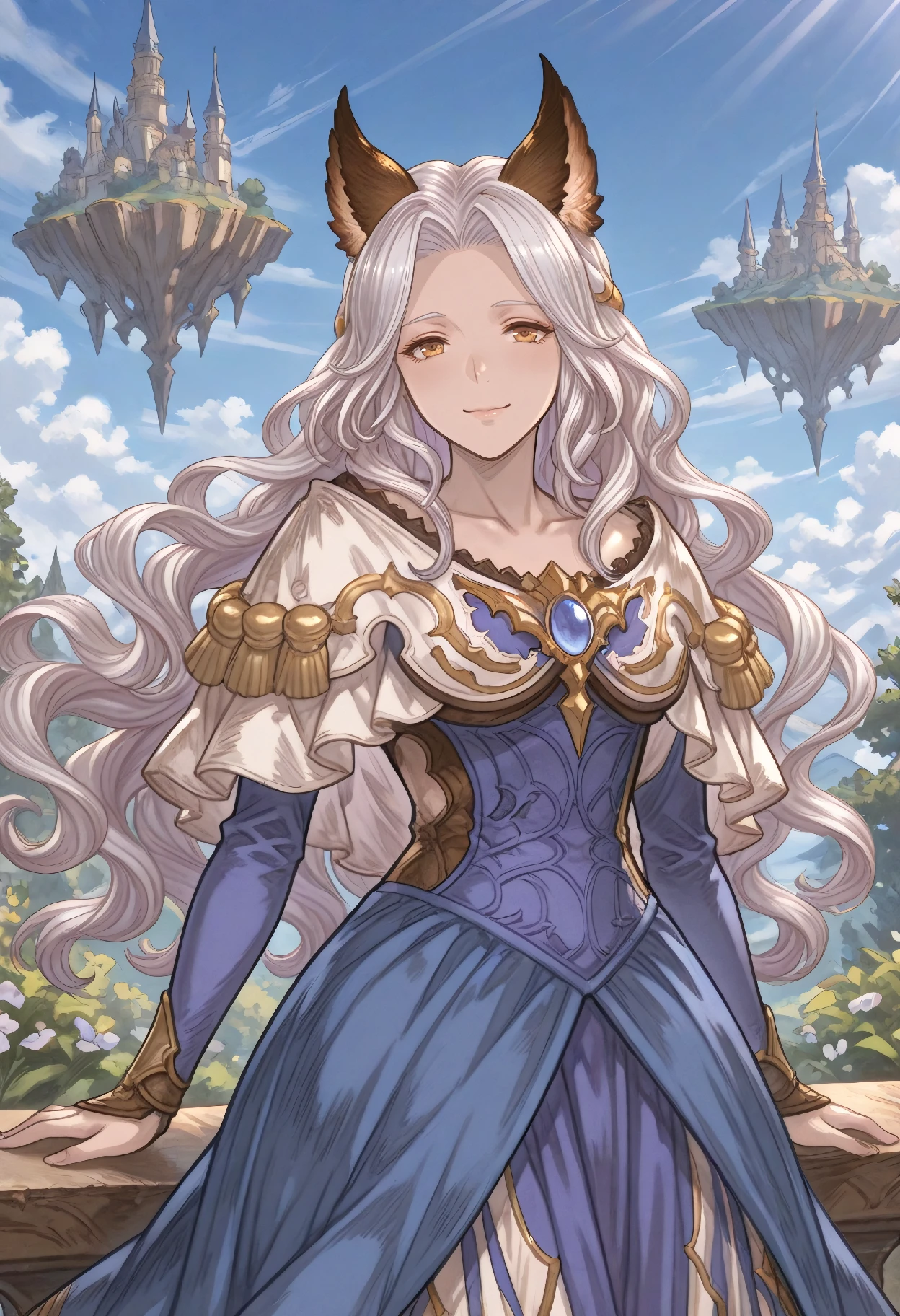 MugainBase (Granblue Fantasy), erune, white hair, long wavy hair, hair intakes, braid, brown eyes, yellow eyes, animal ears, jewelry, brooch, gem, capelet, blue dress, purple dress, gold trim,
