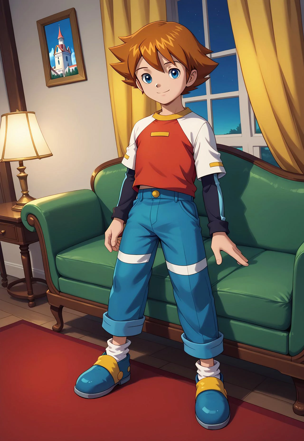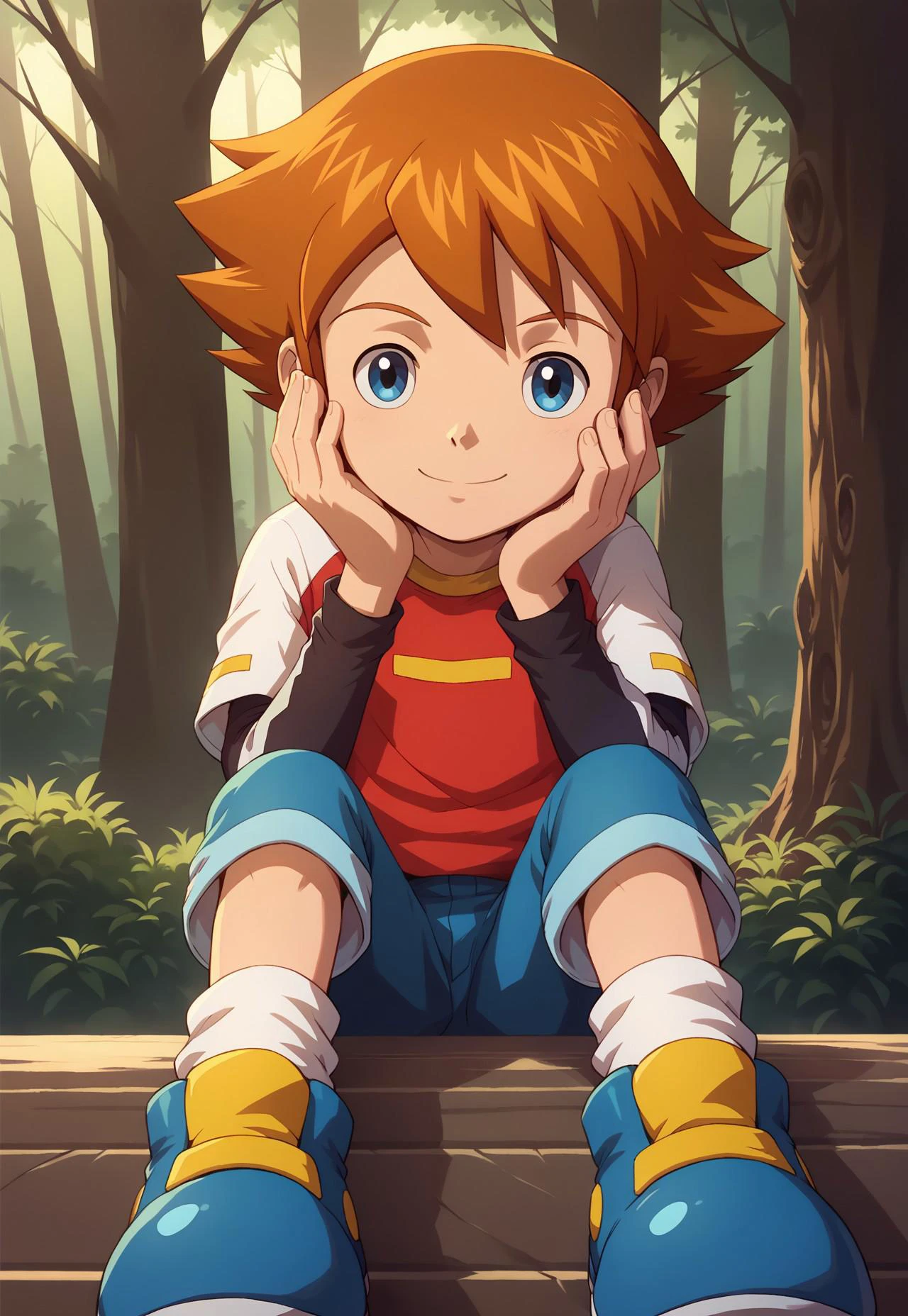 CThorndyke, 1boy, solo, brown hair, blue eyes, shirt, short over long sleeves, blue pants, white socks, blue footwear
