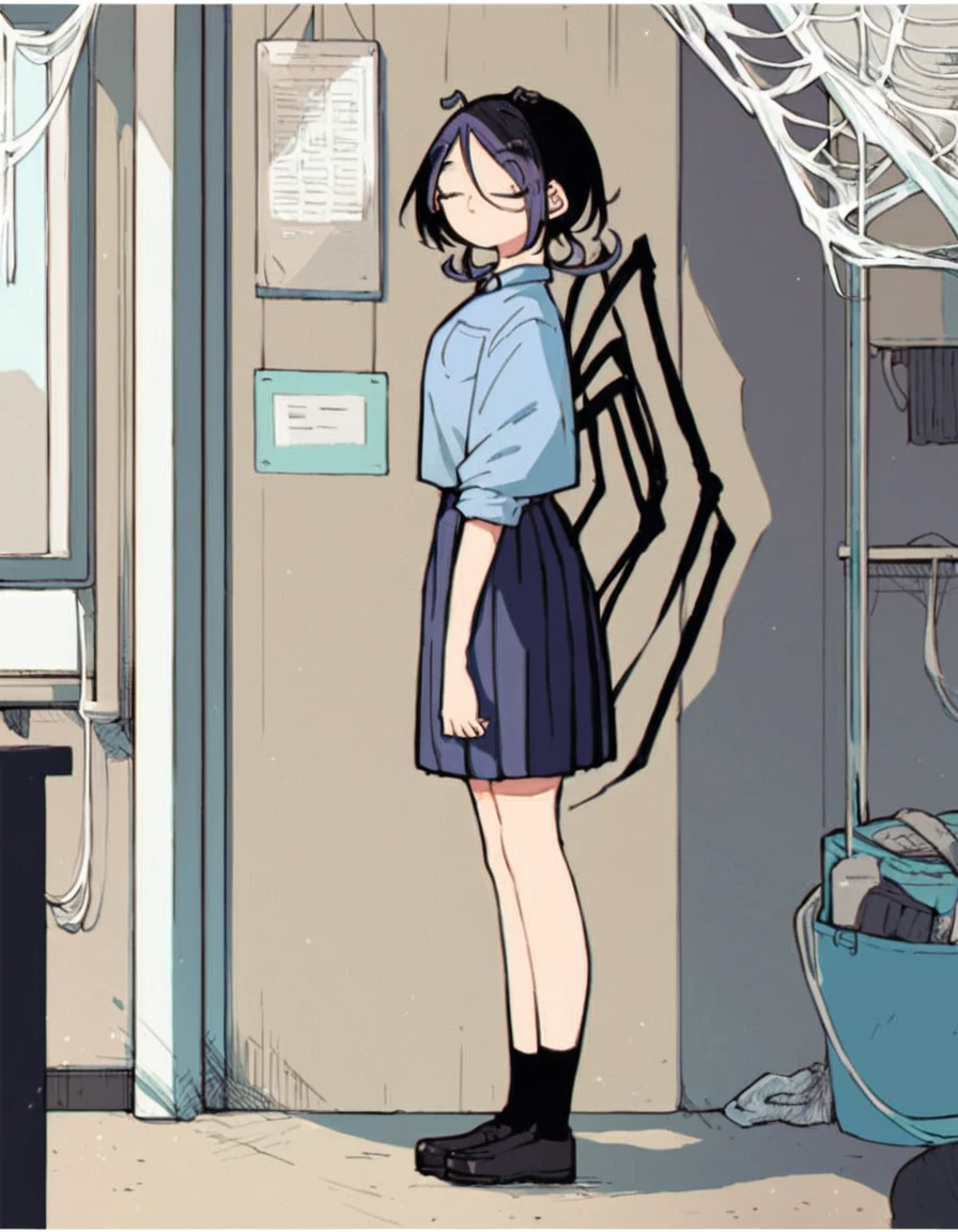 description: 1girl, solo, breast pocket, skirt, closed eyes, pocket, light blue shirt, socks, shoes, short hair, shirt tucked in, pleated skirt, dark blue skirt, school uniform, collared shirt, spider legs, antenna, multicolor hair, purple and black hair,