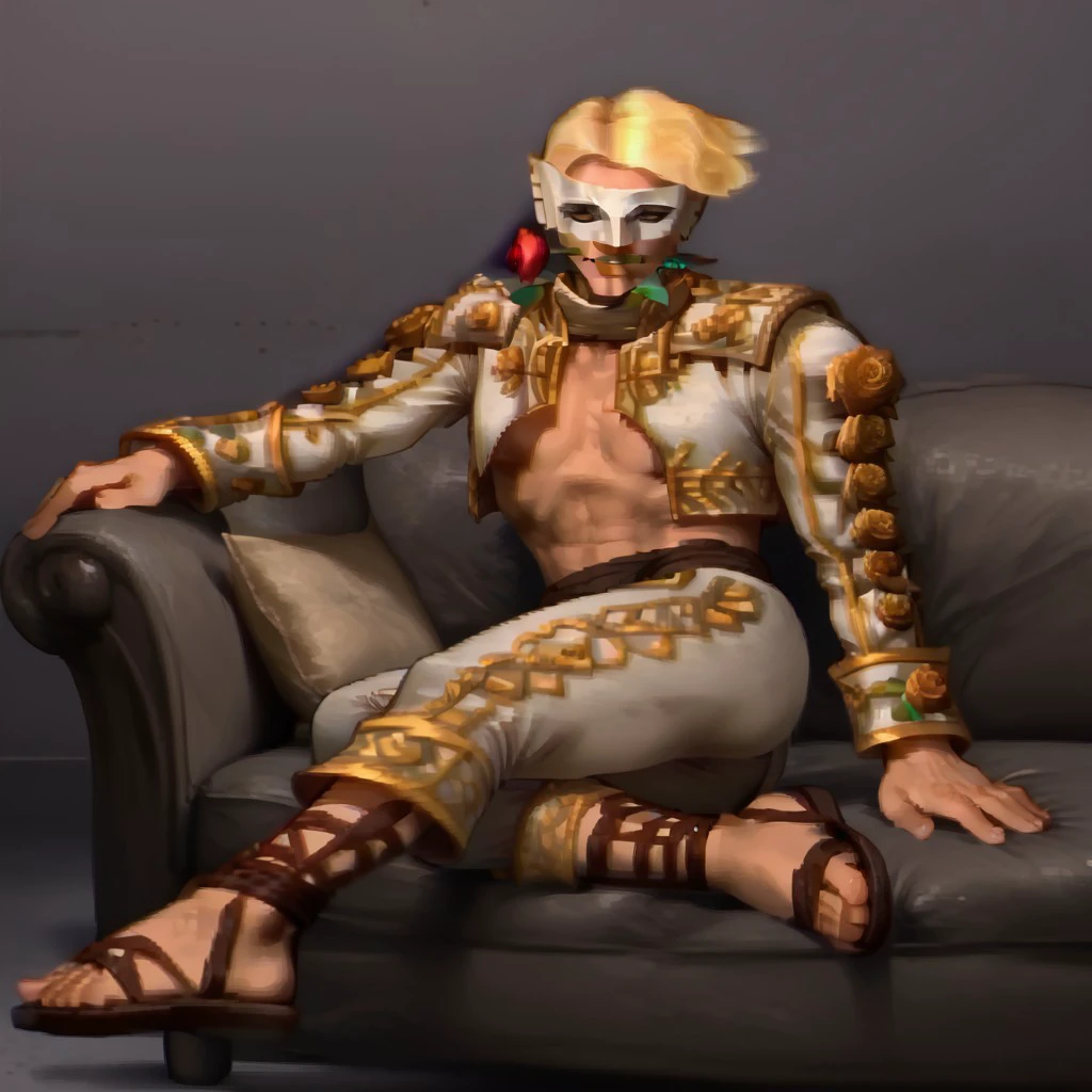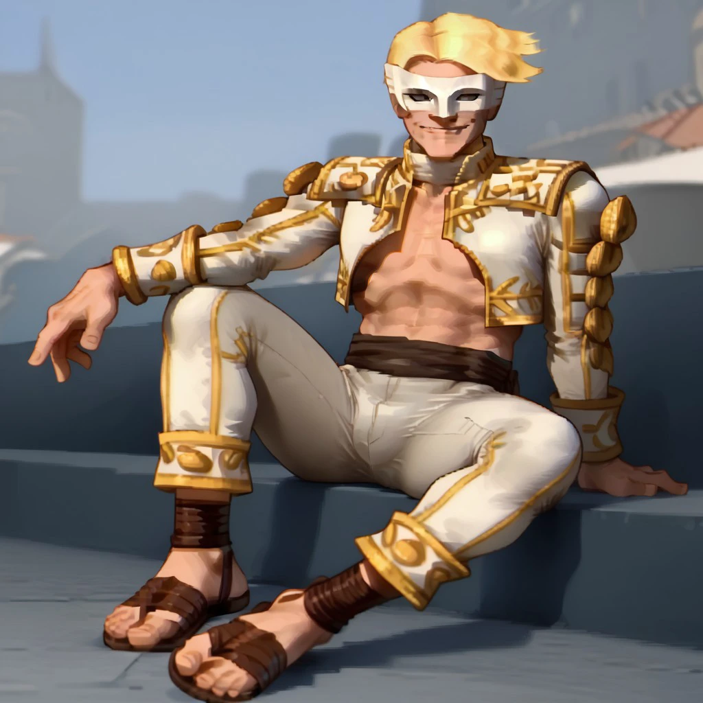 main tags to use : 1boy,solo,cropped jacket,open jacket,blonde hair,mask,pants,sandals