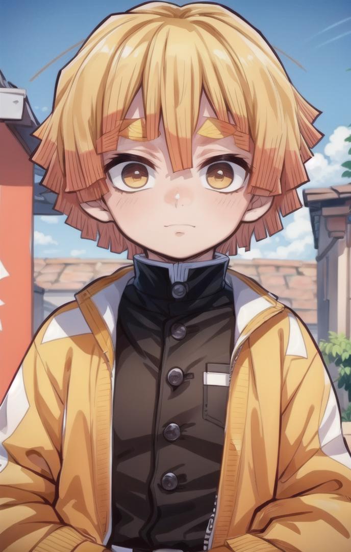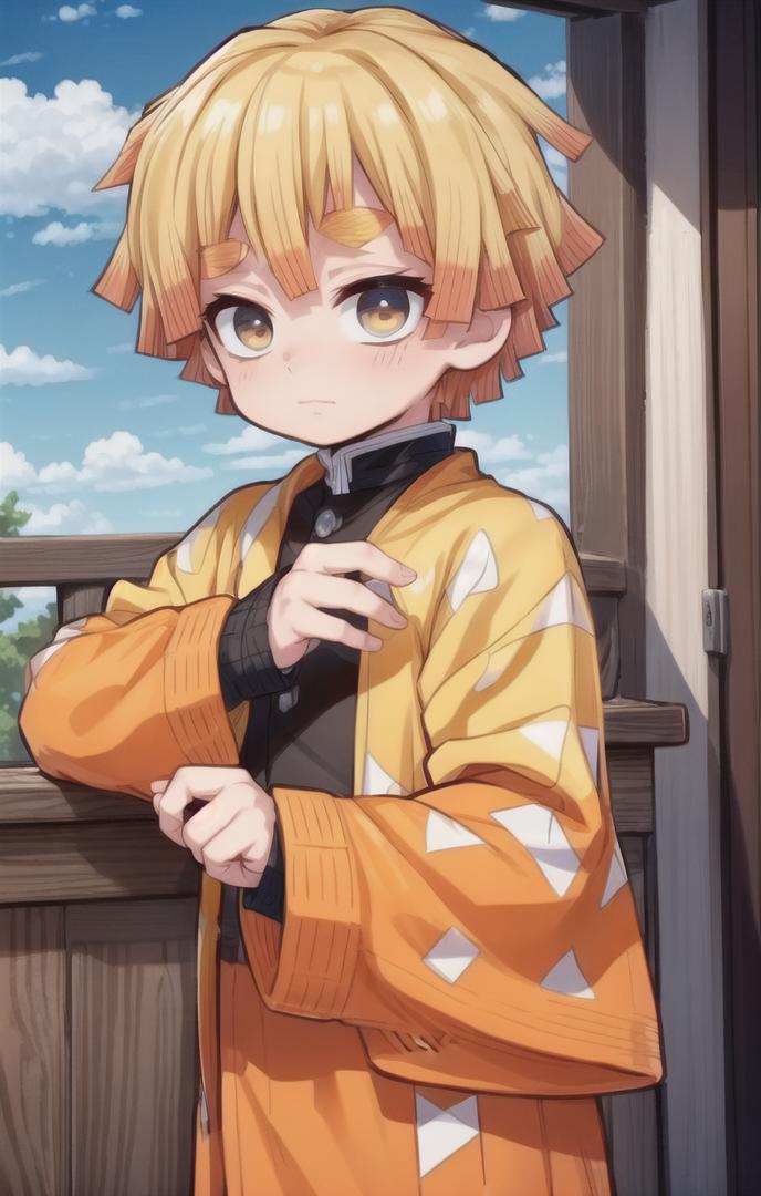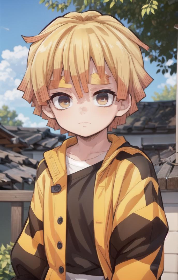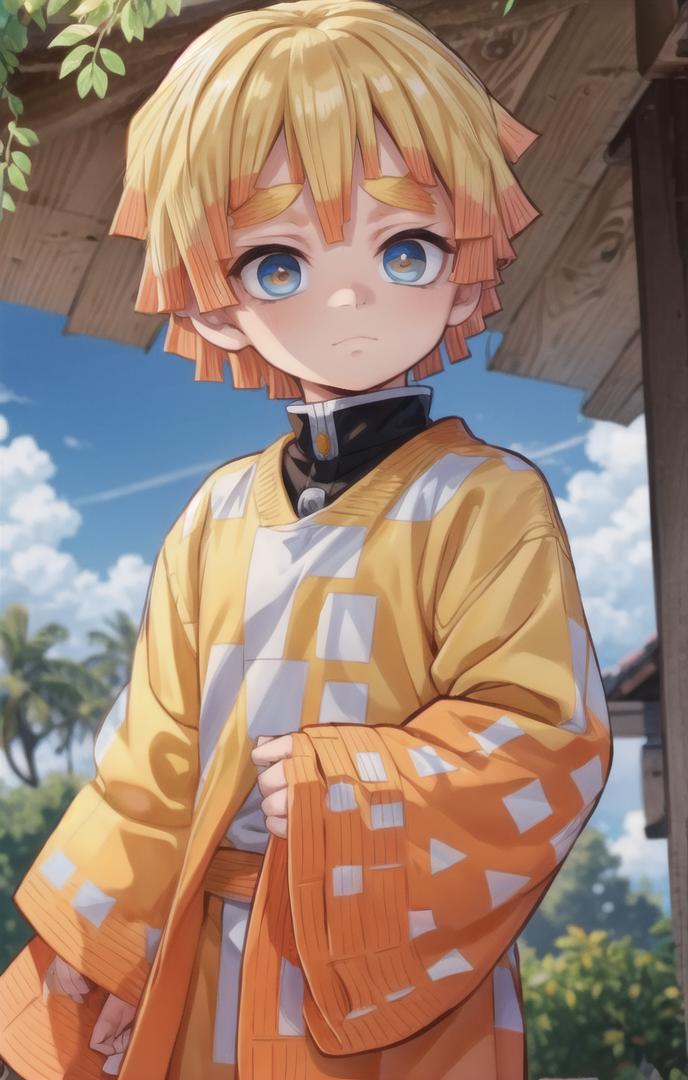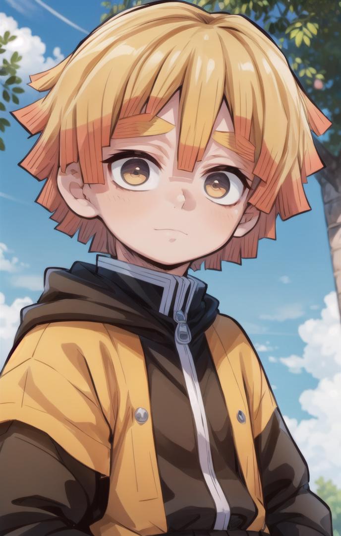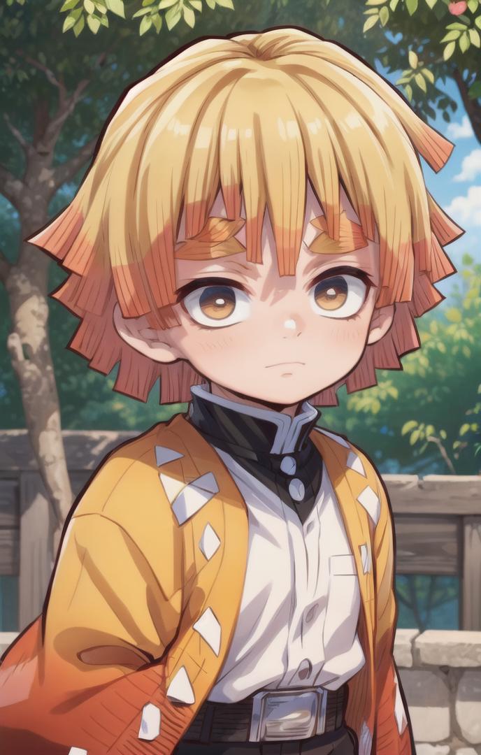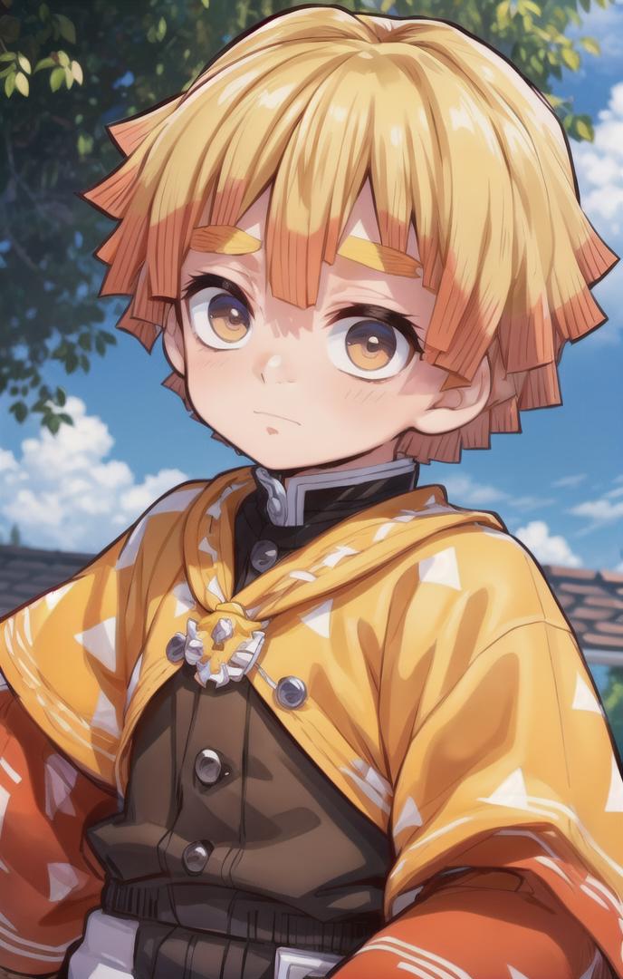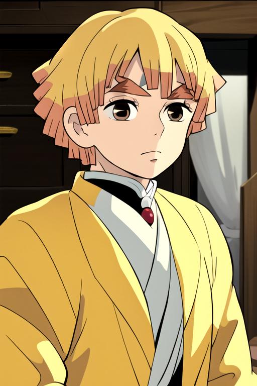 To prompt without uniform: agatsuma zenitsu, 1boy, blonde hair, thick eyebrows, brown eyes, bangs, short hair