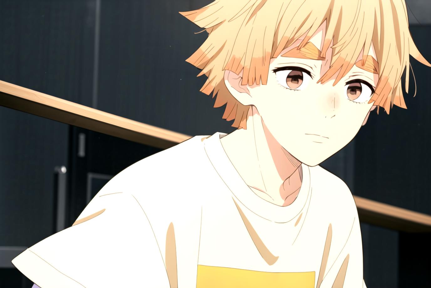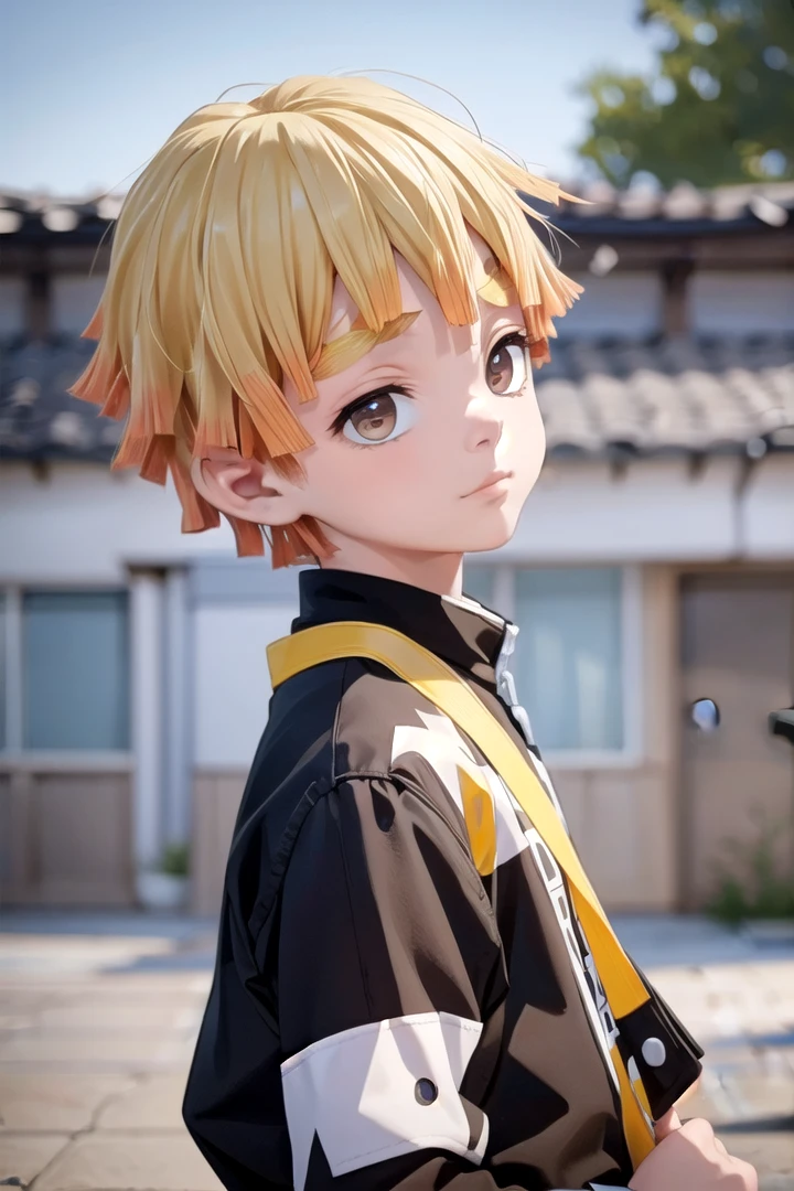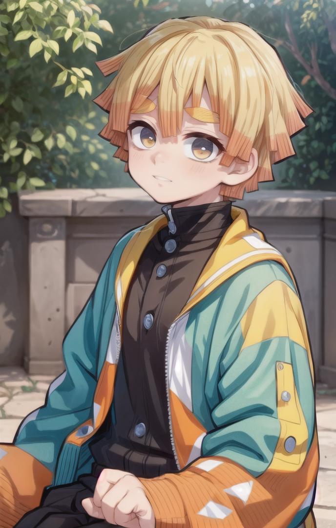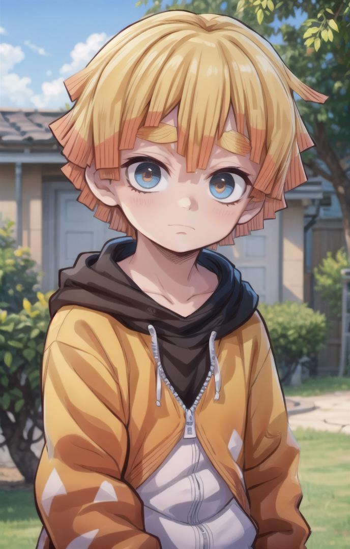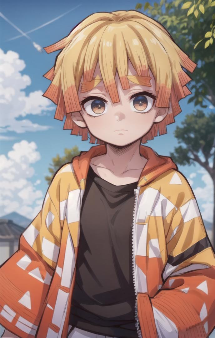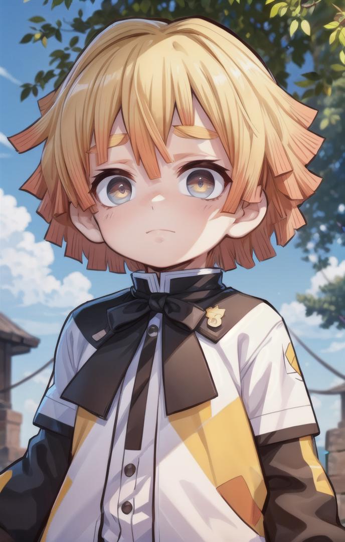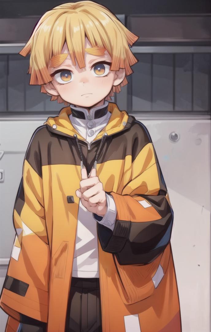 To prompt without uniform: agatsuma zenitsu, 1boy, blonde hair, thick eyebrows, brown eyes, bangs, short hair