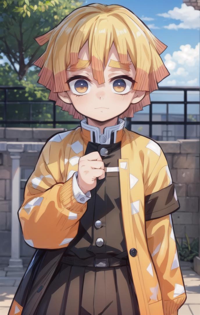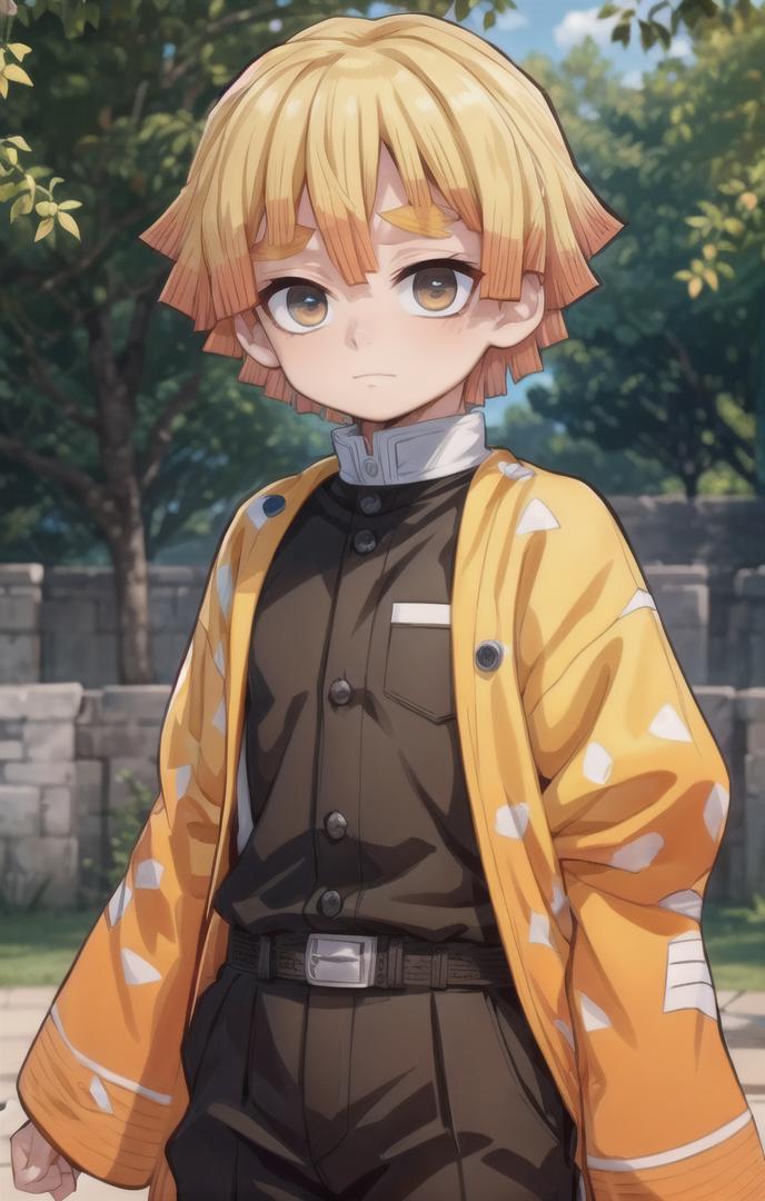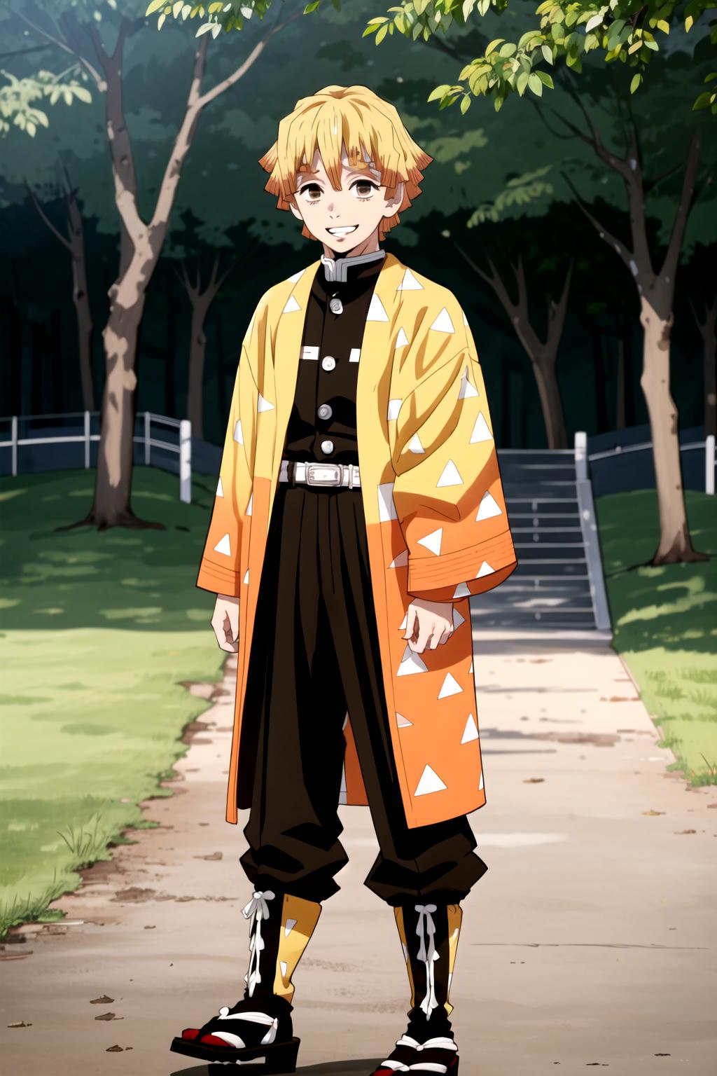 To prompt with demon slayer uniform: agatsuma zenitsu, 1boy, blonde hair, thick eyebrows, brown eyes, bangs, short hair, demon slayer uniform, japanese clothes, triangle print, haori, white belt, black jacket, black pants