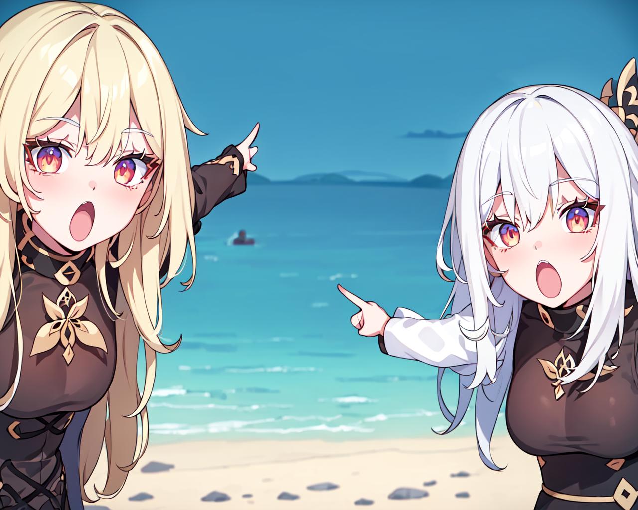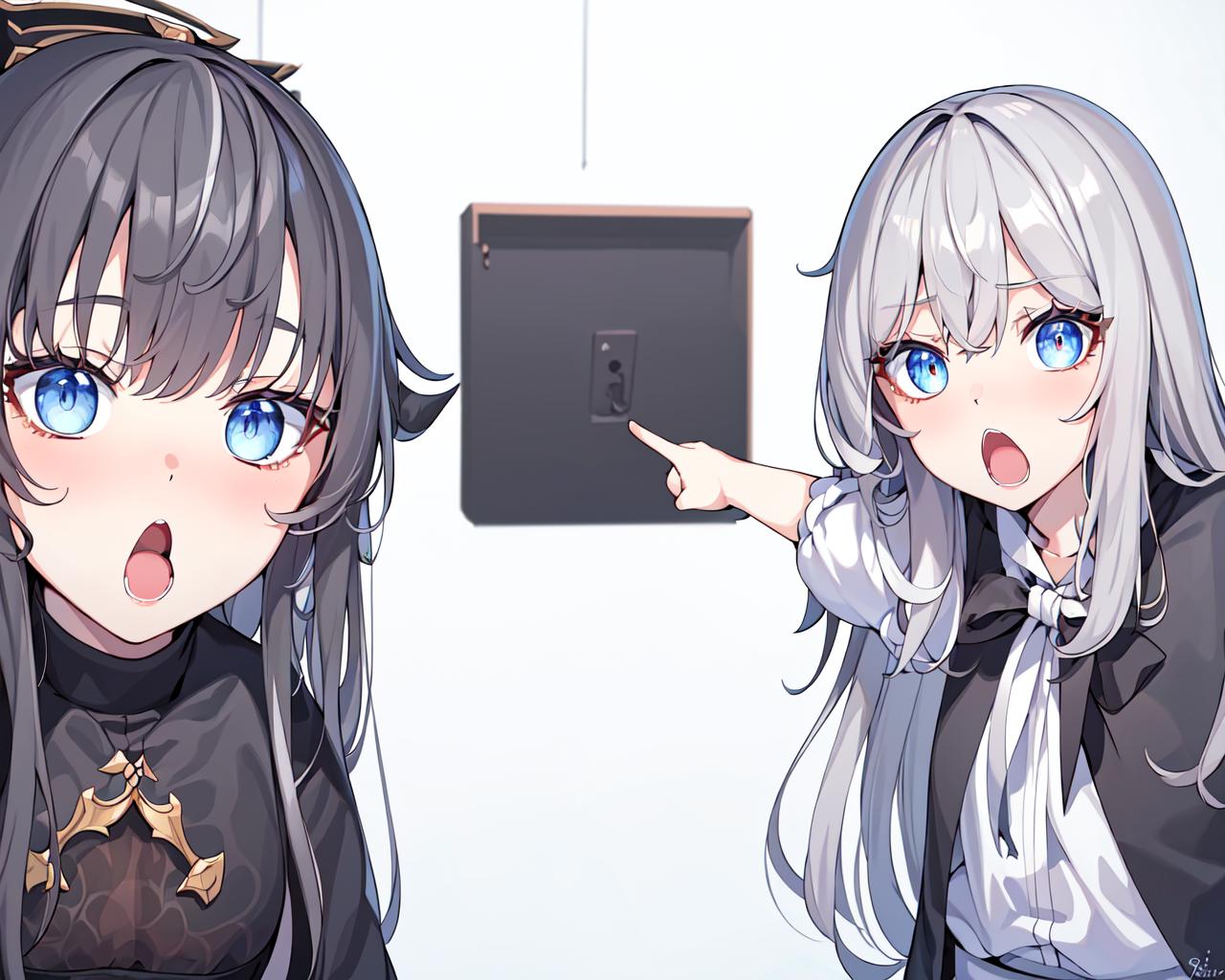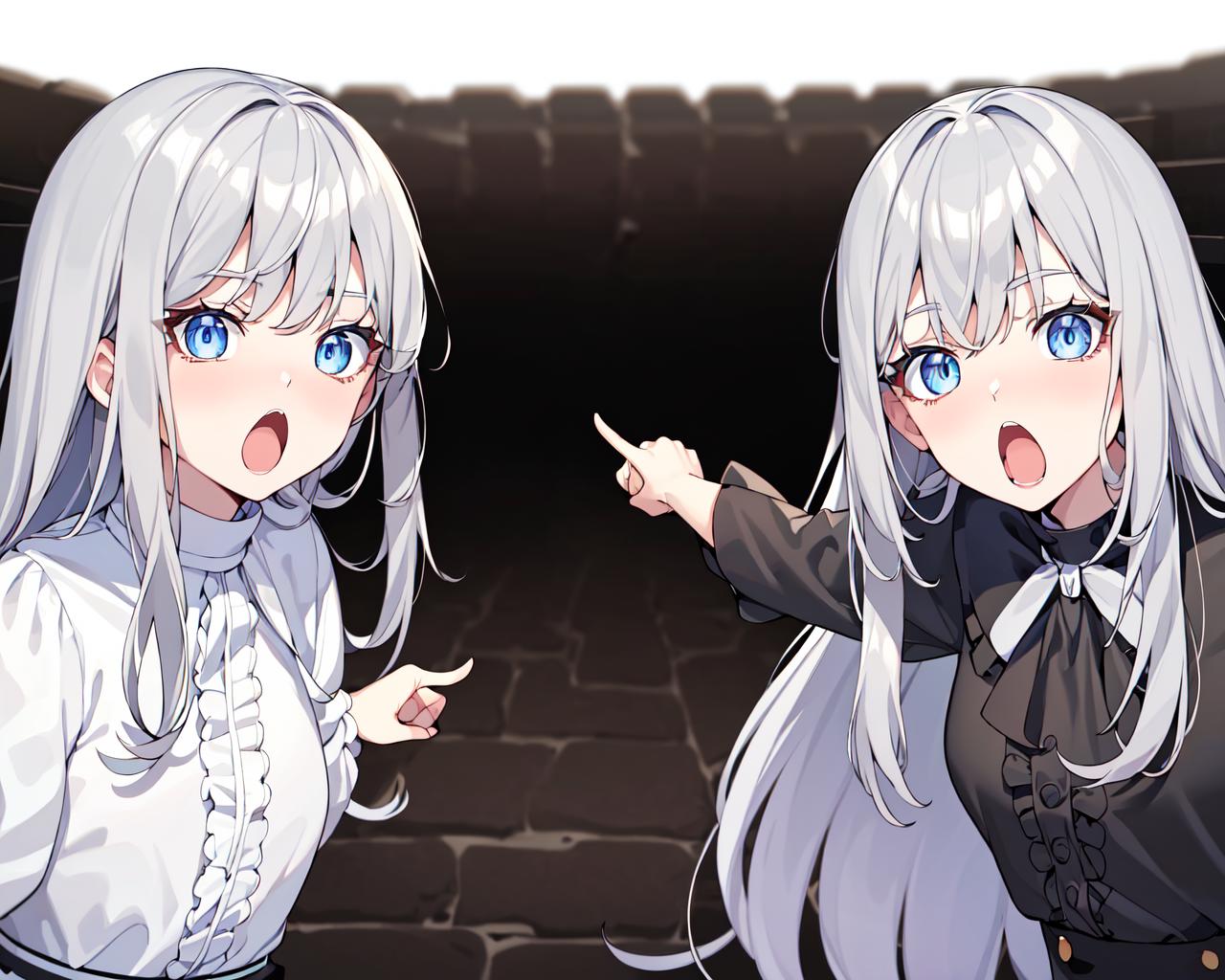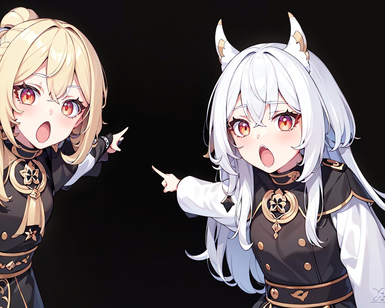recommend prompt: 2girls, duo, pointing, open mouth, :o